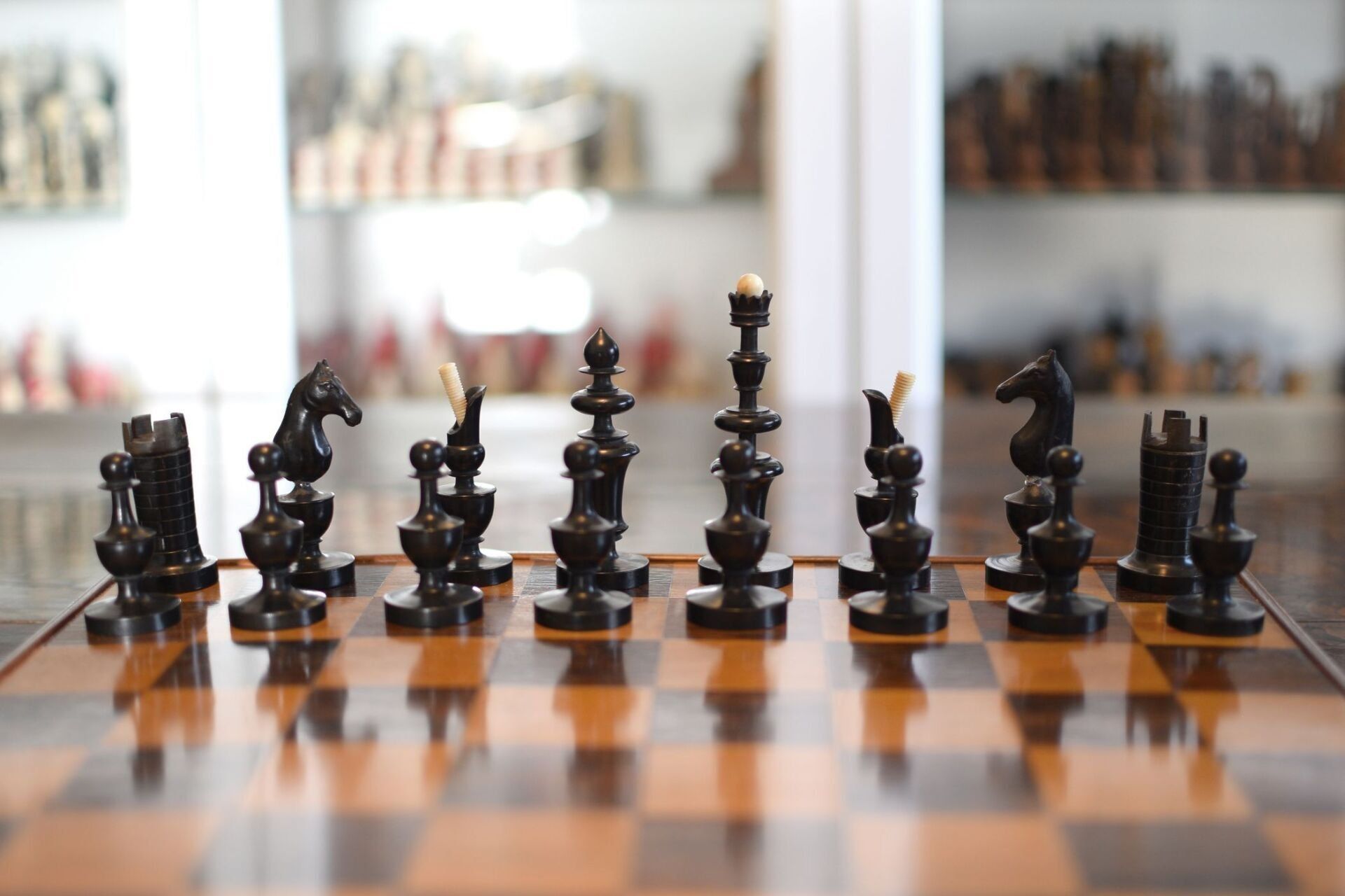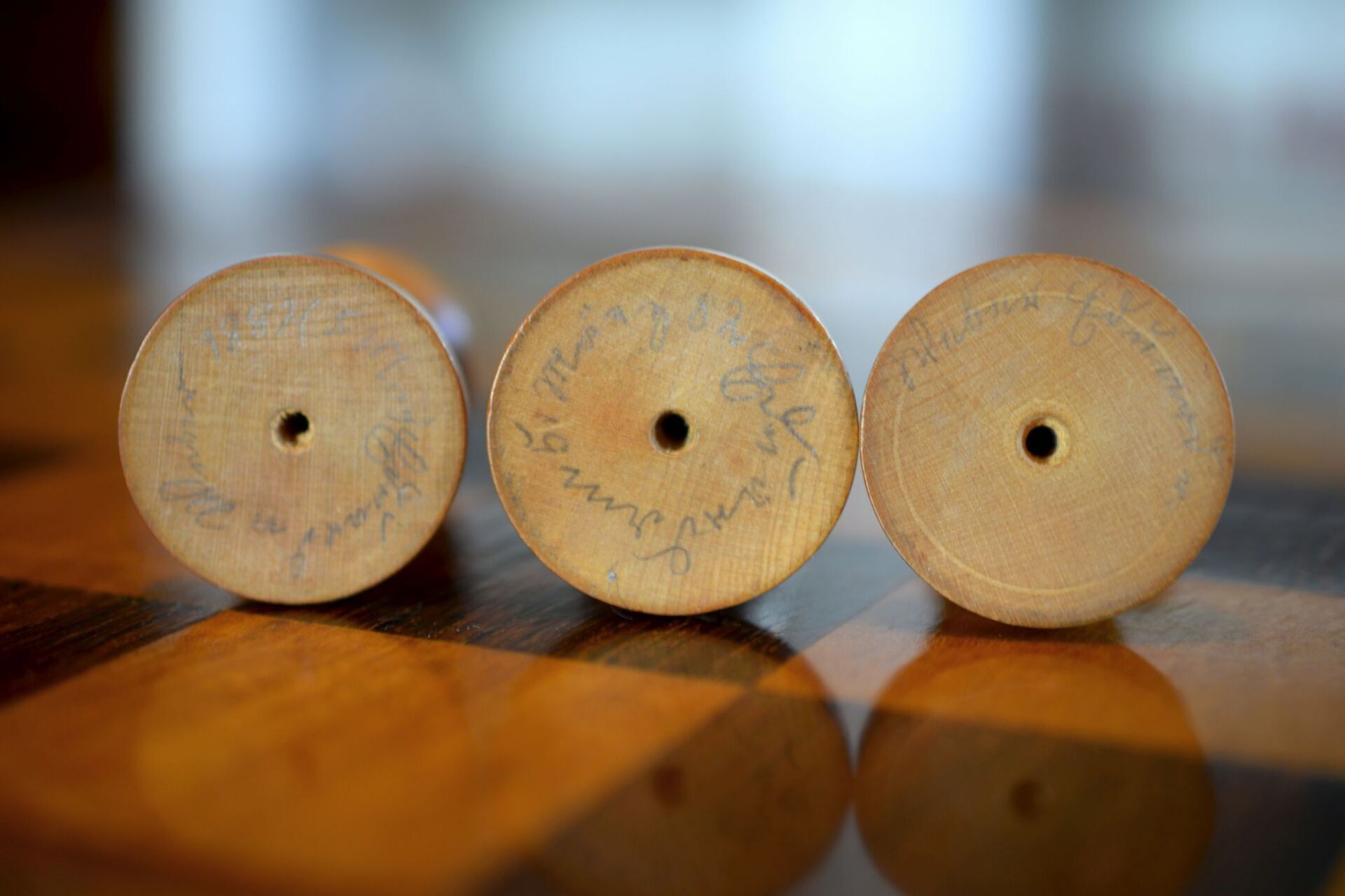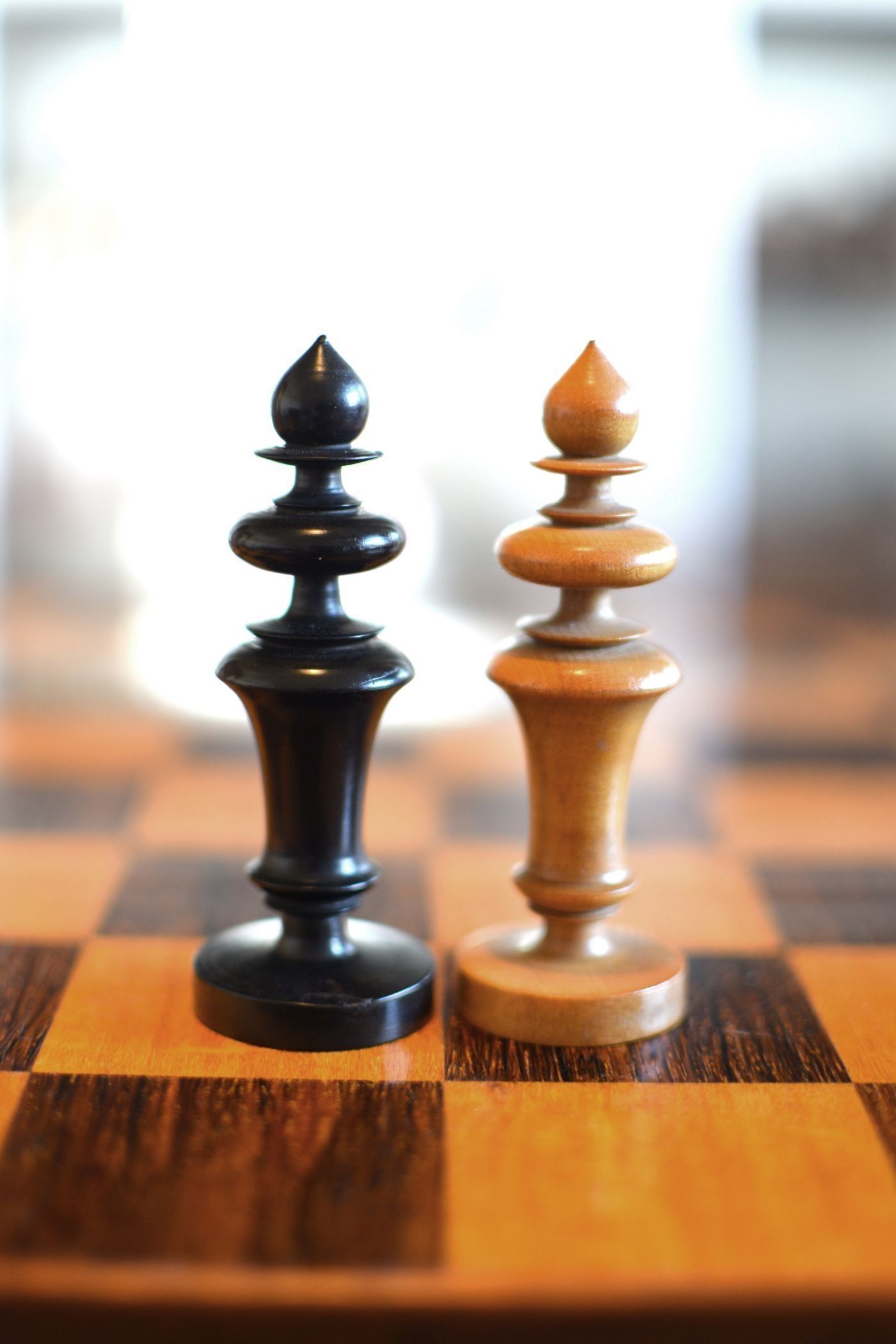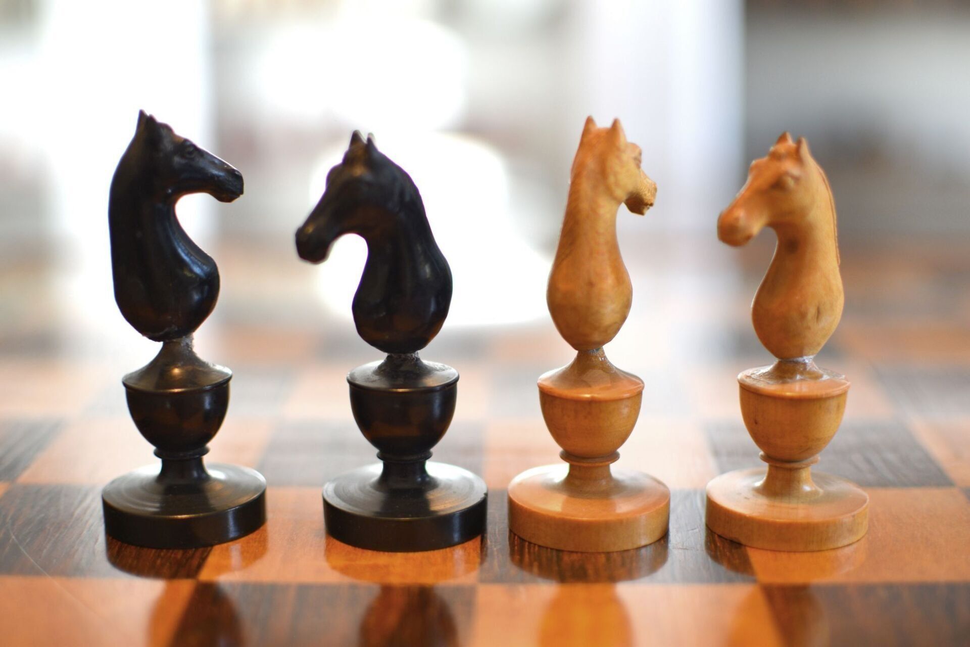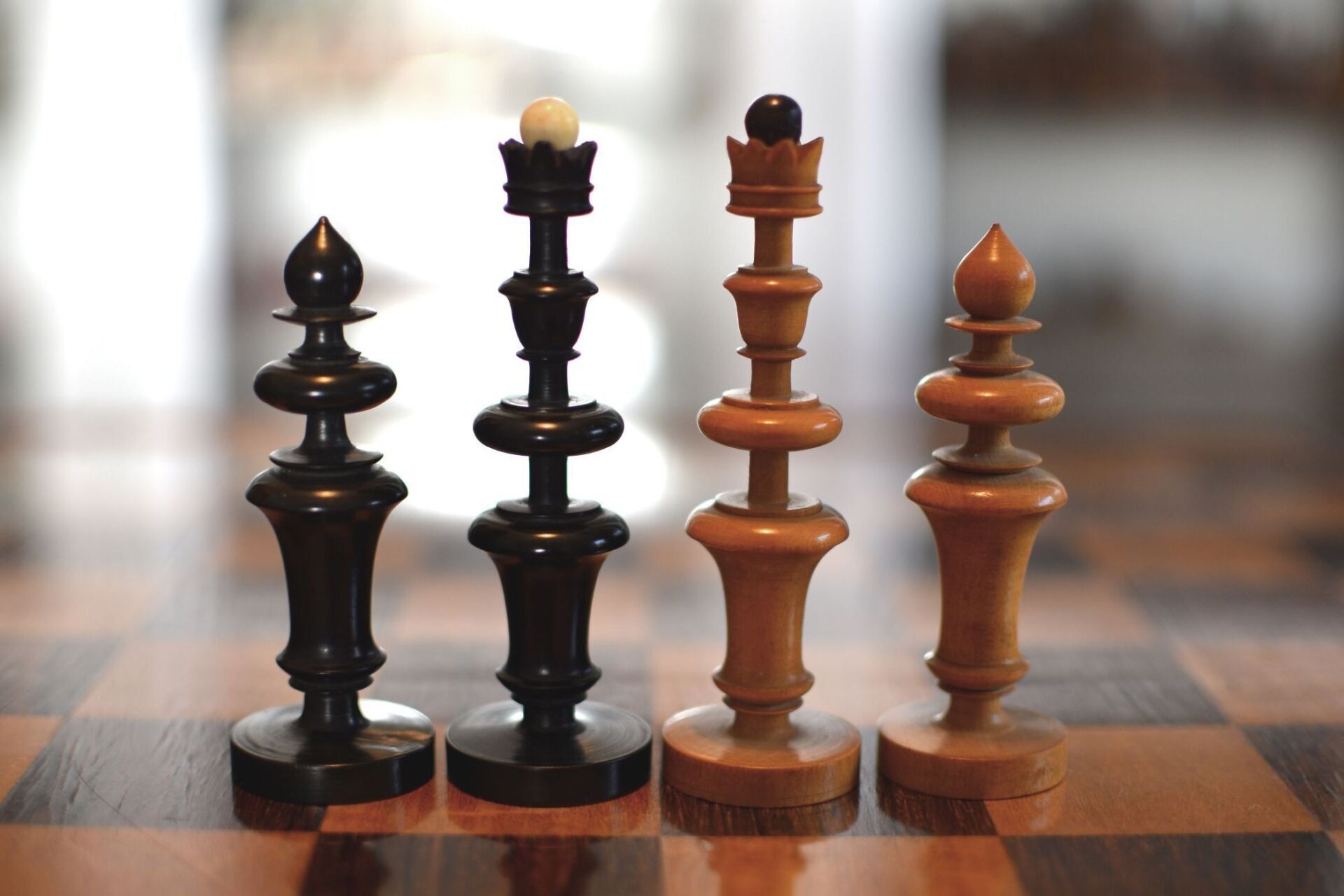 A wooden chess set, presumably from South Germany or Austria. The white pieces are made of boxwood, the black pieces of ebony. The king size is 97 mm (3.8"). The kings of unusual shape with slender shafts on an elongated baluster base topped with a circular crown and a ball finial in the opposite colour, on the white king made of wood dyed in dark brown, on the black king made of bone. The queens of smaller size and with a drop shaped head instead of a crown. The bishops show a very close resemblance with bishops from the early Biedermeier period, i.e. with lyre shaped heads and an elongated feather (in this also resembling feathered high hats common for certain officers in the 19th century military, see here). The knights as elegantly carved horses. The rooks as turrets with carved brickwork and four elongated crenellations. The pawns with baluster bases and a ball finial. All pieces on circular bases.