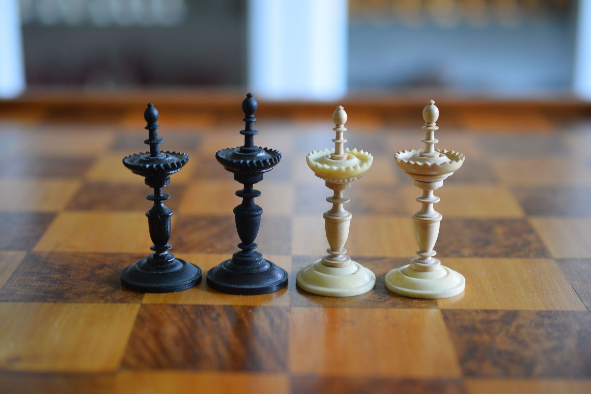 A rare mid-19th century German chess set of the "Selenus" type with a king size of 10.2 cm. The set is very unusual as this is a set which apparently was repaired at some stage. While I would normally stay away from sets with a large number of repairs, this one is different. The white side pieces are made of high quality bone (in fact, the auctioneer thought this to be ivory, but I am convinced it is bone), but some parts were replaced with wooden parts. These wooden parts were made in such a high quality themselves from what appears to be fruitwood that it would be difficult to distinguish them from the original were it not for the obvious differences in the material. The black side is turned from ebony. The kings with two pierced galleries, the queens with one.