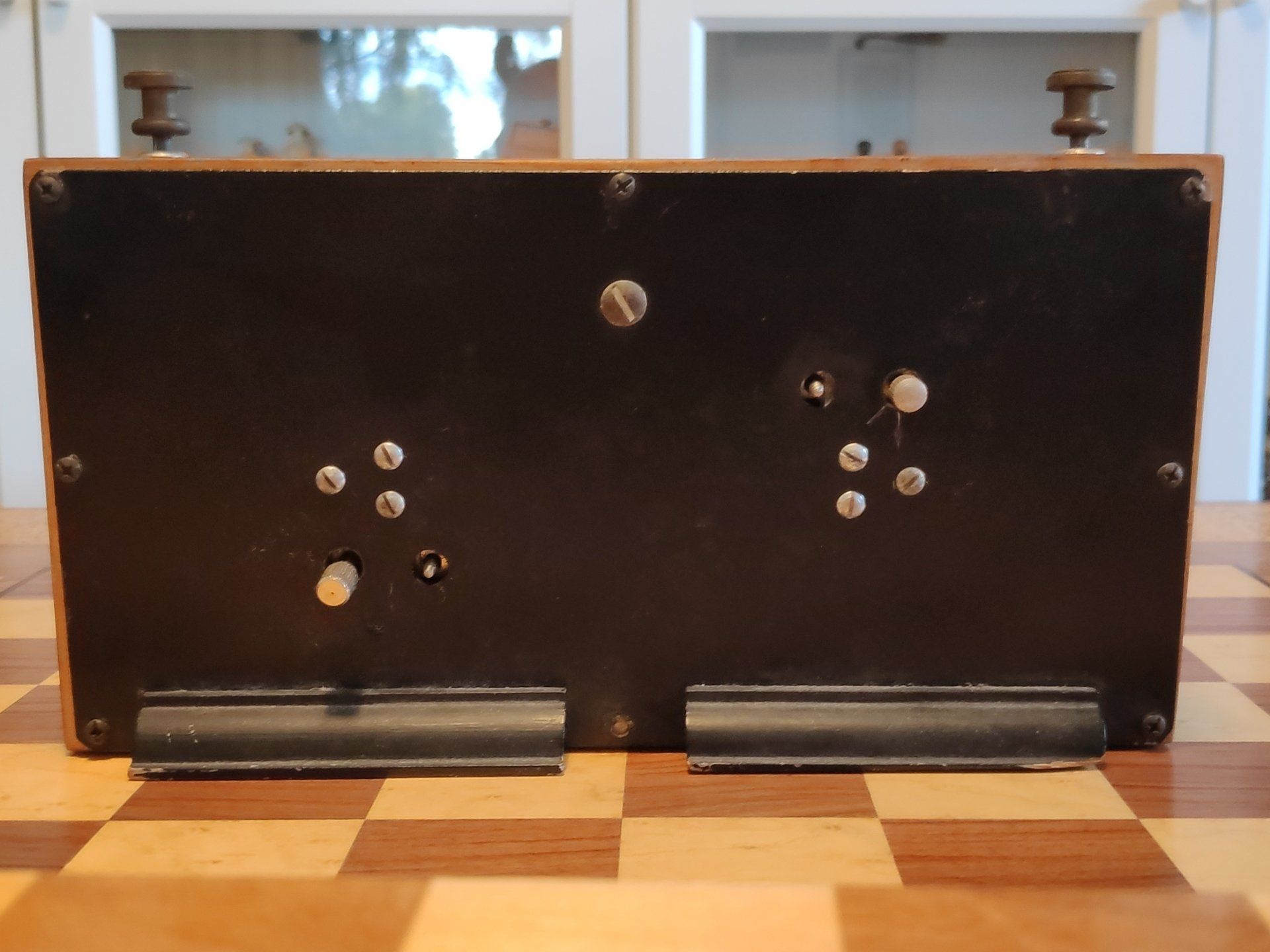 Here is a King of Aires chess clock introduced in Argentina probably in the 1970's or 1980's. The clock is rather tall. In order to provide for stability despite its height, the base is broadened and the clock is lead weighted inside to provide for a low center.