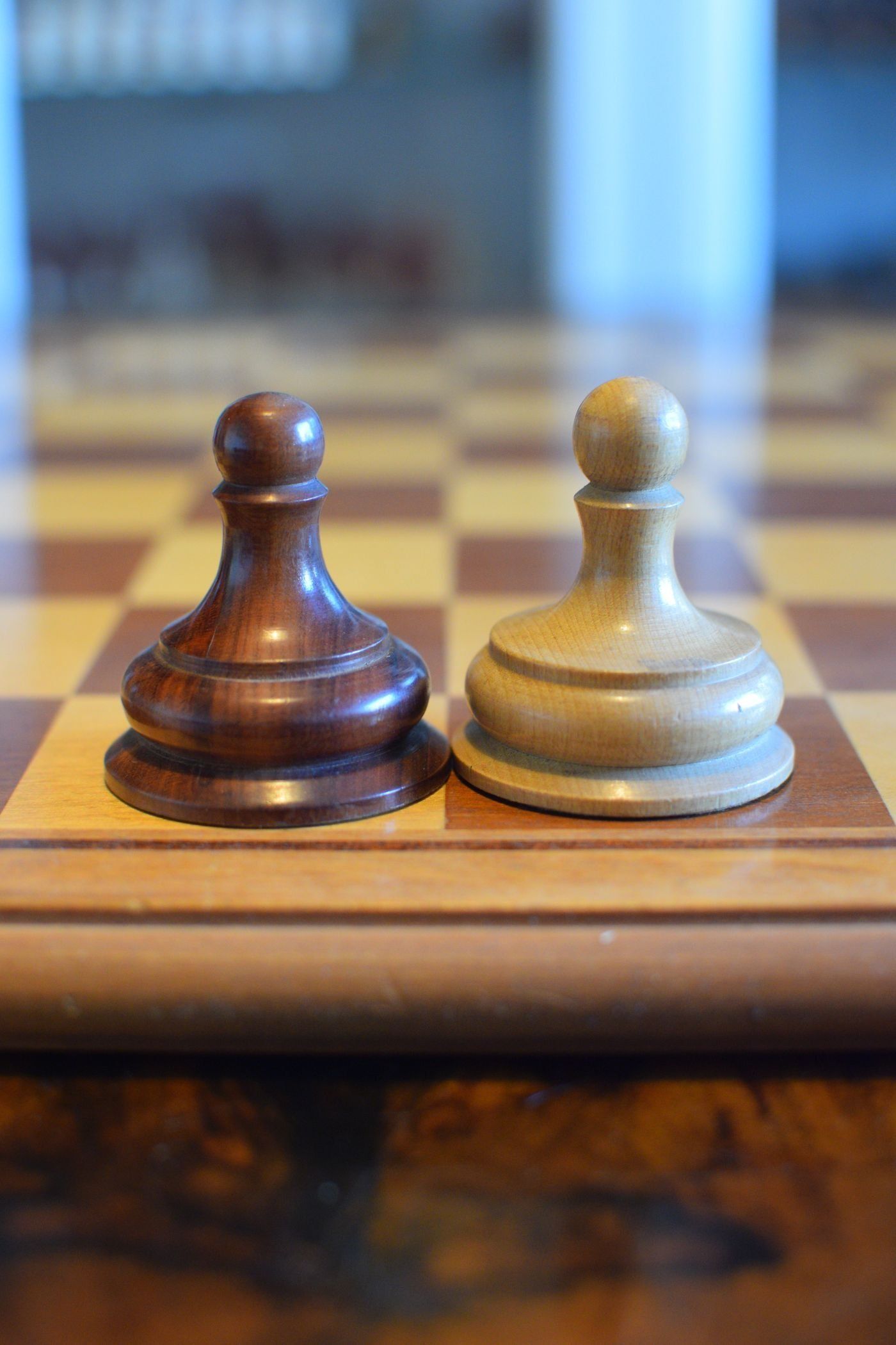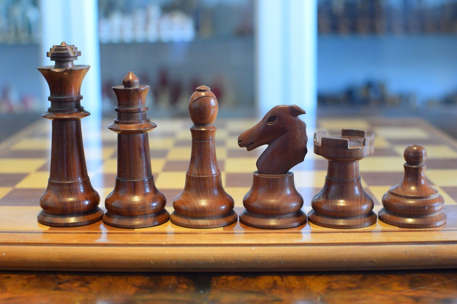 The kings have a height of 11 cm and do not have a cross finial but rather some tiered turned disks resembling a blossom. Queens with a drop finial. The rooks with overhanging crenellated top resembling those typical for chess sets from South Germany or Austria. The knights cut from flat wood in the shape of horses' heads. The bishops with thin mitre cuts. The pawns with unusually wide bases, which make the pawns almost as tall as wide (39mm diameter, 44 mm height), thus slightly reminding in shape of the pawns in German Knubbel sets.