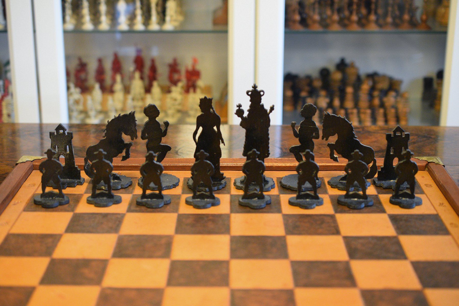 This is a somewhat unusual chess set, in which the pieces are silhouettes of a medieval court. The pieces are fretworked from plywood. On the underside are pale green thin felts similar to those used in southern Germany and Austria in the late 19th or early 20th century. The kings have a height of 12 cm and are depicted with sceptre and orb. The queens are court ladies with long braids. The bishops are depicted as runners, which indicates a German origin, as this is the literal meaning of the term "Läufer" used in German. The knights as rearing horses. The rooks are relatively small and depicted as a silhouette of a fortified tower. The type of sawing resembles the handicrafts from the Ore Mountain and Nuremberg region, the German strongholds of toy production in the late 19th century. Similar patterns were used, for example, for the production of wooden Christmas ornaments. A most unusual and rare type of chess set.