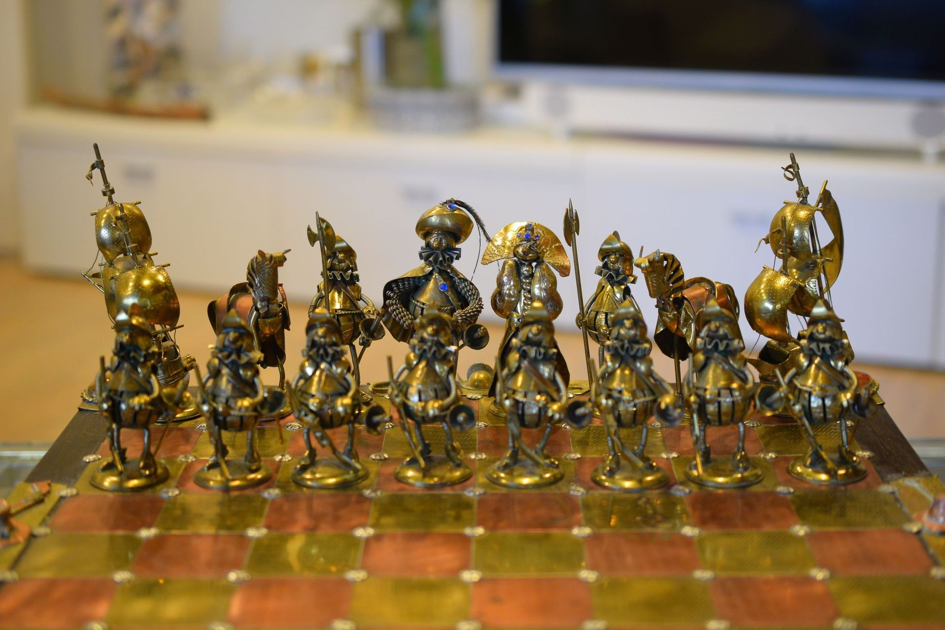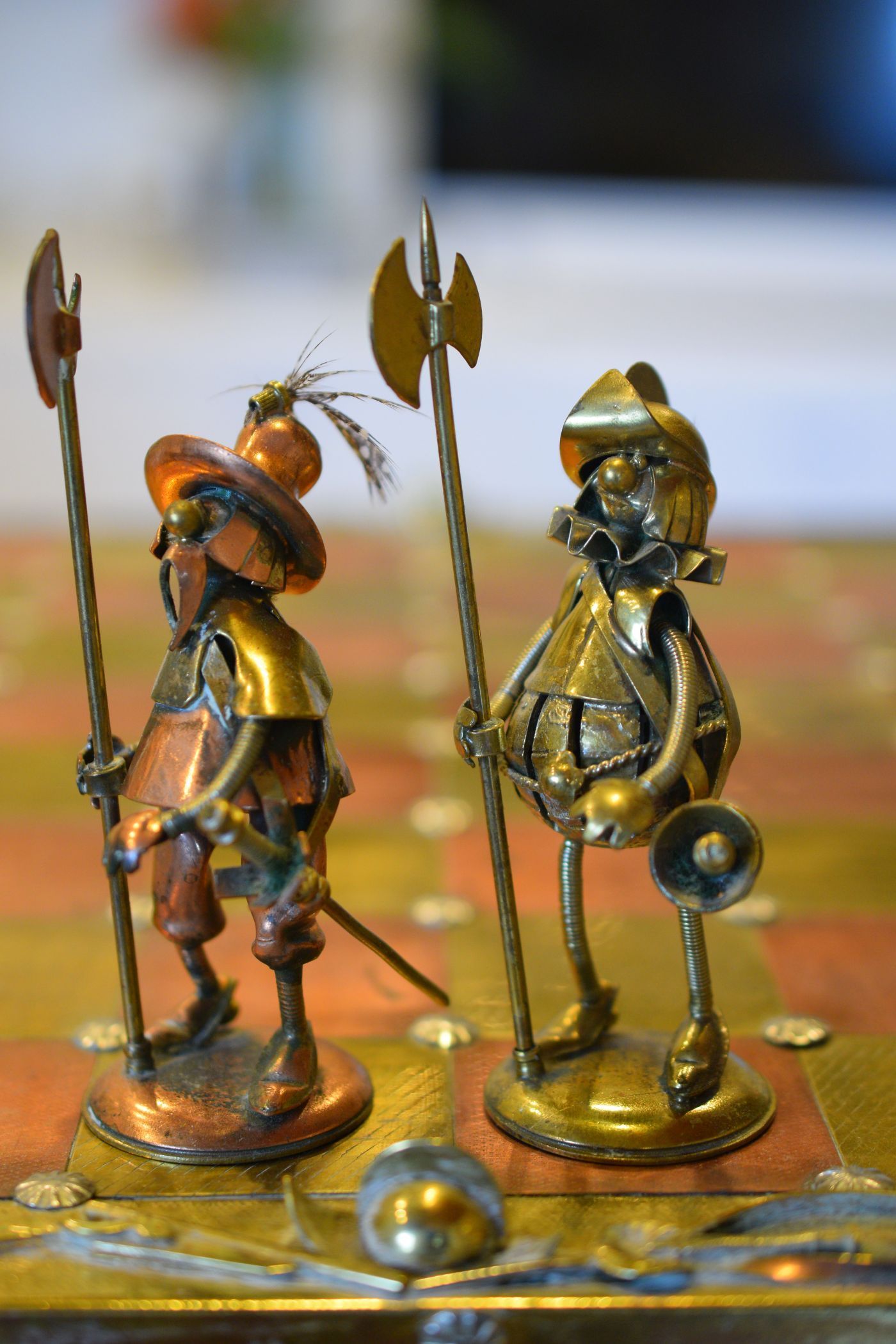 I was lucky enough to get hold of one of these rare caricature like chess sets made by Magda and Andrzej Nowakowscy from Warsaw, Poland. It is a so called "Armada Set", the design of which was probably inspired by the destruction of the Spanish Armada by the English in 1588. The pieces were cut from brass and copper sheet and then soldered with decorations including coloured stones and real bird feathers. The kings are 10cm, the pawns 8.6cm. The brass side represents the Spanish Armada, with the king and queen in opulent costume, Spanish galleys as rooks and pawns with morrión helmets. The copper side represents the English fleet with frigates as rooks. The bishops on both sides are designed as soldiers with halberds and rapiers. The attention to detail is amazing. The ships used as rooks, for example, have inflated sails, ropes and little cannons on both sides, the helmets of the pawns are decorated with real bird feathers etc. The set came with its original board box with brass and copper squares, amber decorations on each corner, red velvet interior felting to protect the pieces and a crest shaped metal sign on the inside of the lid with the makers' names. Also, the bottom of each piece is engraved with the names of Magda and Andrzej Nowakowscy.