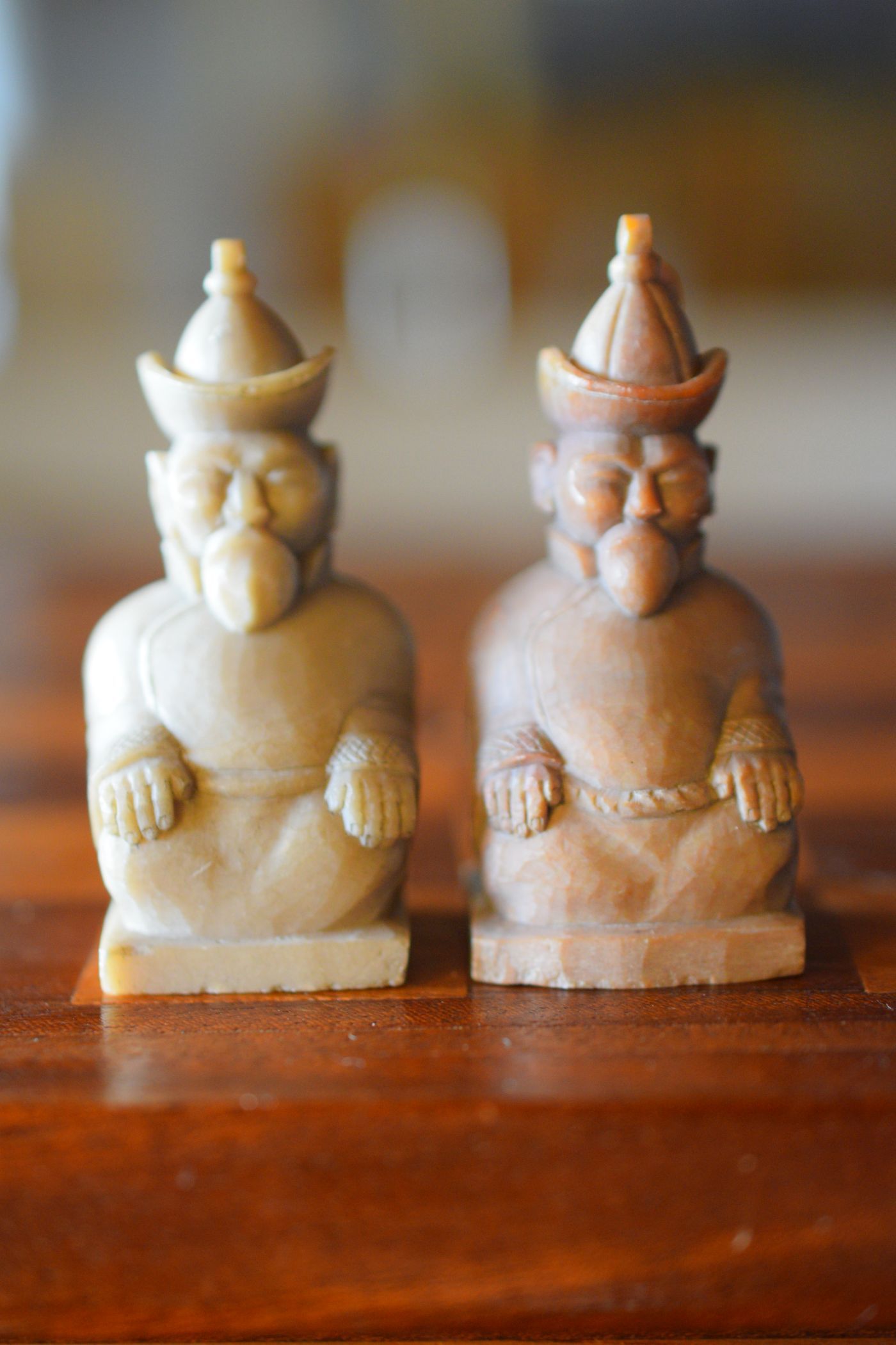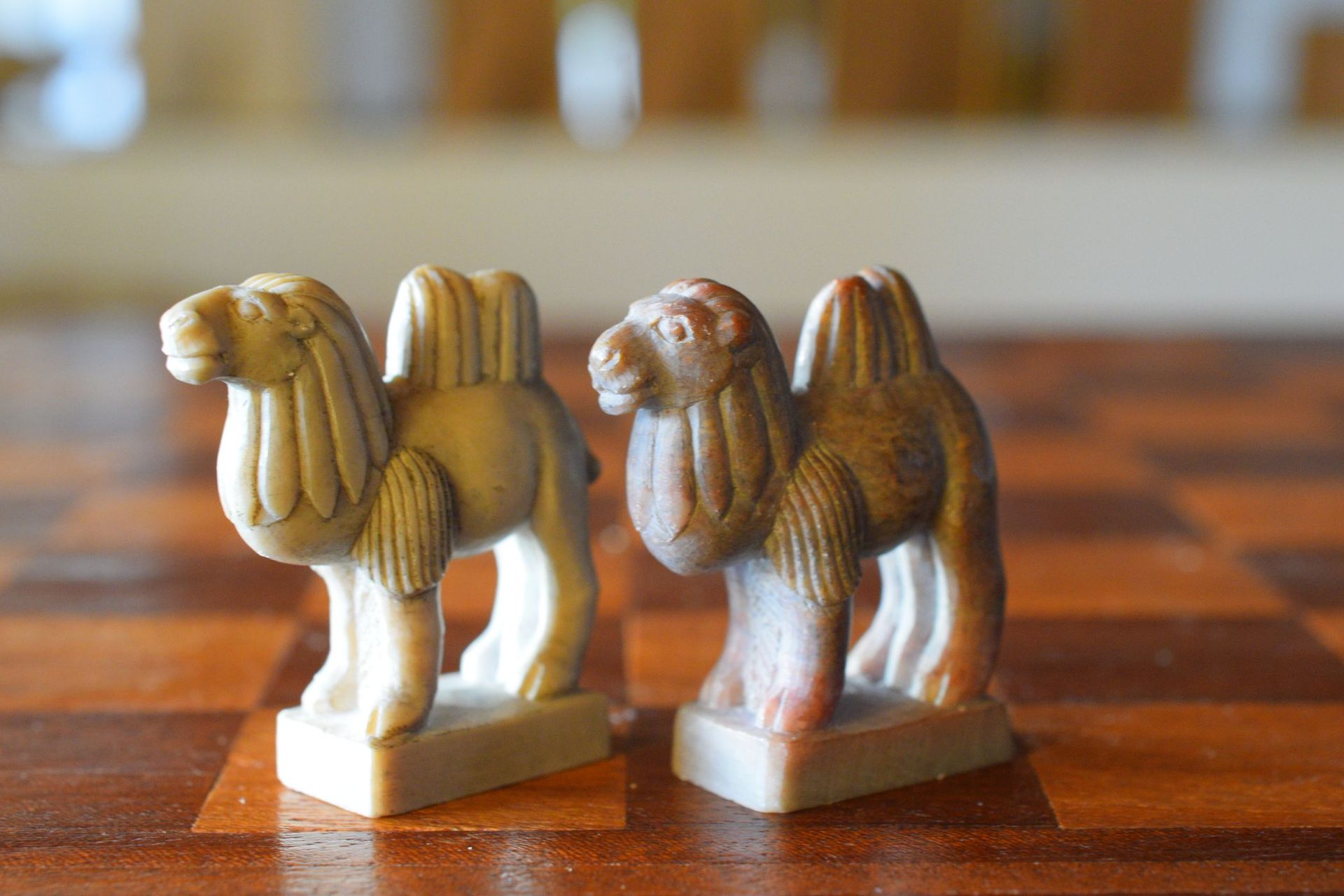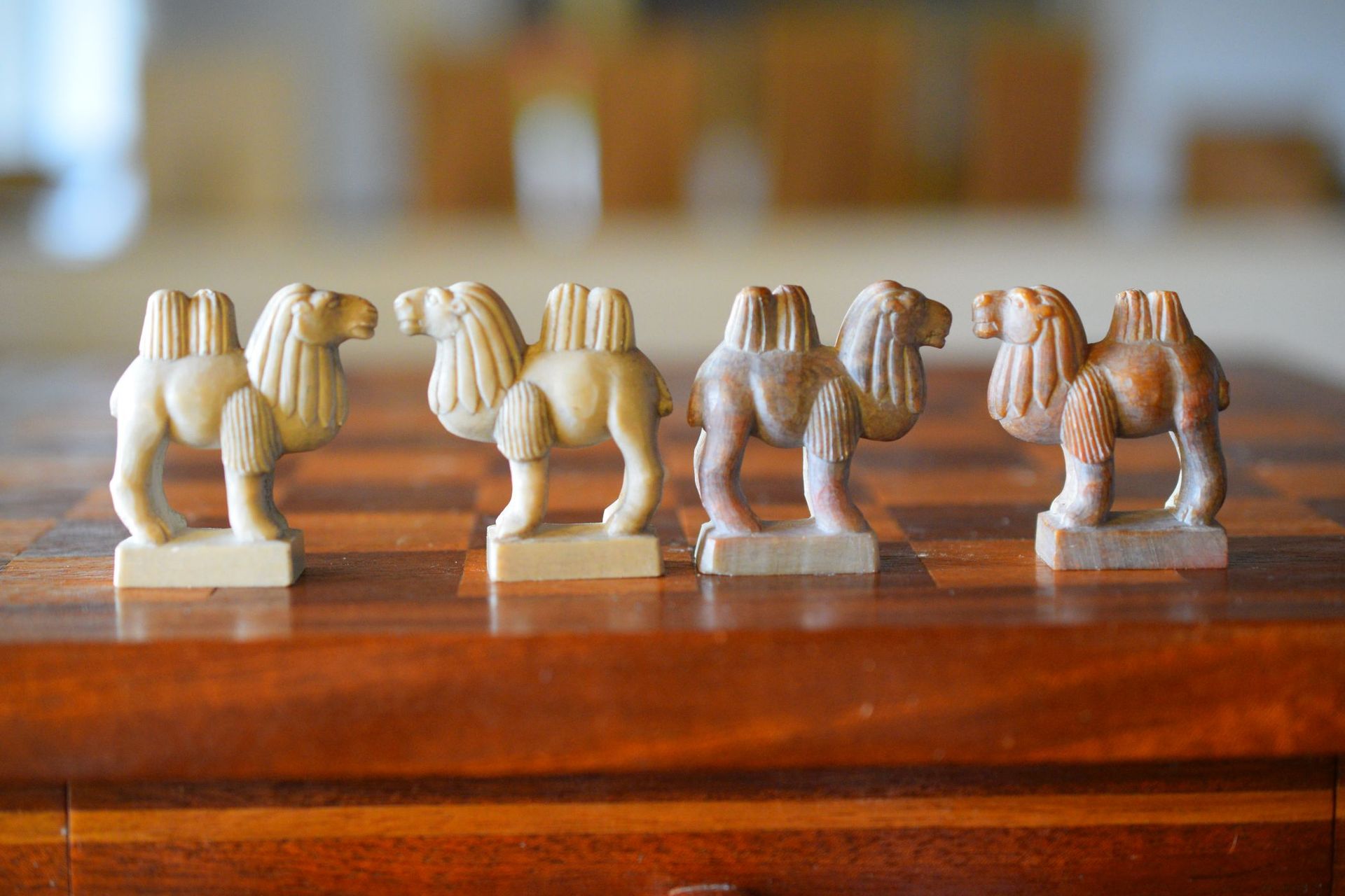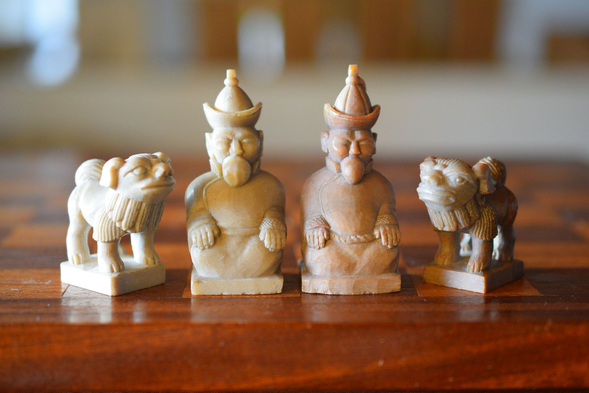 Here is another set that belongs to the category of Mongolian Shatar sets. In this case, it comes from northern Mongolia or southern Siberia, more precisely the Russian Republic of Tuva. The set has a king size of 6 cm and is carved from soapstone in extraordinary quality for a set of this small size. Gareth Williams shows a very similar set in his book ‘Master Pieces’ on pages 110/111, which he describes as follows: ‘Carved from soapstone, the set represents the Soyot tradition with a king shown as a “noyion” or master of the house in the costume of a wealthy Utyankh. The queen is shown as a sacred lion of Chinese legend, the camel and horse are constant features of a Mongolian set, the rook is shown as a symbol of movement, the pawns smaller carvings of the sacred lion.’ The camels used as bishops in this type of sets are always the two-humped Bactrian or Mongolian camels with distinctive fur. The symbols used as rooks in this set are extremely unusual and difficult to describe. As the rooks in the Mongolian chess tradition almost always symbolise movement (e.g. in the form of carts or even trucks), this particular symbol is probably also linked to this notion.