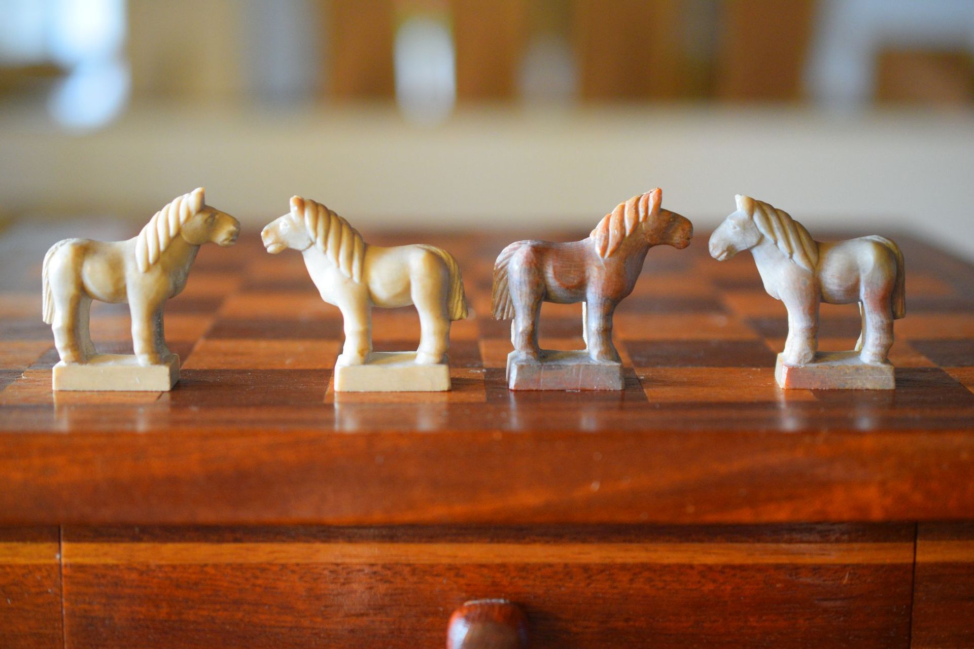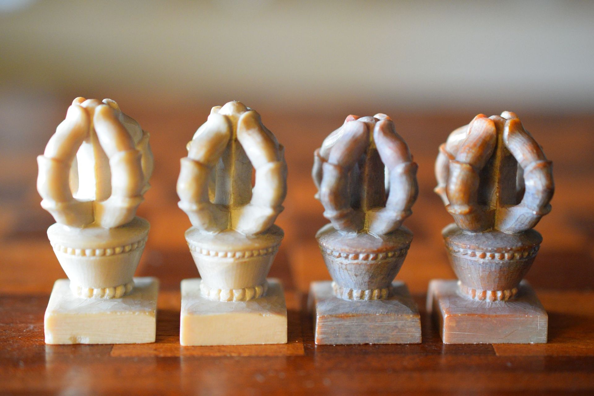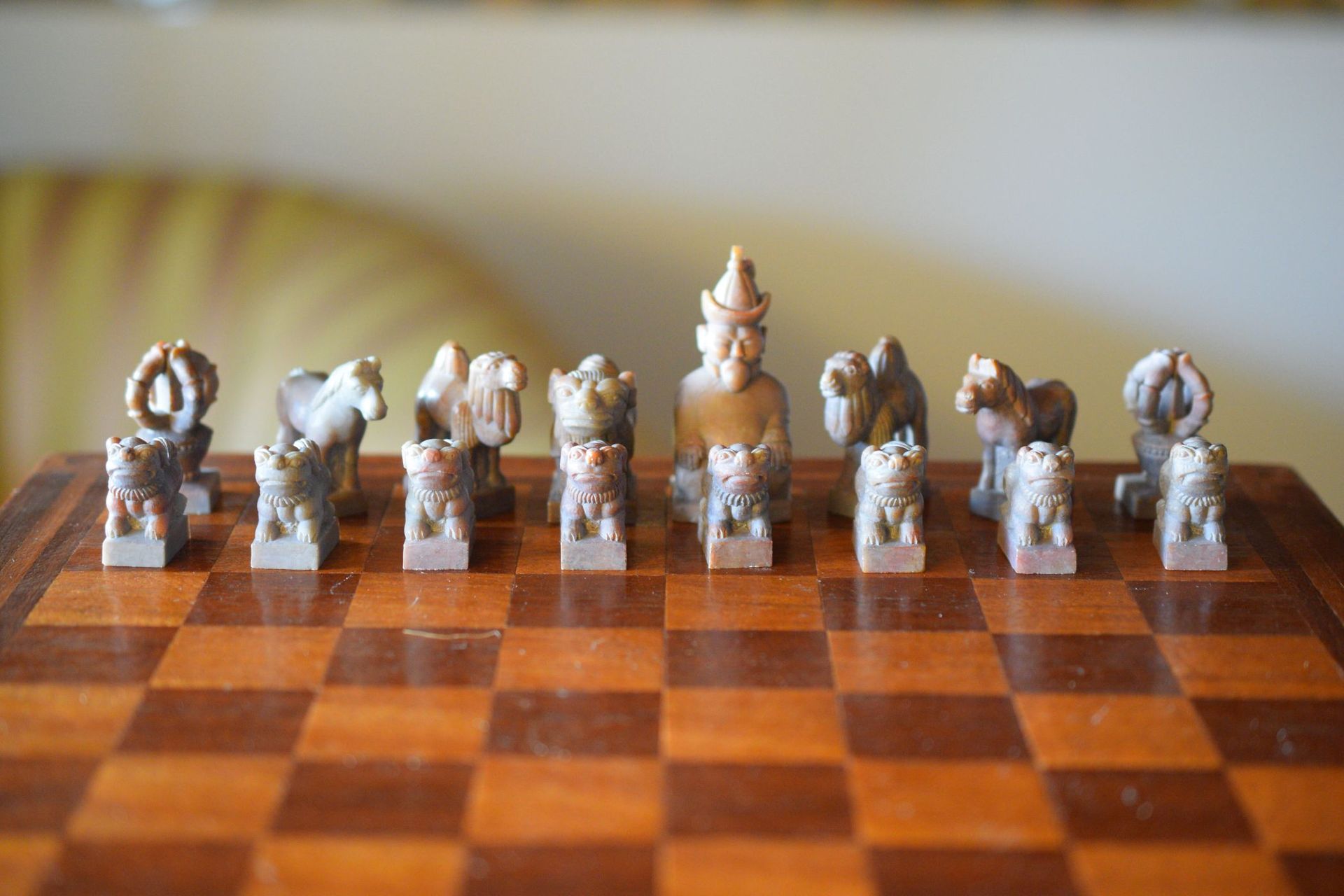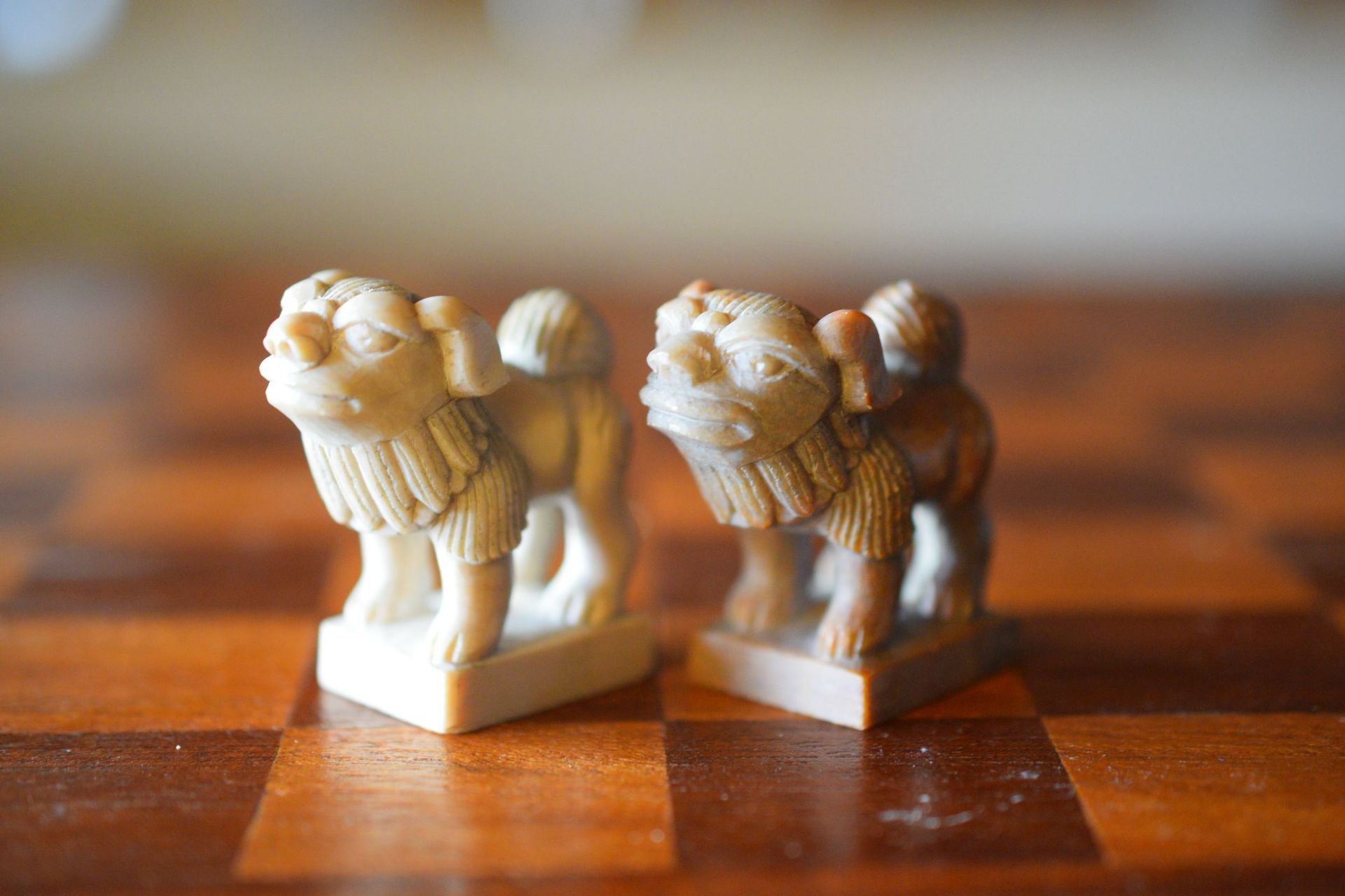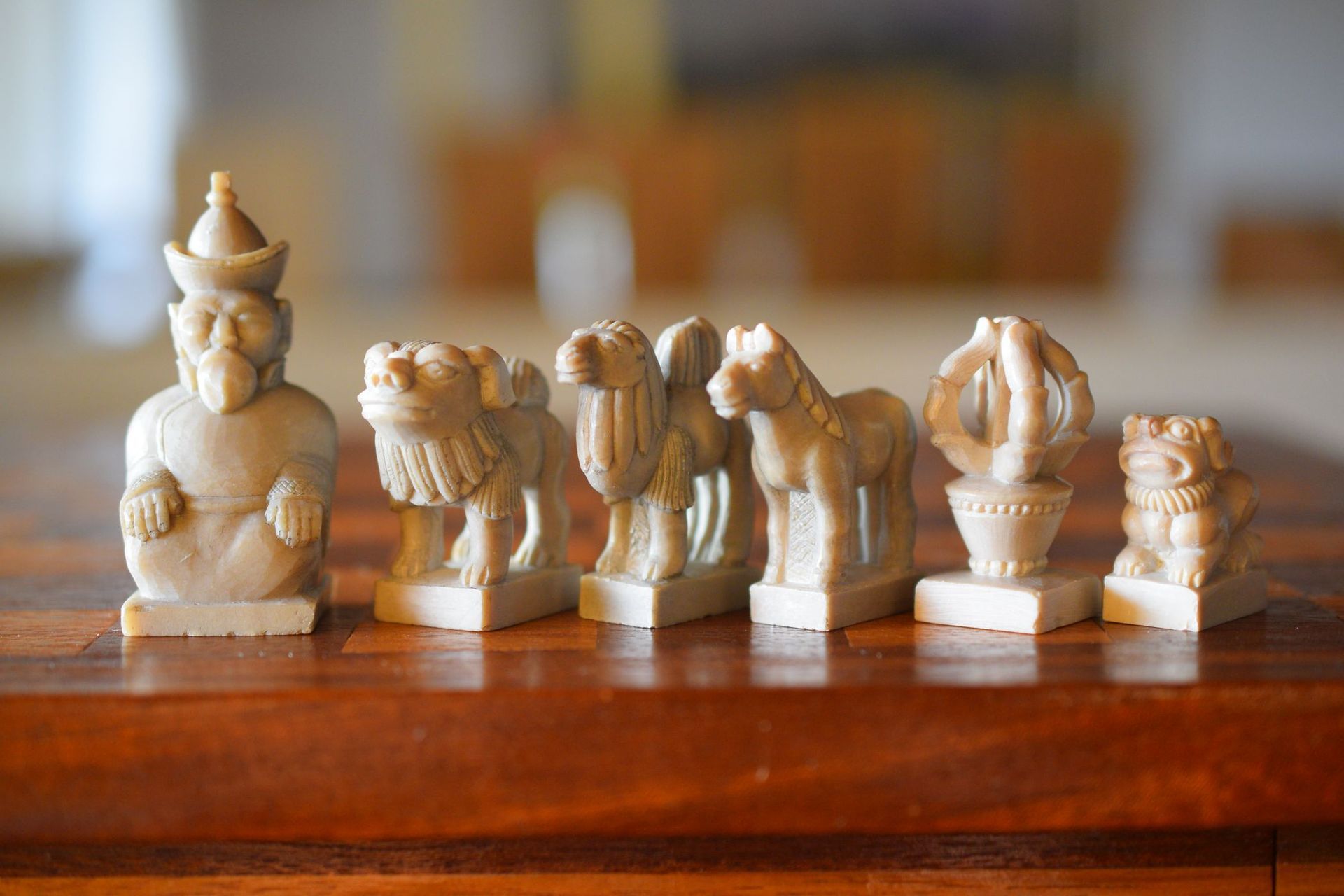 Here is another set that belongs to the category of Mongolian Shatar sets. In this case, it comes from northern Mongolia or southern Siberia, more precisely the Russian Republic of Tuva. The set has a king size of 6 cm and is carved from soapstone in extraordinary quality for a set of this small size. Gareth Williams shows a very similar set in his book ‘Master Pieces’ on pages 110/111, which he describes as follows: ‘Carved from soapstone, the set represents the Soyot tradition with a king shown as a “noyion” or master of the house in the costume of a wealthy Utyankh. The queen is shown as a sacred lion of Chinese legend, the camel and horse are constant features of a Mongolian set, the rook is shown as a symbol of movement, the pawns smaller carvings of the sacred lion.’ The camels used as bishops in this type of sets are always the two-humped Bactrian or Mongolian camels with distinctive fur. The symbols used as rooks in this set are extremely unusual and difficult to describe. As the rooks in the Mongolian chess tradition almost always symbolise movement (e.g. in the form of carts or even trucks), this particular symbol is probably also linked to this notion.