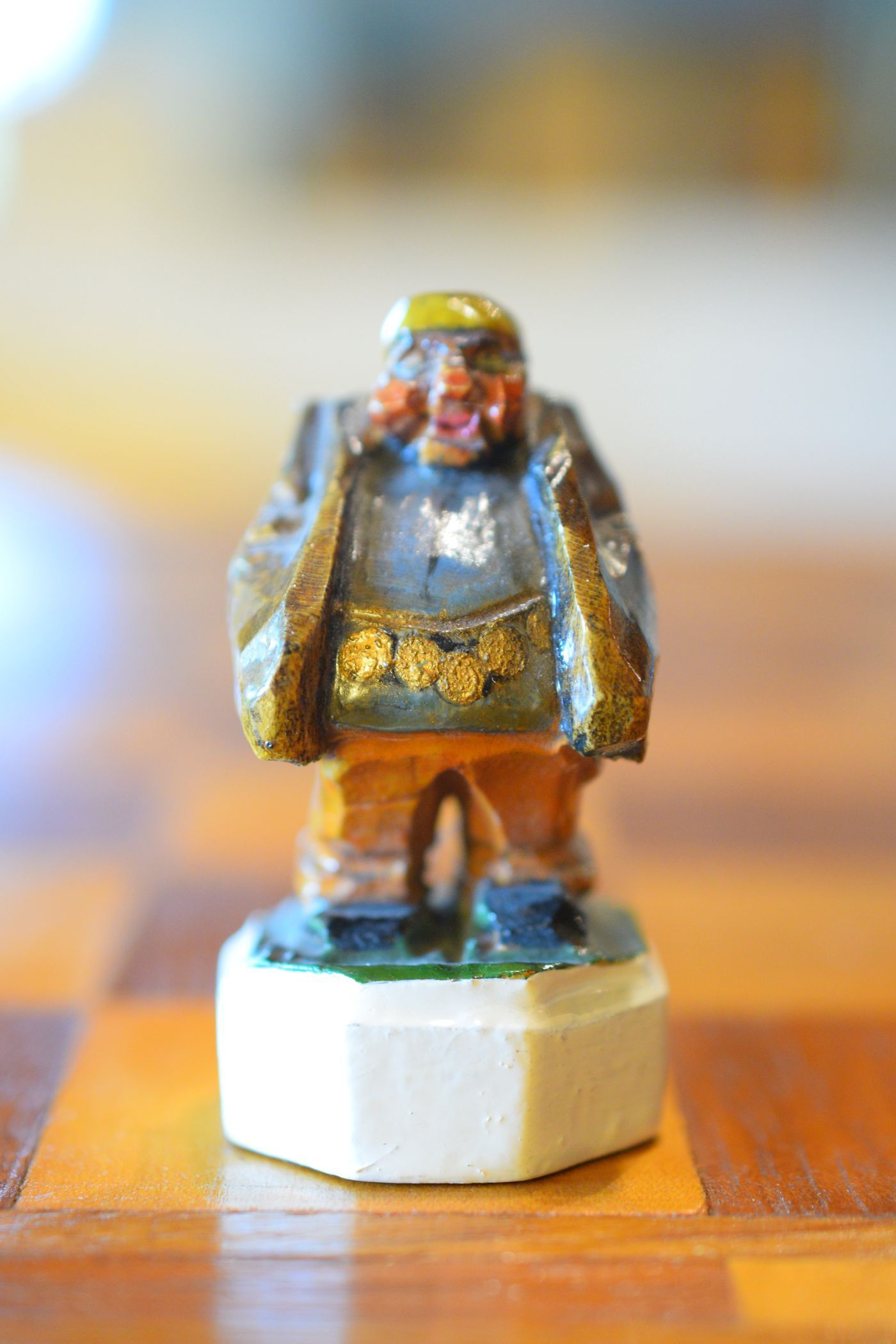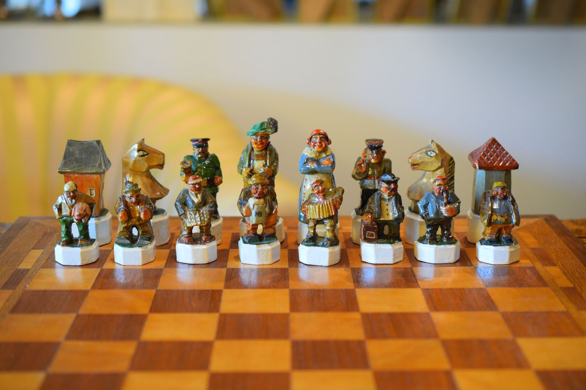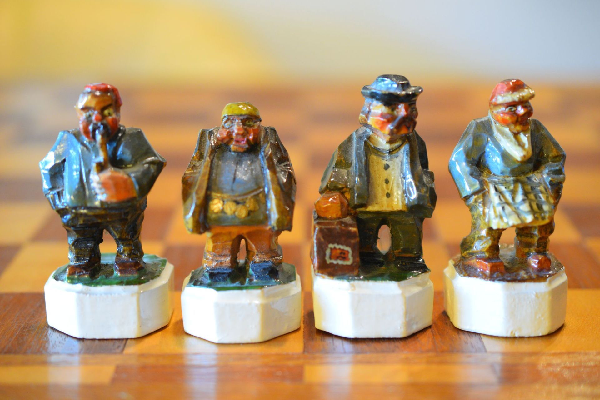 The white king and queen wear traditional Bavarian costumes typical of the rural population. The black king with his fine frock coat and striped trousers looks more urban and bourgeois. The white rooks are square with pointed roofs, the black rooks are round. The bishops on the white side consist of a policeman with a club and a night watchman with a bell, both in matching uniforms. The black bishops are a postman with an envelope in his hand and a guard soldier with a drawn sabre in his right hand. The pawns on both sides are so marvellous and individual that I photographed them separately. On the white side, there is a man with a pipe, a traveller with a suitcase, a hiker with a rucksack on his back, a farmer with a pig under his arm, a musician with an accordion and - in keeping with the Oktoberfest - a man in traditional costume with a beer mug in his hand, which is adorned with the ‘HB’ for the Munich Hofbräuhaus. On the black side, there is a farmer carrying a chicken, a hunter with a shouldered rifle, a farmer with a large turnip in his hand and a man with a toothache, recognisable by the cloth wrapped around his cheek. One of the most beautiful hand-carved sets I have ever seen from southern Germany.