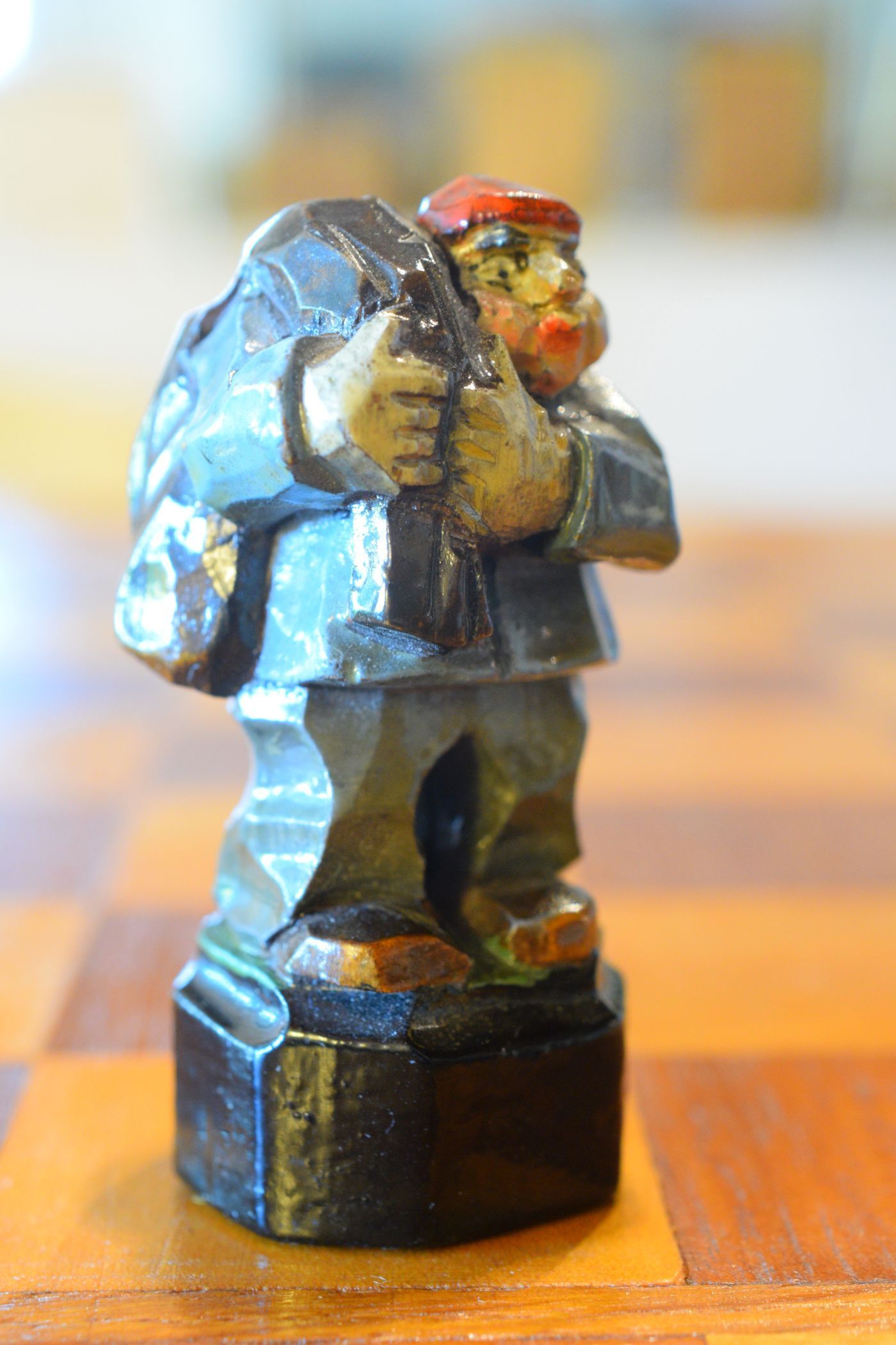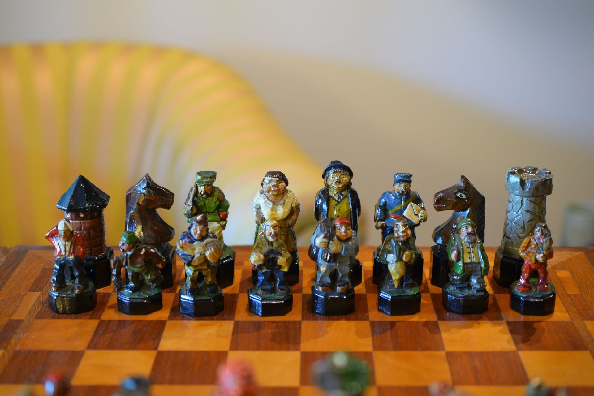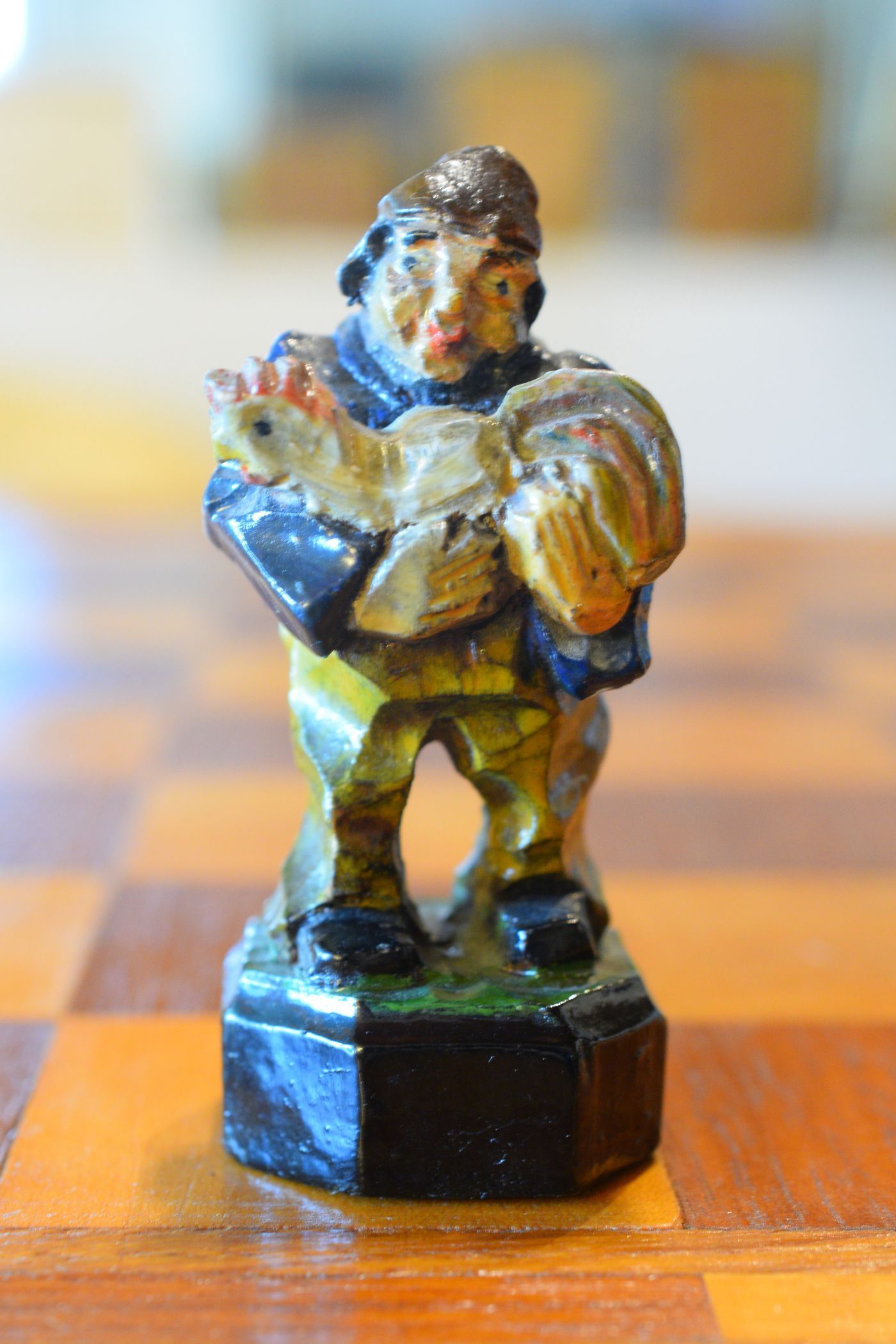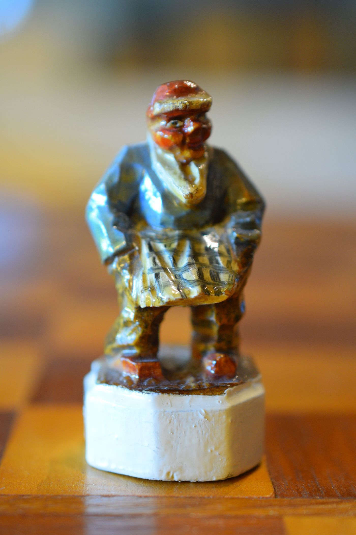 The white king and queen wear traditional Bavarian costumes typical of the rural population. The black king with his fine frock coat and striped trousers looks more urban and bourgeois. The white rooks are square with pointed roofs, the black rooks are round. The bishops on the white side consist of a policeman with a club and a night watchman with a bell, both in matching uniforms. The black bishops are a postman with an envelope in his hand and a guard soldier with a drawn sabre in his right hand. The pawns on both sides are so marvellous and individual that I photographed them separately. On the white side, there is a man with a pipe, a traveller with a suitcase, a hiker with a rucksack on his back, a farmer with a pig under his arm, a musician with an accordion and - in keeping with the Oktoberfest - a man in traditional costume with a beer mug in his hand, which is adorned with the ‘HB’ for the Munich Hofbräuhaus. On the black side, there is a farmer carrying a chicken, a hunter with a shouldered rifle, a farmer with a large turnip in his hand and a man with a toothache, recognisable by the cloth wrapped around his cheek. One of the most beautiful hand-carved sets I have ever seen from southern Germany.