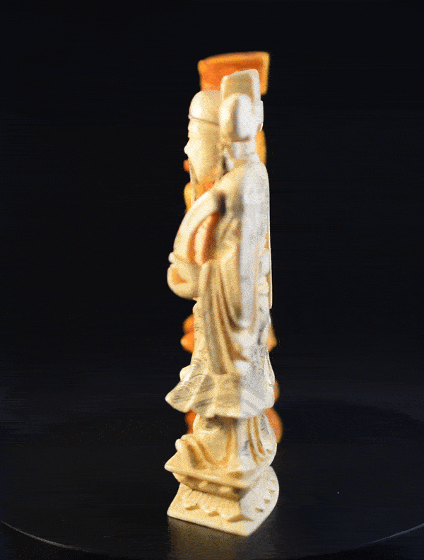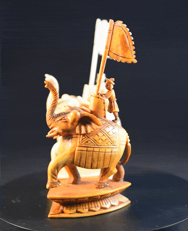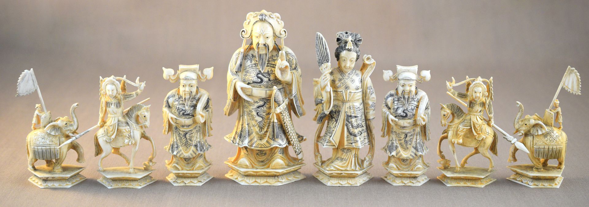 Here is a very special chess set of Chinese origin. The pieces were carved from ivory, one side natural, the other side tea stained, the kings, queens and bishops with additional black ink highlights. Particularly impressive are the kings and queens, which are massive pieces carved from single blocks of ivory. The kings have an impressive size of 16 cm and a weight of 350 grams. The white king is shown as a Chinese aristocrat or official carrying a sword on his belt. His left hand is raised in the so called “sword gesture” (剑指). He is wearing a headdress resembling a Chixiao mao (鴟鴞帽), a so-called owl hat, which is surprising as this type of headdress is mainly known for children. The white queen is a female dressed in a gown holding up a fan in her right hand. The black king is depicted as an aristocrat or official also carrying a sword on his belt and raising the fingers of his left hand in the so-called Tao gesture (道指). He is wearing a headdress reminiscent of a Zhanjiao Putou (展角幞頭), lit. "spread-horn head cover", which was the headwear of Song dynasty officials. The black queen is a woman dressed in a gown carrying a raised sword in her right hand and a small bag in her left hand. The bishops are shown as Chinese counsellors, the knights as mounted horses with riders wielding a lance and the rooks as war elephants carrying a flagged turret with cannon and rider.