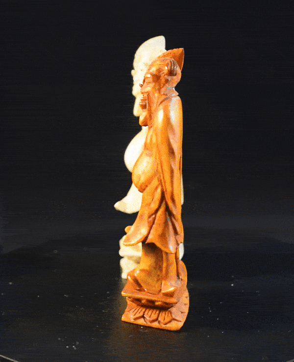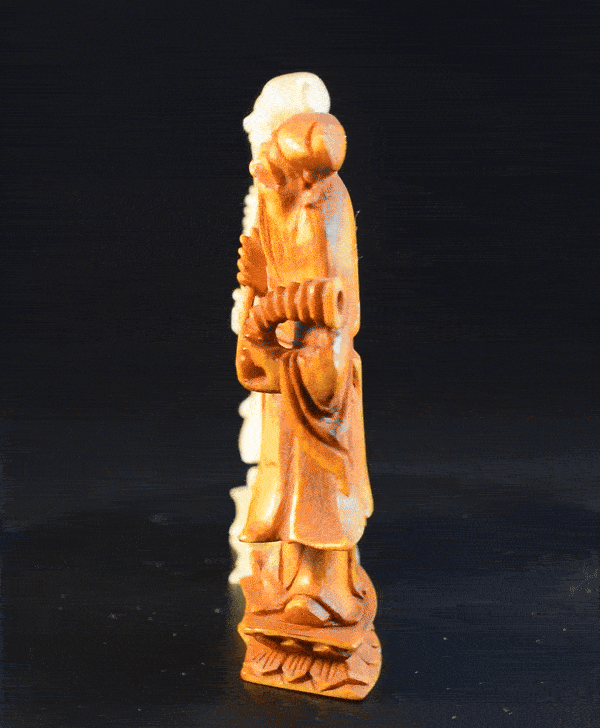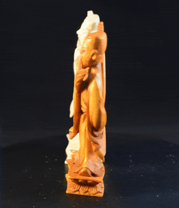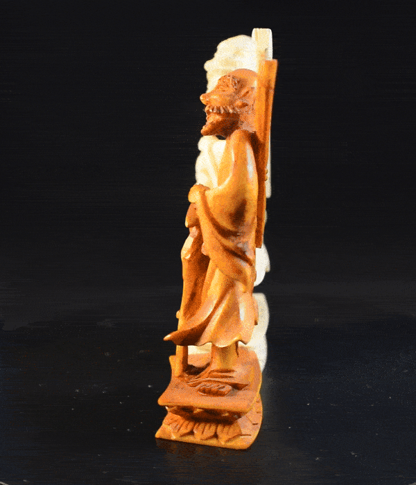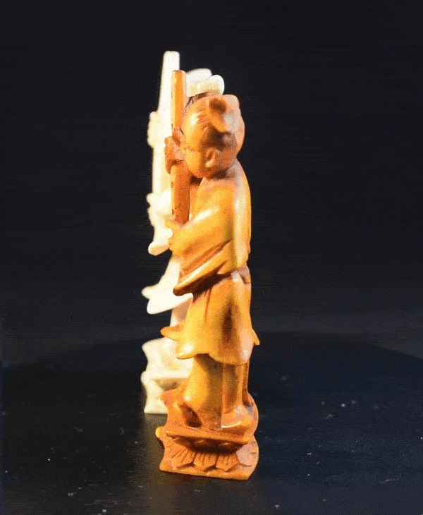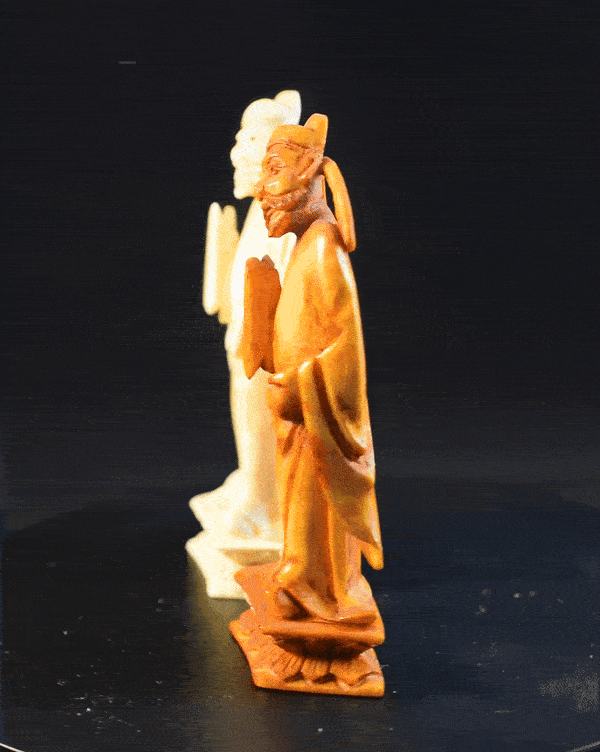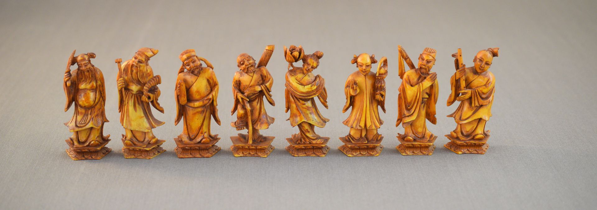 The real highlight of the set, however, are the pawns, which are depictions of the Eight Immortals, a group of legendary characters in Chinese mythology. Starting from the left, the first immortal is Zhongli Quan (鍾離權). He is usually depicted with his chest and belly bare and holding a fan made of feathers, which – in legend – can resurrect the dead and transform stones into silver and gold. The second from the left is Li Tieguai (李鐵拐), who is considered to be mentally disturbed and associated with medicine and easing the suffering of the sick and needy. He can be identified by his iron crutch and Calabash bottle, in which he is carrying his medicine. The third one from the left is Cao Guojiu (曹國舅), who is believed to be a descendant of Cao Bin, a general of the early Song dynasty, and a younger brother of Empress Cao, the wife of Emperor Renzong of the Song dynasty. Being regarded as the patron deity of acting and theatre, he is often depicted dressed in official robes and holding a paiban, a clapper made from several flat pieces of hardwood or bamboo, which is used in many different forms of Chinese music. The next one from the left I believe to be Zhang Guo, better known as Zhang Guolao (張果老). The epithet “Lao” added at the end of his name means “old”, which is symbolised here by his leaning on a staff. His emblem is a fish drum, a tube-shaped bamboo drum, which he is in this case carrying on his back. Pawn number five from the left is He Xiangu (何仙姑), who is easy to identify, as she is the only female in the group. She is shown carrying a lotus flower, which she is using to improve mental and physical health. The sixth pawn from the left is Lan Caihe (藍采和), who is the only one of the Eight Immortals whose gender is ambiguous. He is considered the patron deity of florists and gardeners, and hence can usually be recognised by carrying a basket of fruit or flowers. The second to last pawn from the left is Lü Dongbin (呂洞賓), a scholar and poet, who is said to have lived during the Tang Dynasty. He is considered to be the leader of the Eight Immortals and is often depicted dressed as a scholar carrying a sword to dispel evil spirits. The last pawn is Han Xiangzi (韓湘子). He is very easy to identify, as he is often depicted carrying a dizi (a Chinese flute), since he is also regarded as the patron deity of flutists. The former owner of the set acquired it in an auction by Sotheby’s in 1984, but even with the help of Sotheby’s archive, I was unfortunately not able to find out more details on the set’s provenance.