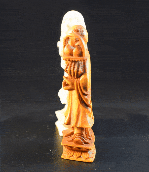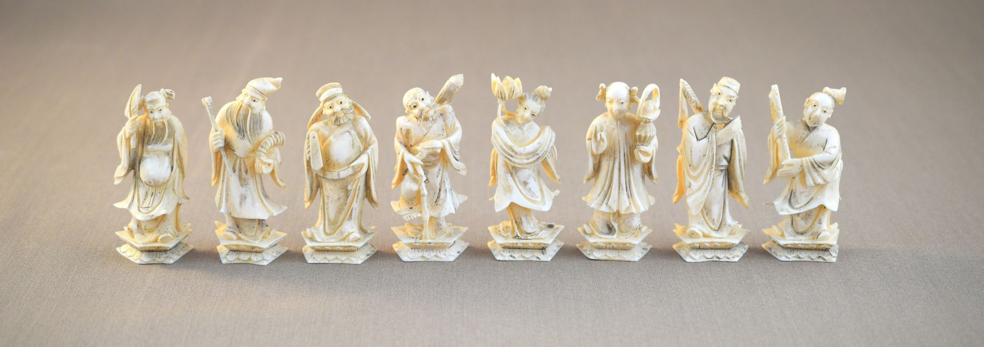 Sets of this pattern were apparently made from the 1920s to the 1960s. The older sets are usually characterised by better quality of carving, which became coarser in the 1960s when sets of this type were produced in larger numbers. Since the quality of the set shown here is excellent, I tend to believe that it was made in the first half of the 20th century, but that again is not certain. I know of an almost similar set which was bought in Hong Kong in 1957. What is certain is that before the Second World War, only about 100 ivory carvers remained in Hong Kong from the numerous Cantonese ivory carvers of the 19th and early 20th centuries, but ivory processing grew strongly from 1950 onwards, until finally, after the Washington Convention on International Trade in Endangered Species of Fauna and Flora came into force in 1989, there was a slump in sales figures and many factories had to close.