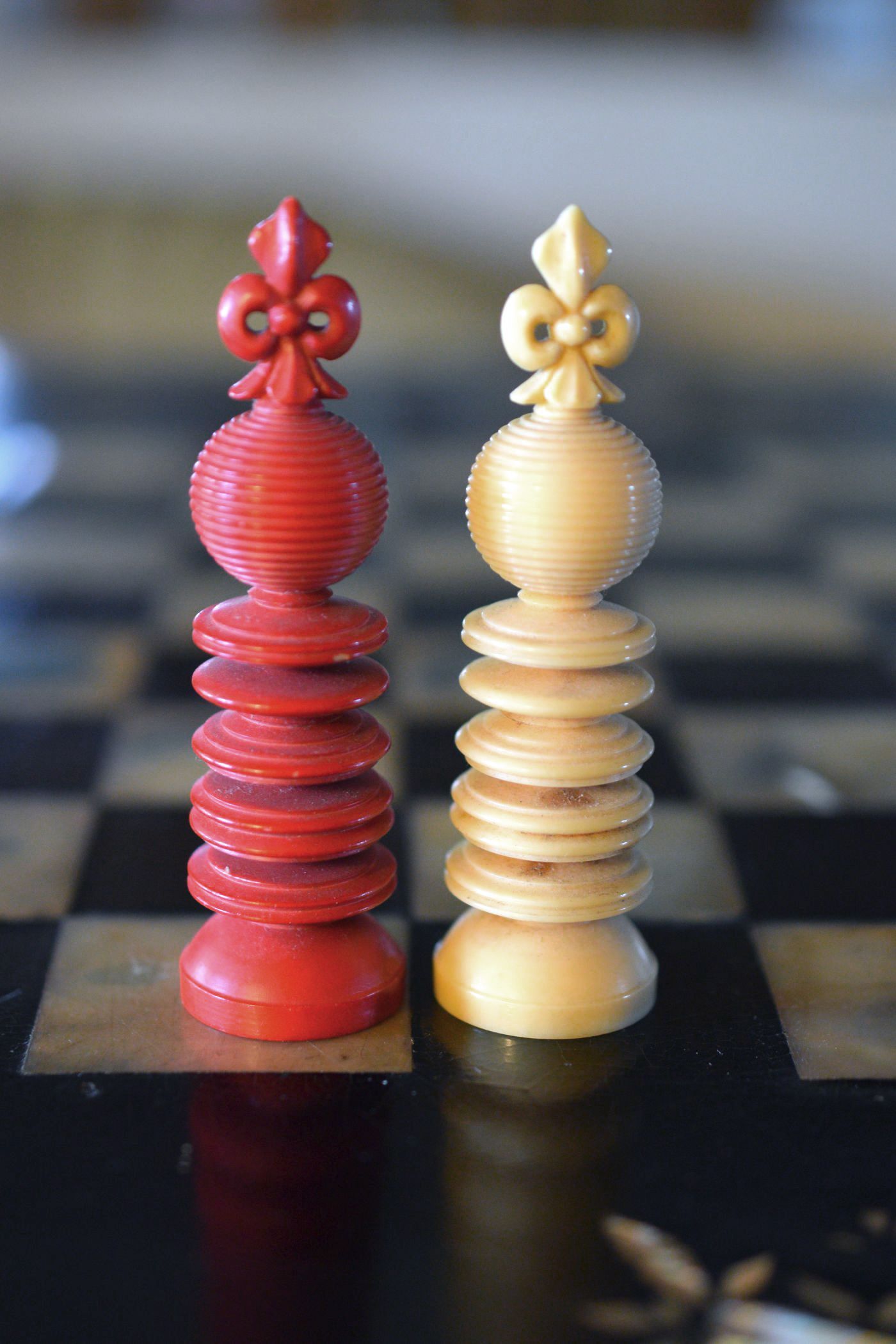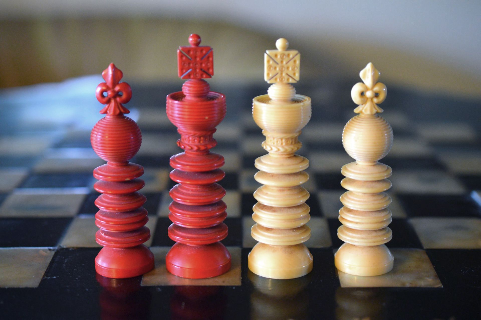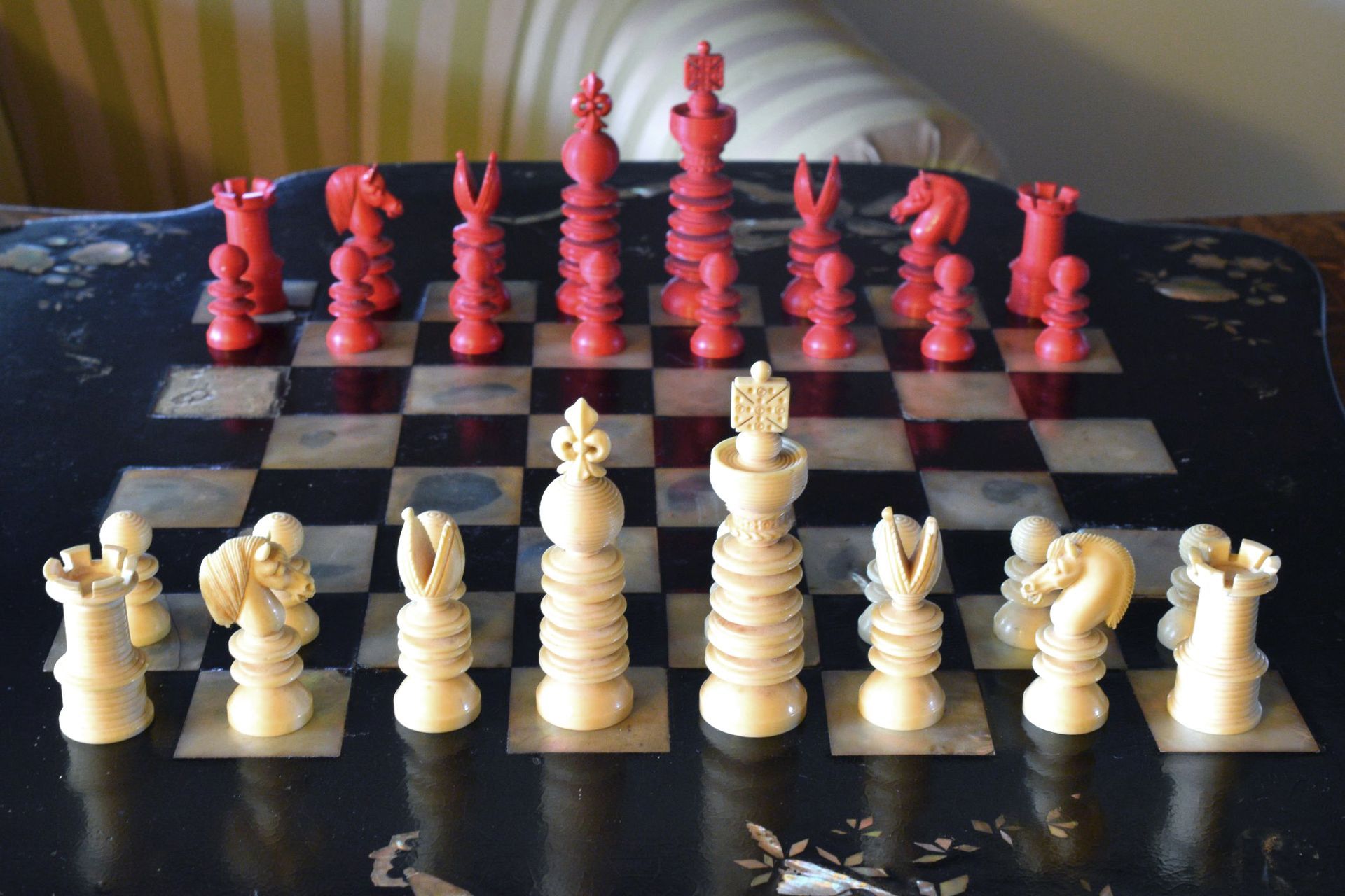 Ivory chess set with a king size of 9.5 cm from the workshop of William Lund in London, as is evident from the original stamp underneath the white king, which reads "William Lund, Maker, 24 Fleet Street". White pieces in natural ivory, the other side stained in red. The Kings with a cross pattée, the Queens with a fleur de lys finial. Knights carved in a manner typical for the Lund workshop.