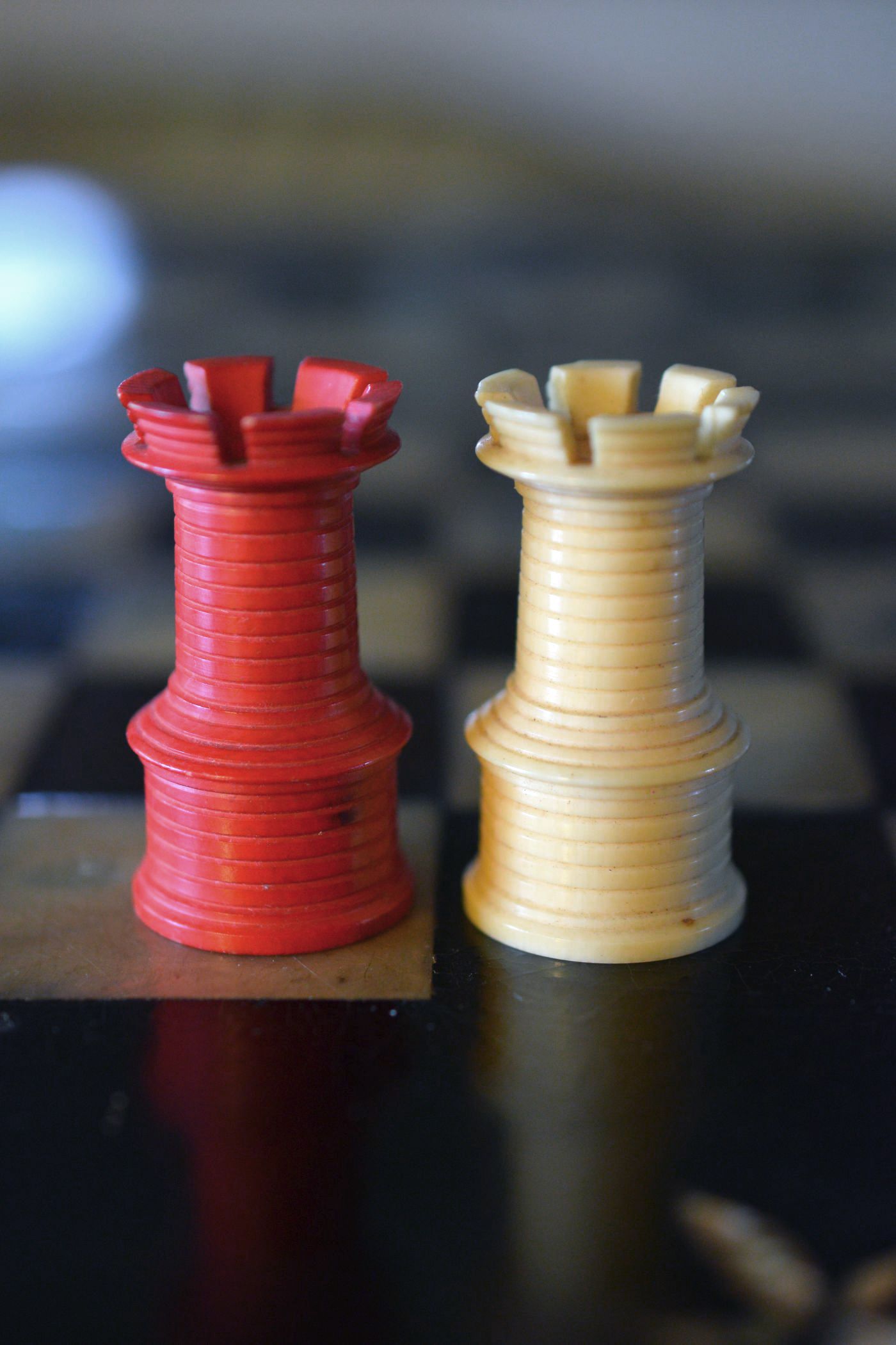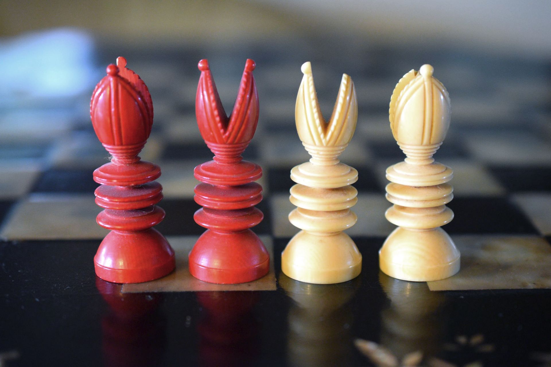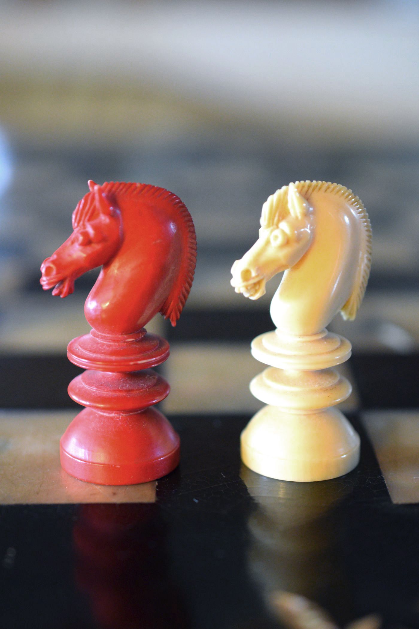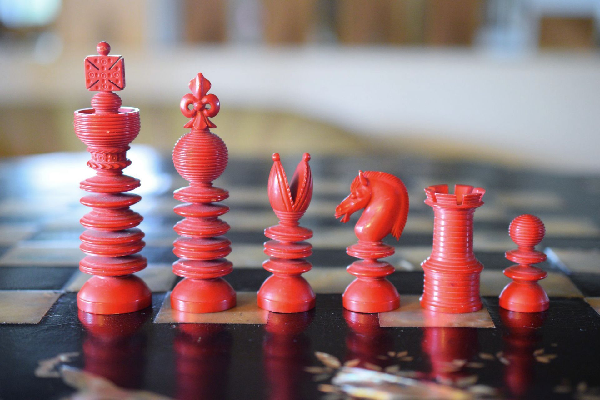 Ivory chess set with a king size of 9.5 cm from the workshop of William Lund in London, as is evident from the original stamp underneath the white king, which reads "William Lund, Maker, 24 Fleet Street". White pieces in natural ivory, the other side stained in red. The Kings with a cross pattée, the Queens with a fleur de lys finial. Knights carved in a manner typical for the Lund workshop.