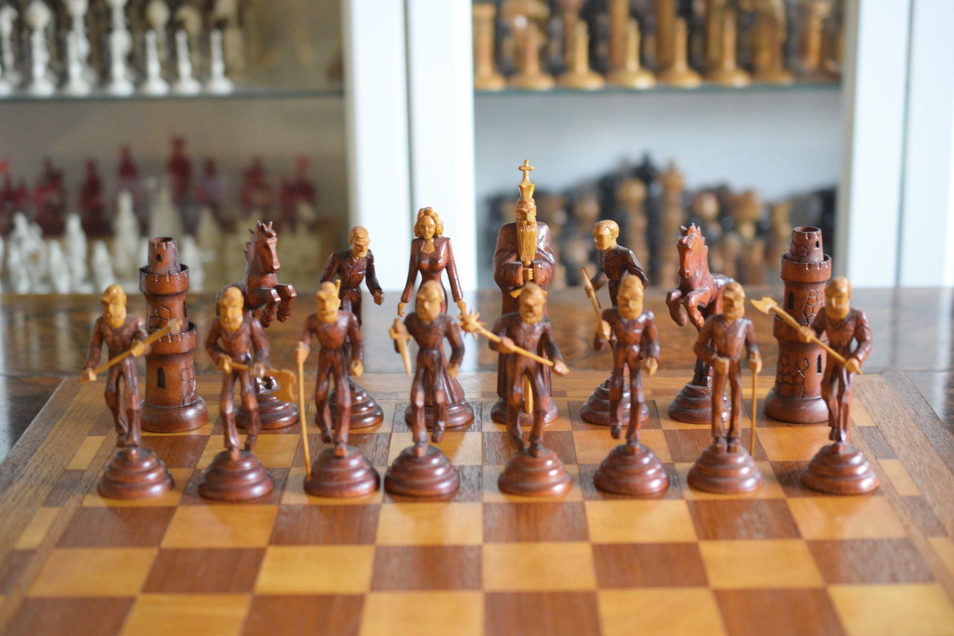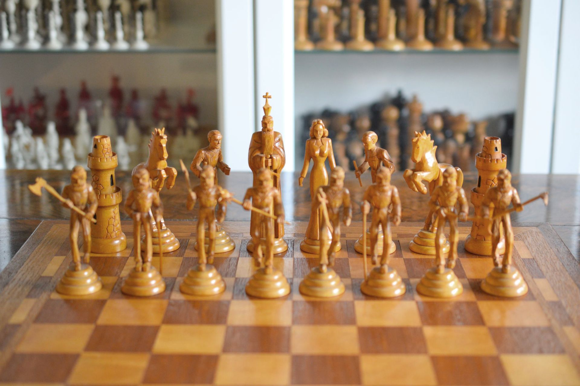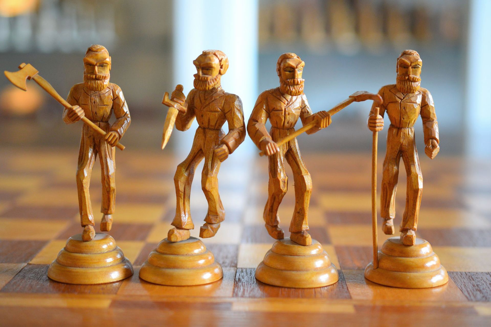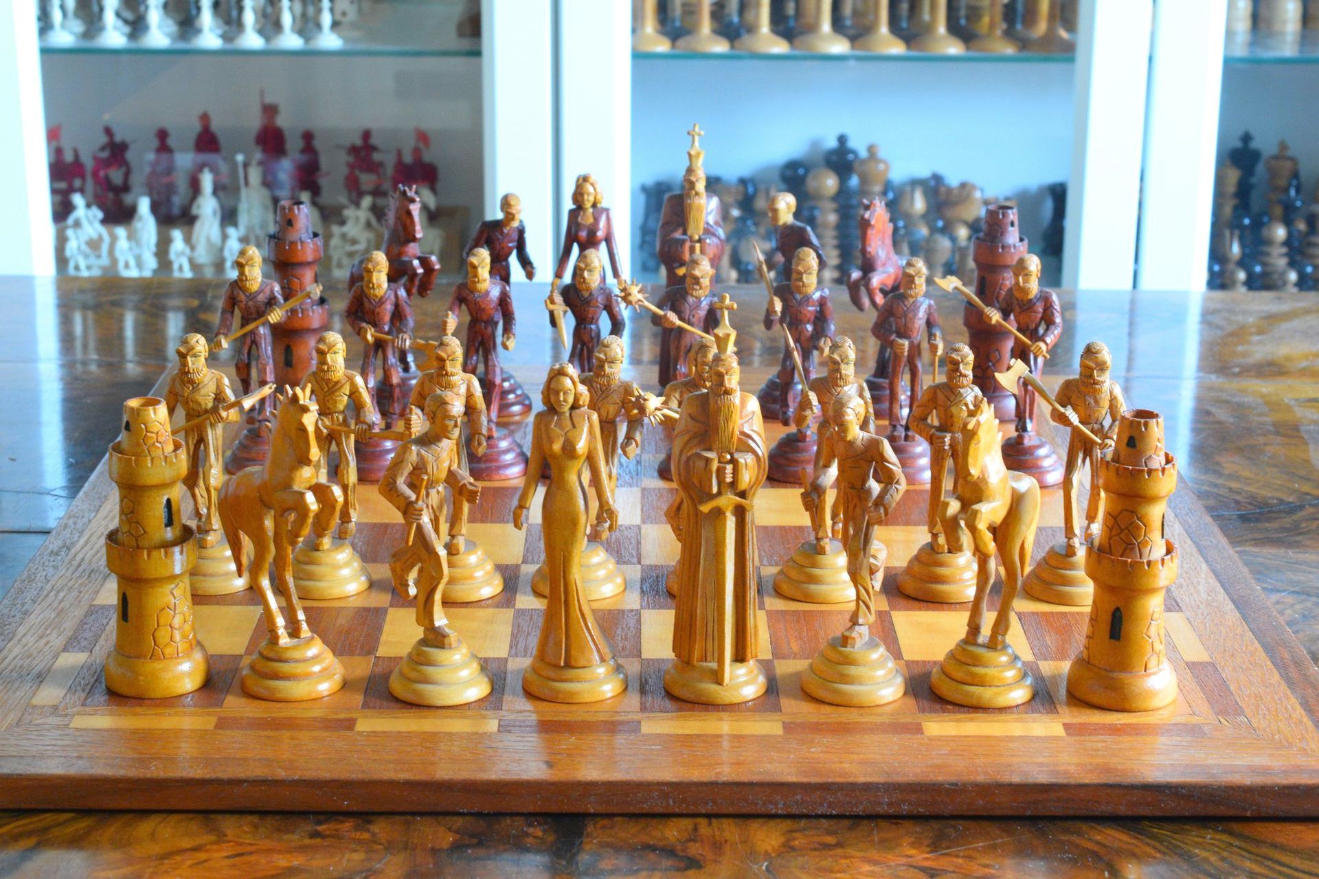 A figural chess set made in the Erzgebirge (Ore Mountain) region in South-East Germany in the second half of the 20th century. The pieces with a king size of 13.4 cm were carved with a lot of attention to detail in the traditional folk art style typical for this region from a rather light and soft wood, probably some type of pine. One side with a light yellowish lacquer, the other side predominantly lacquered in brown. The kings with an upright crown and large crosses in the Borstendorf style, wearing a robe and holding a long sword to the ground. The queens with a gown and wavy hair. The bishops as messengers holding a parchment (which indicates their connection to the German chess tradition in which the bishop is called "Läufer", which in this case means messenger). The knights as rearing horses. The rooks as multi tiered towers with windows and brickwork ornaments. The highlight are the pawns, which are shown as heavily bearded and grim looking armed peasants, each of which is made in a different style and carrying some kind of weapon, including axes, daggers, maces and scythes.