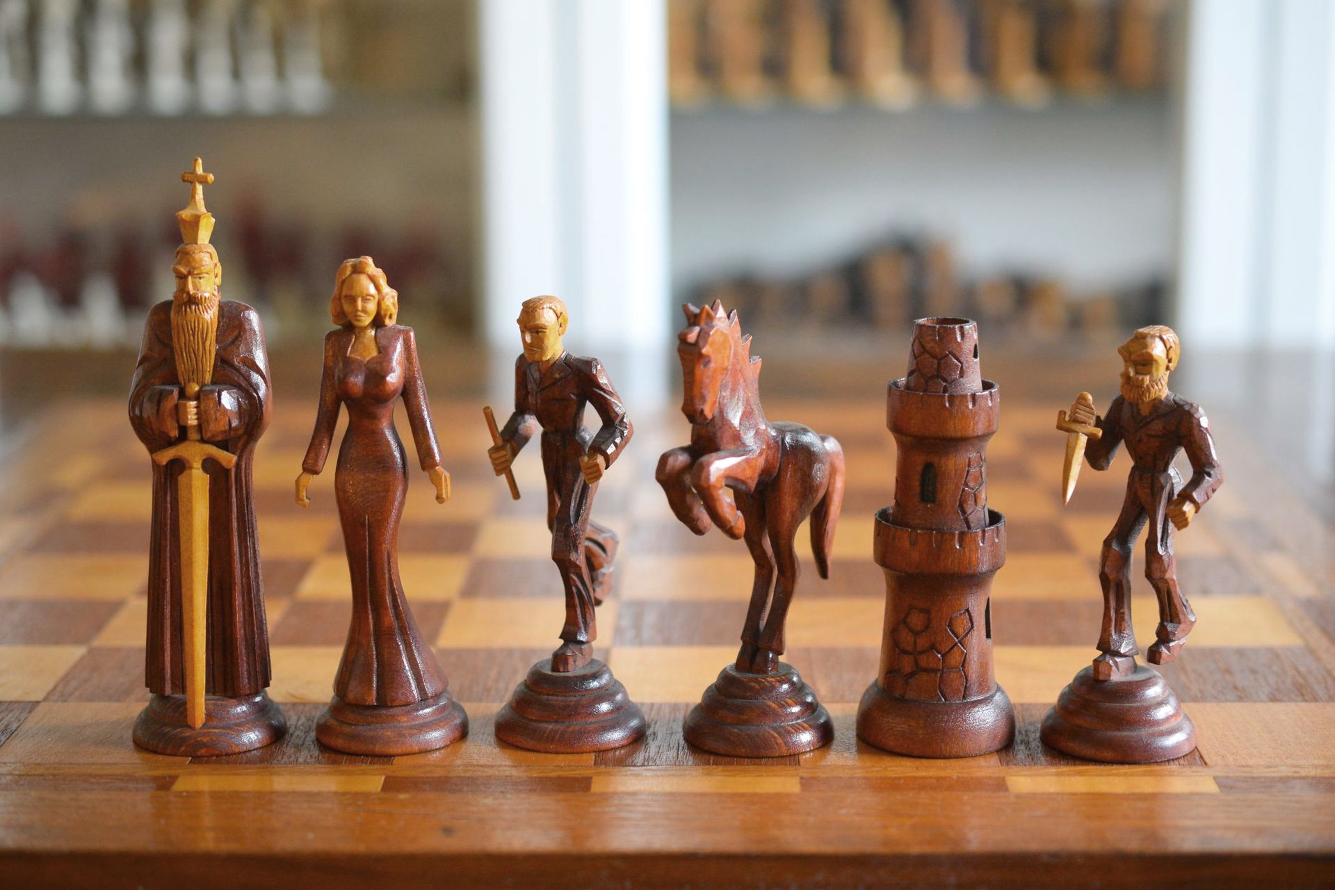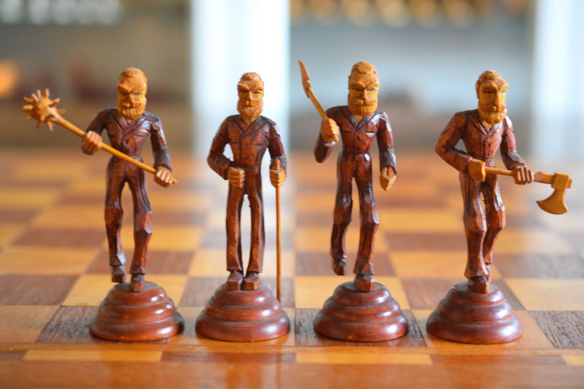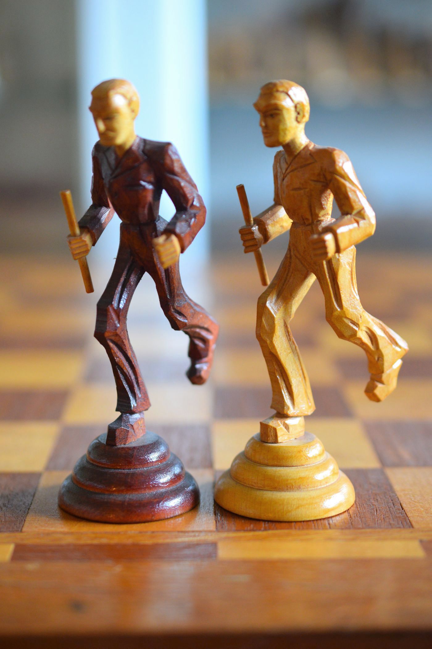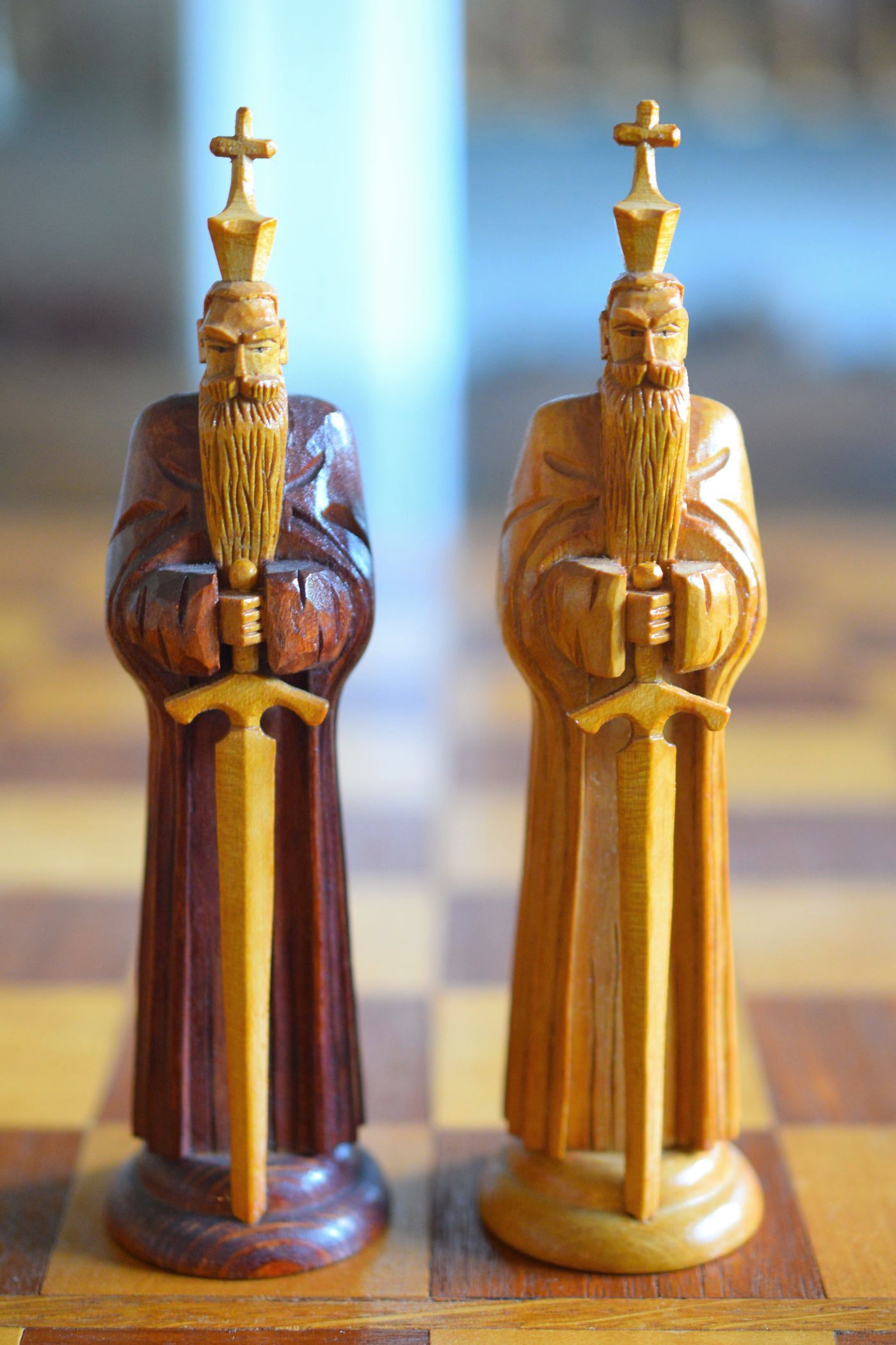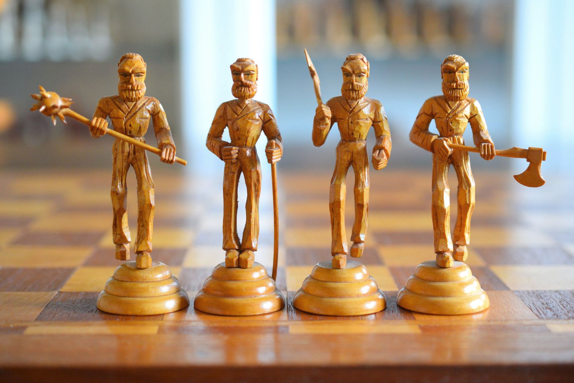 A figural chess set made in the Erzgebirge (Ore Mountain) region in South-East Germany in the second half of the 20th century. The pieces with a king size of 13.4 cm were carved with a lot of attention to detail in the traditional folk art style typical for this region from a rather light and soft wood, probably some type of pine. One side with a light yellowish lacquer, the other side predominantly lacquered in brown. The kings with an upright crown and large crosses in the Borstendorf style, wearing a robe and holding a long sword to the ground. The queens with a gown and wavy hair. The bishops as messengers holding a parchment (which indicates their connection to the German chess tradition in which the bishop is called "Läufer", which in this case means messenger). The knights as rearing horses. The rooks as multi tiered towers with windows and brickwork ornaments. The highlight are the pawns, which are shown as heavily bearded and grim looking armed peasants, each of which is made in a different style and carrying some kind of weapon, including axes, daggers, maces and scythes.