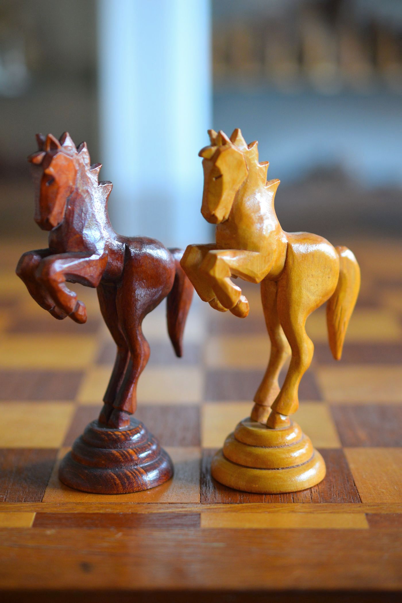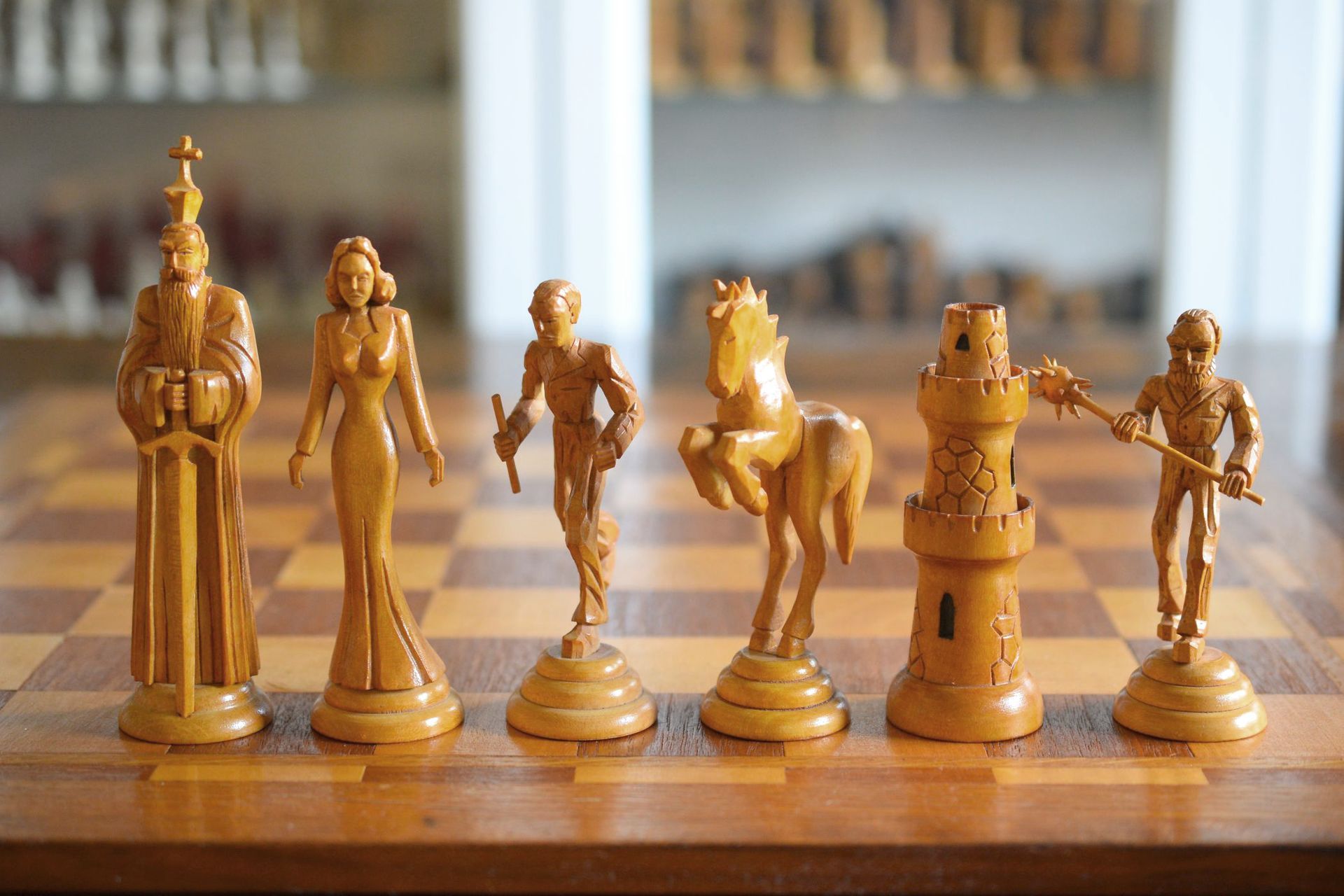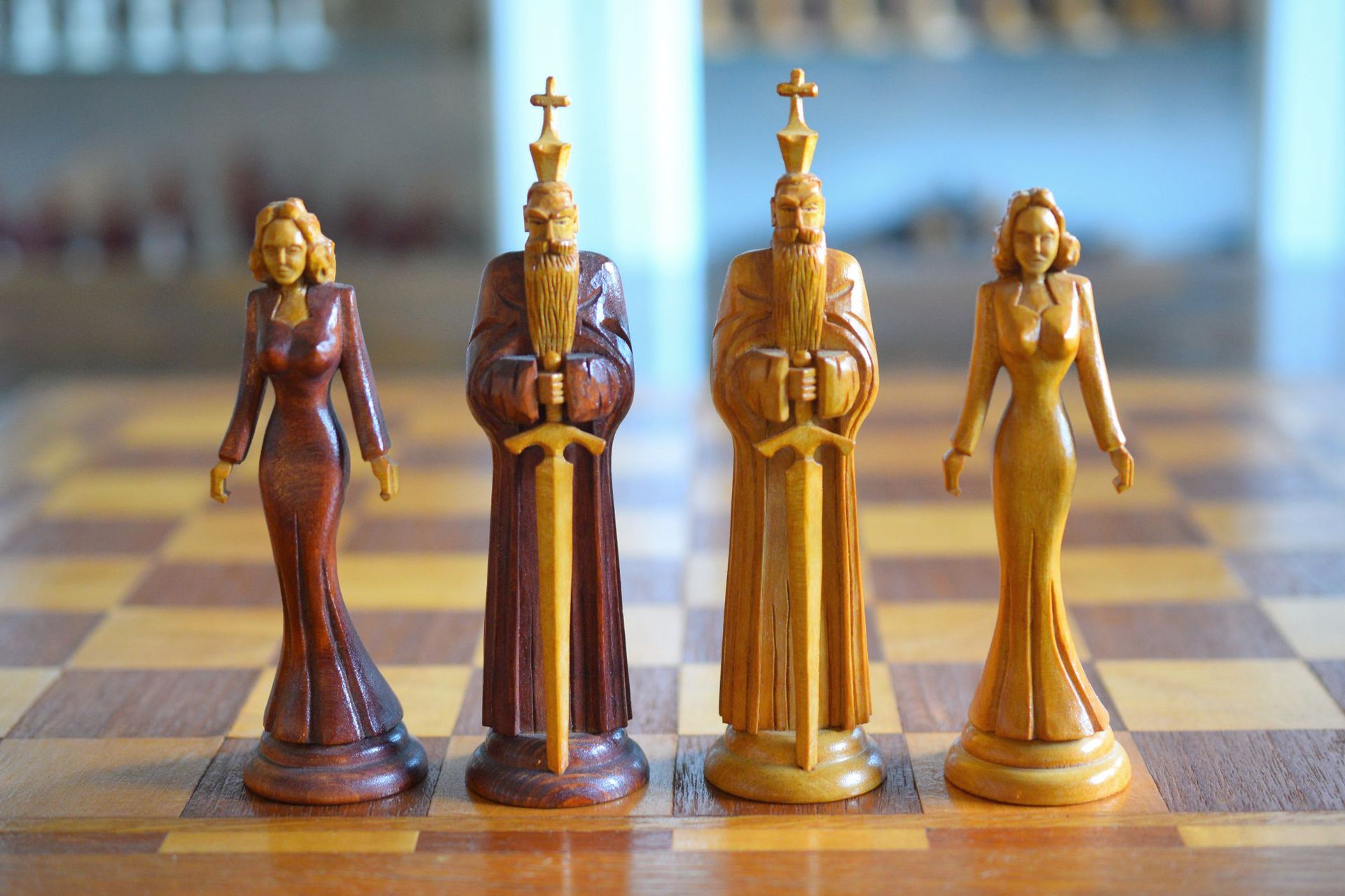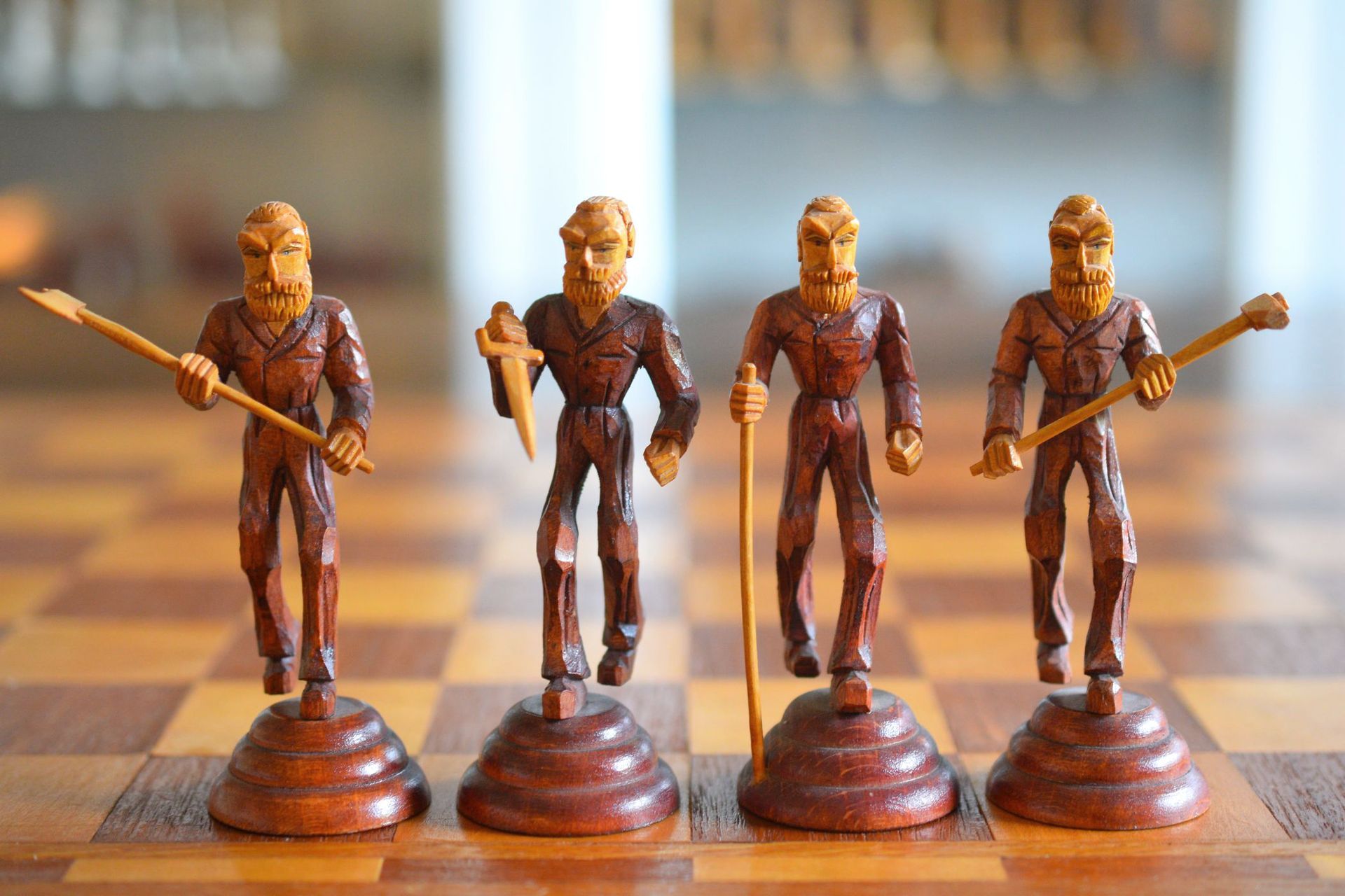 A figural chess set made in the Erzgebirge (Ore Mountain) region in South-East Germany in the second half of the 20th century. The pieces with a king size of 13.4 cm were carved with a lot of attention to detail in the traditional folk art style typical for this region from a rather light and soft wood, probably some type of pine. One side with a light yellowish lacquer, the other side predominantly lacquered in brown. The kings with an upright crown and large crosses in the Borstendorf style, wearing a robe and holding a long sword to the ground. The queens with a gown and wavy hair. The bishops as messengers holding a parchment (which indicates their connection to the German chess tradition in which the bishop is called "Läufer", which in this case means messenger). The knights as rearing horses. The rooks as multi tiered towers with windows and brickwork ornaments. The highlight are the pawns, which are shown as heavily bearded and grim looking armed peasants, each of which is made in a different style and carrying some kind of weapon, including axes, daggers, maces and scythes.
