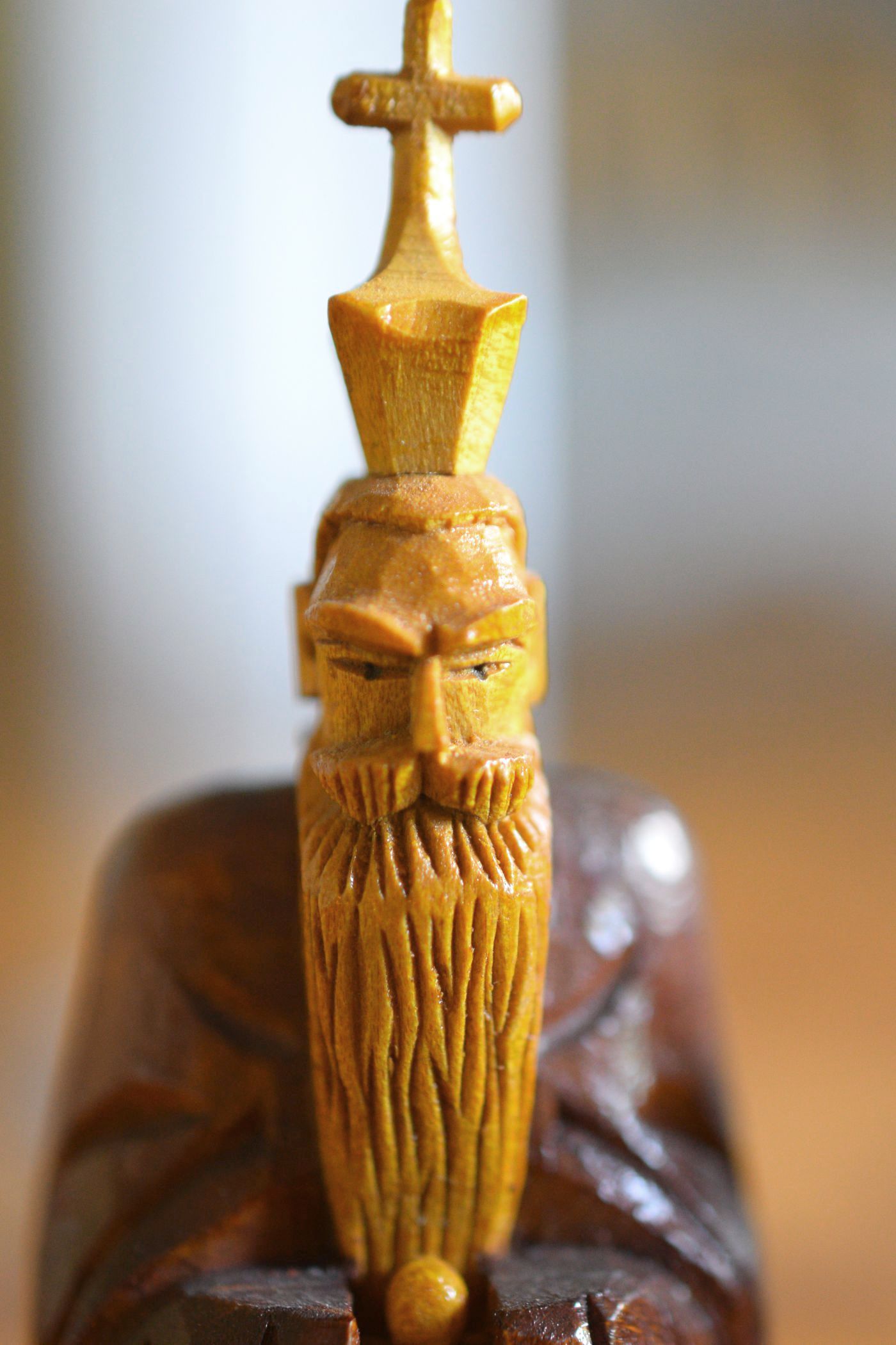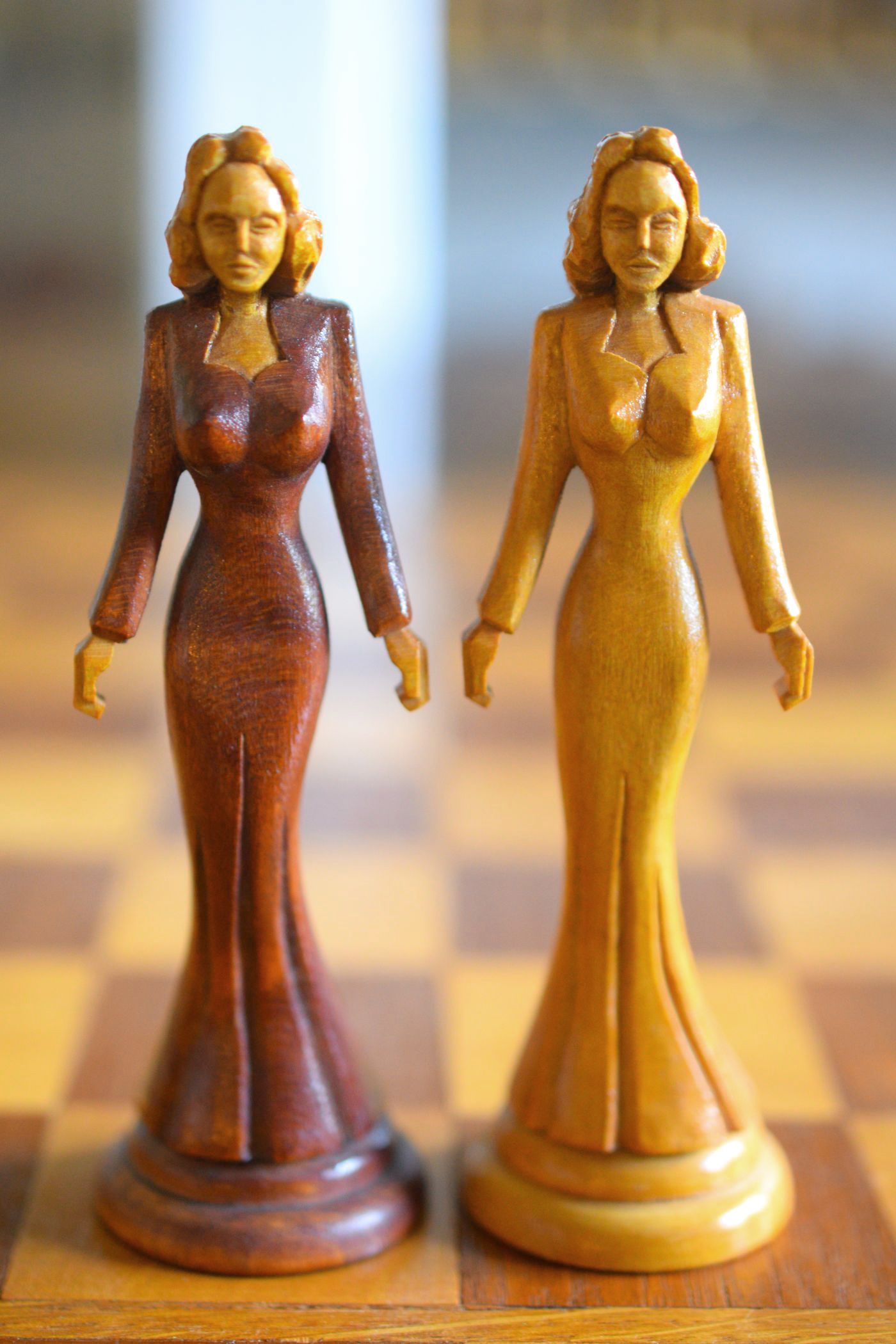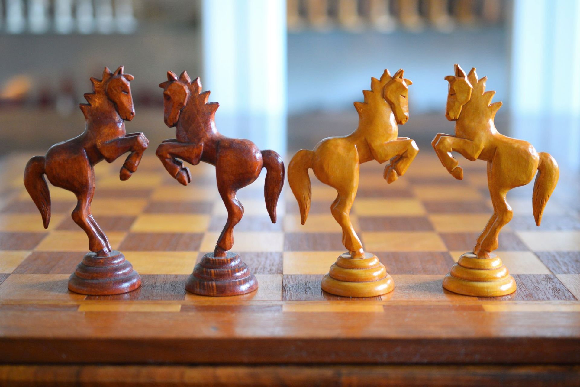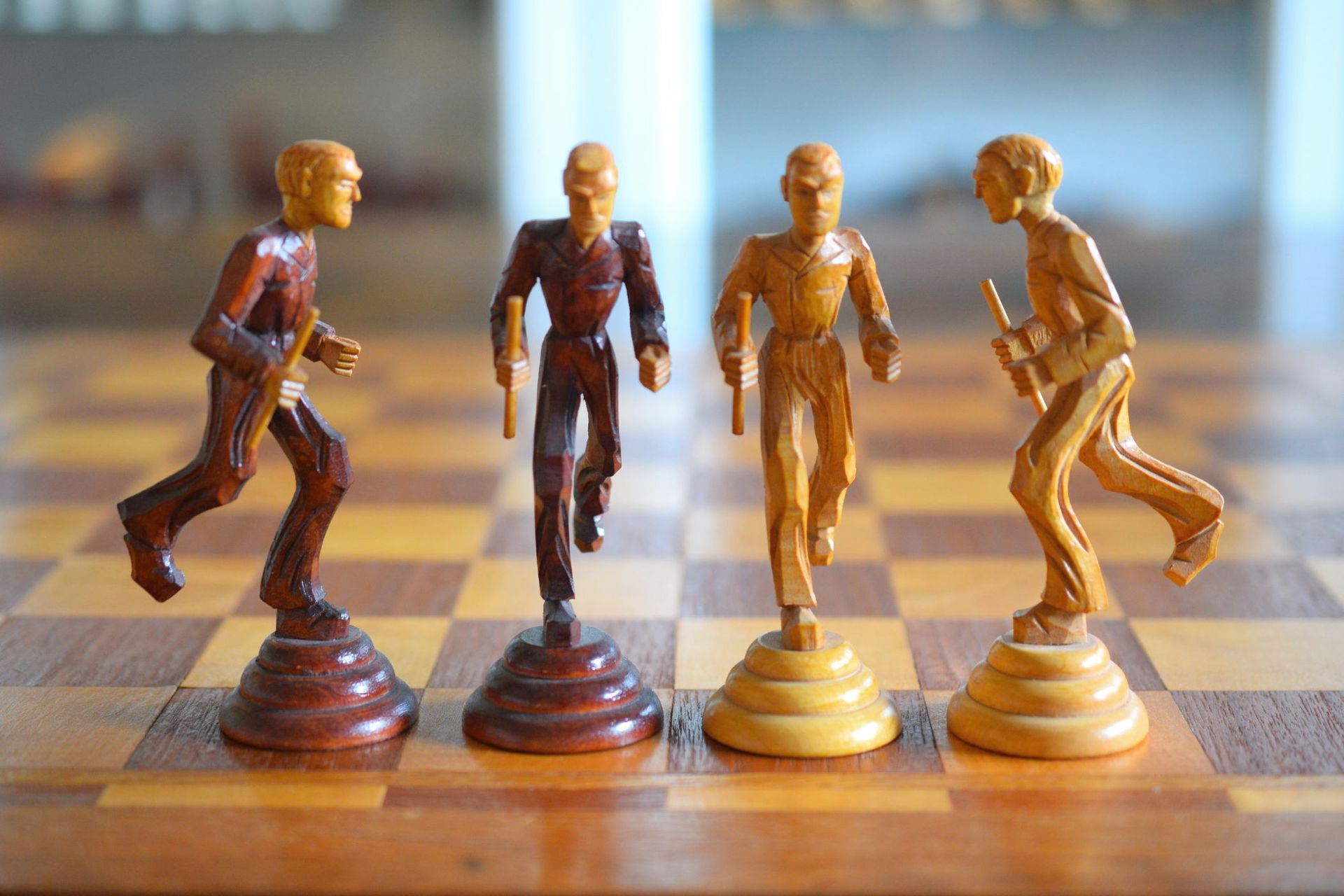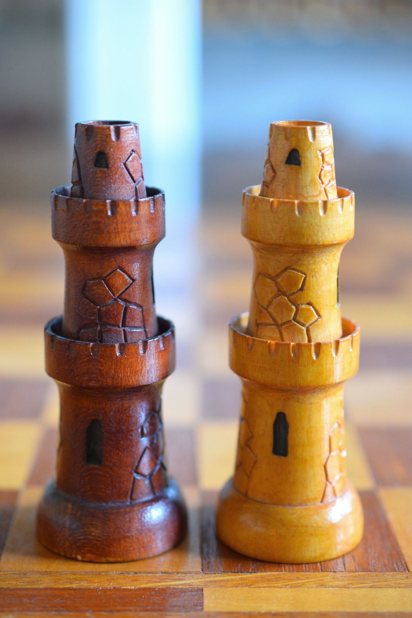 A figural chess set made in the Erzgebirge (Ore Mountain) region in South-East Germany in the second half of the 20th century. The pieces with a king size of 13.4 cm were carved with a lot of attention to detail in the traditional folk art style typical for this region from a rather light and soft wood, probably some type of pine. One side with a light yellowish lacquer, the other side predominantly lacquered in brown. The kings with an upright crown and large crosses in the Borstendorf style, wearing a robe and holding a long sword to the ground. The queens with a gown and wavy hair. The bishops as messengers holding a parchment (which indicates their connection to the German chess tradition in which the bishop is called "Läufer", which in this case means messenger). The knights as rearing horses. The rooks as multi tiered towers with windows and brickwork ornaments. The highlight are the pawns, which are shown as heavily bearded and grim looking armed peasants, each of which is made in a different style and carrying some kind of weapon, including axes, daggers, maces and scythes.