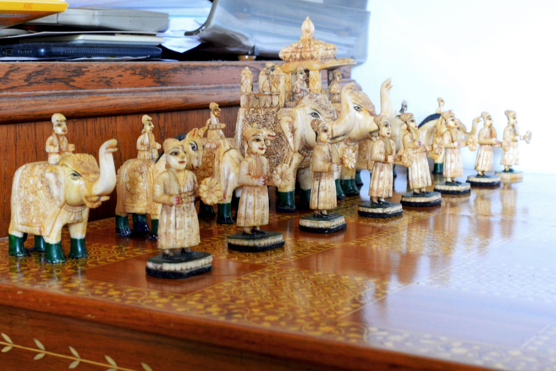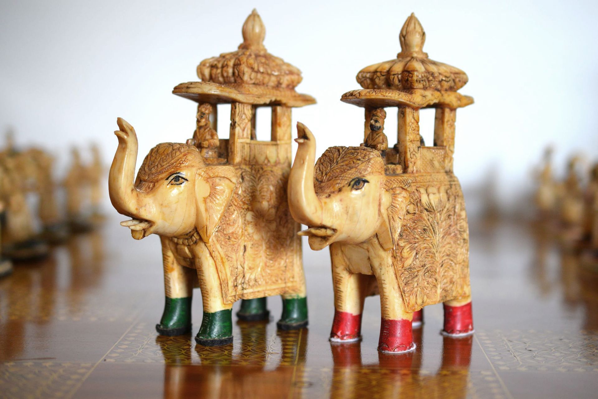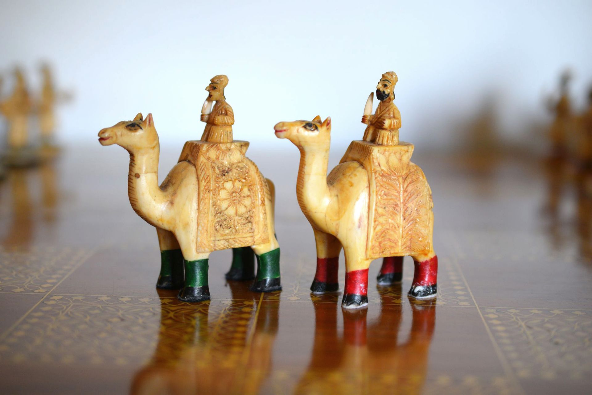 A figural chess set from Rajasthan, India. The pieces are carved from camel bone. The King size is 15 cm. The pieces are typical for traditional Indian chess sets with mounted elephants as kings and queens (vezirs), camels for bishops, horses for knights, smaller elephants for rooks and foot soldiers as pawns. Also traditional, in particular for chess sets from Rajasthan, is the colouring. One side is red, indicated by red bases and feet, the other side green with green bases and feet. The topic roughly follows the "Hindu vs Sikh" topic often seen in Indian sets, as the riders and foot soldiers of the red side are all bearded, which is often used to highlight the Sikh side of the chess sets. As can be seen on the pictures, the pieces are rather massive, especially the kings and queens carved as large mounted elephants with howdah. In order to produce such carvings, it was necessary to join a large number of camel bone plates together to form a solid block, from which the individual sculptures were then made. In view of the high density of camel bones, these pieces therefore have a considerable weight. Sets of this type are very rare and have occasionally been dated to the 19th century, but I think that sets of this type rather date to the first half of the 20th century.