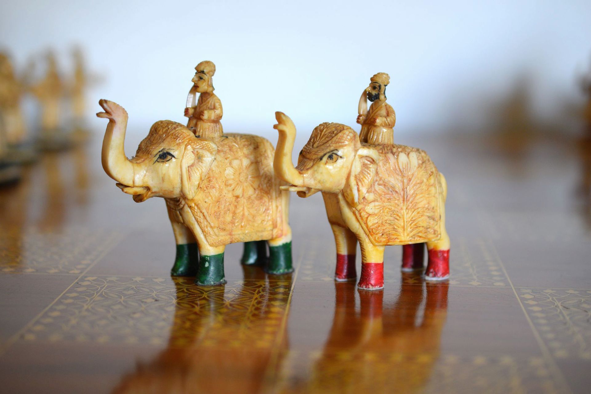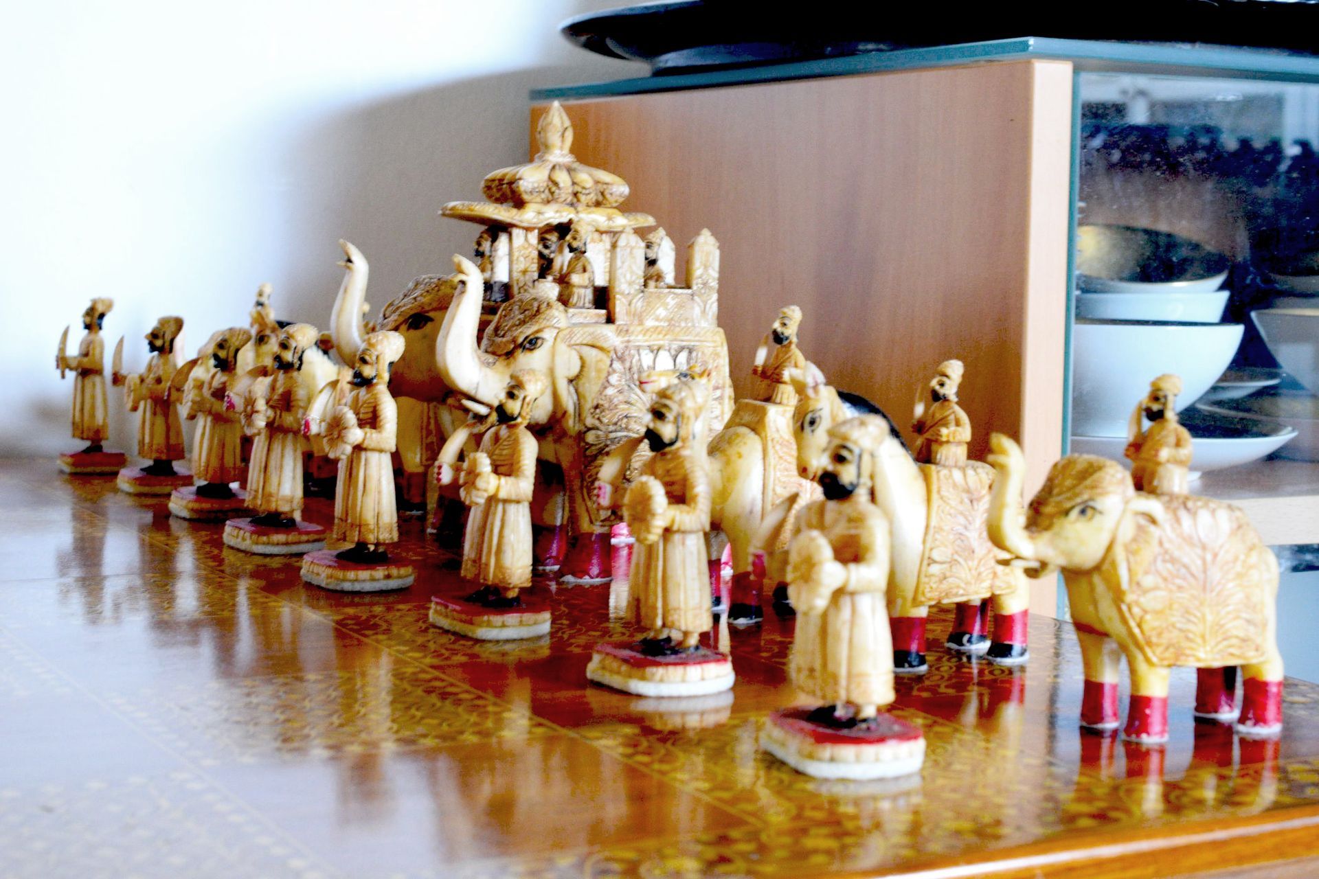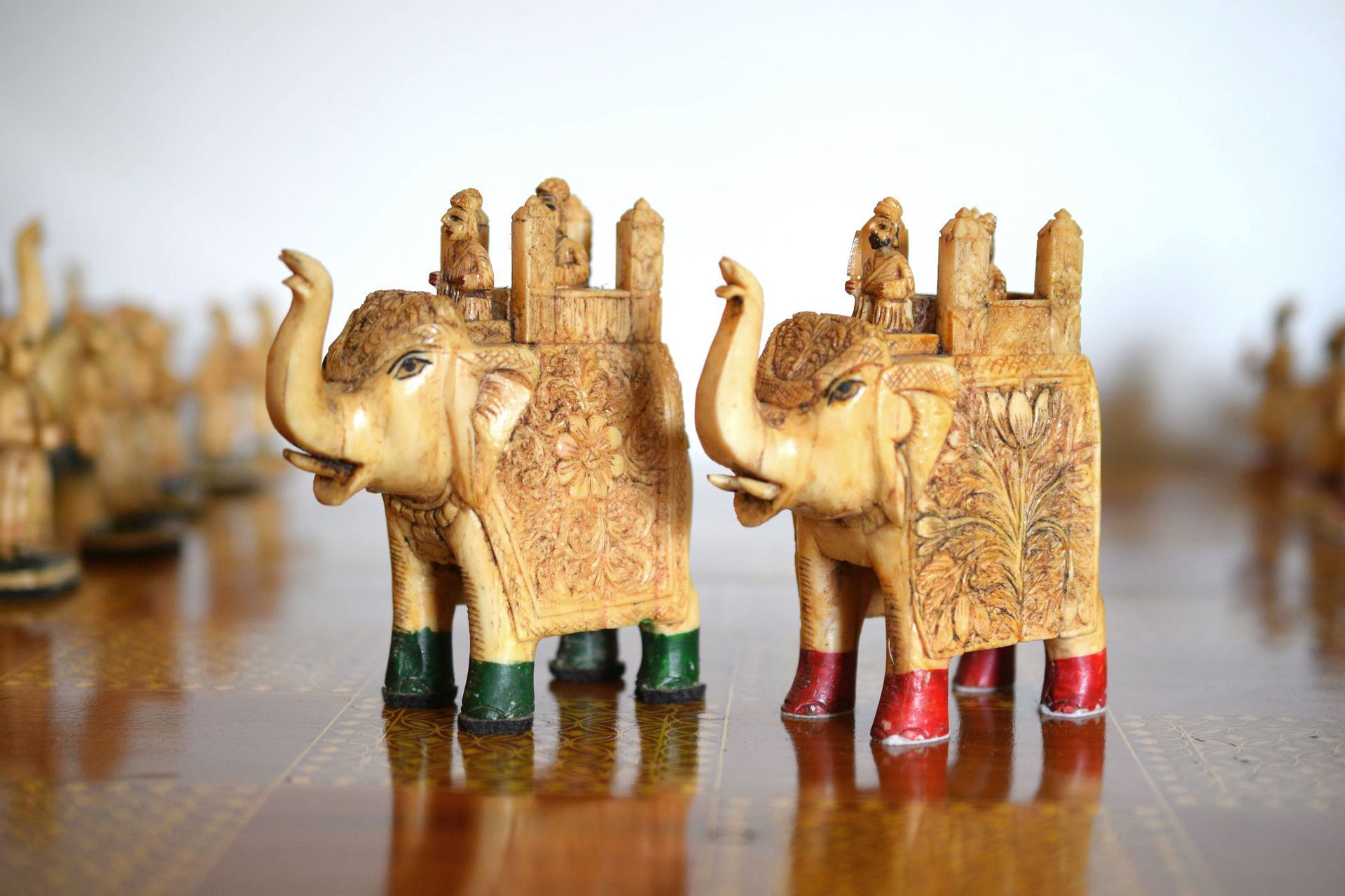 A figural chess set from Rajasthan, India. The pieces are carved from camel bone. The King size is 15 cm. The pieces are typical for traditional Indian chess sets with mounted elephants as kings and queens (vezirs), camels for bishops, horses for knights, smaller elephants for rooks and foot soldiers as pawns. Also traditional, in particular for chess sets from Rajasthan, is the colouring. One side is red, indicated by red bases and feet, the other side green with green bases and feet. The topic roughly follows the "Hindu vs Sikh" topic often seen in Indian sets, as the riders and foot soldiers of the red side are all bearded, which is often used to highlight the Sikh side of the chess sets. As can be seen on the pictures, the pieces are rather massive, especially the kings and queens carved as large mounted elephants with howdah. In order to produce such carvings, it was necessary to join a large number of camel bone plates together to form a solid block, from which the individual sculptures were then made. In view of the high density of camel bones, these pieces therefore have a considerable weight. Sets of this type are very rare and have occasionally been dated to the 19th century, but I think that sets of this type rather date to the first half of the 20th century.
