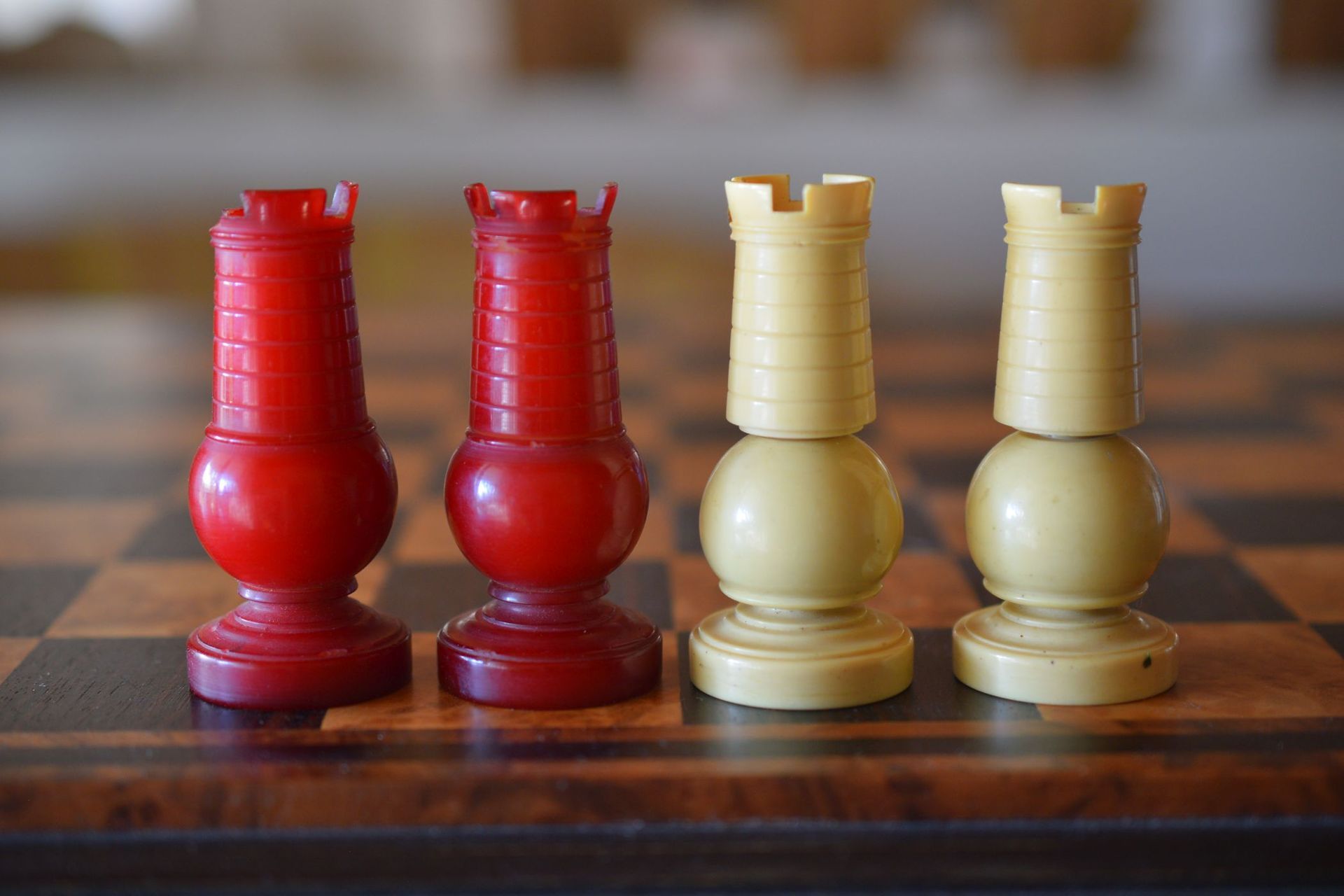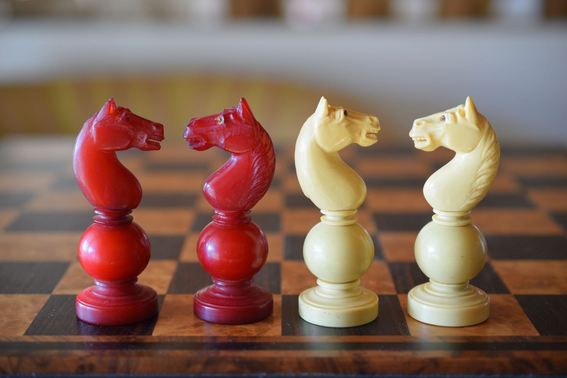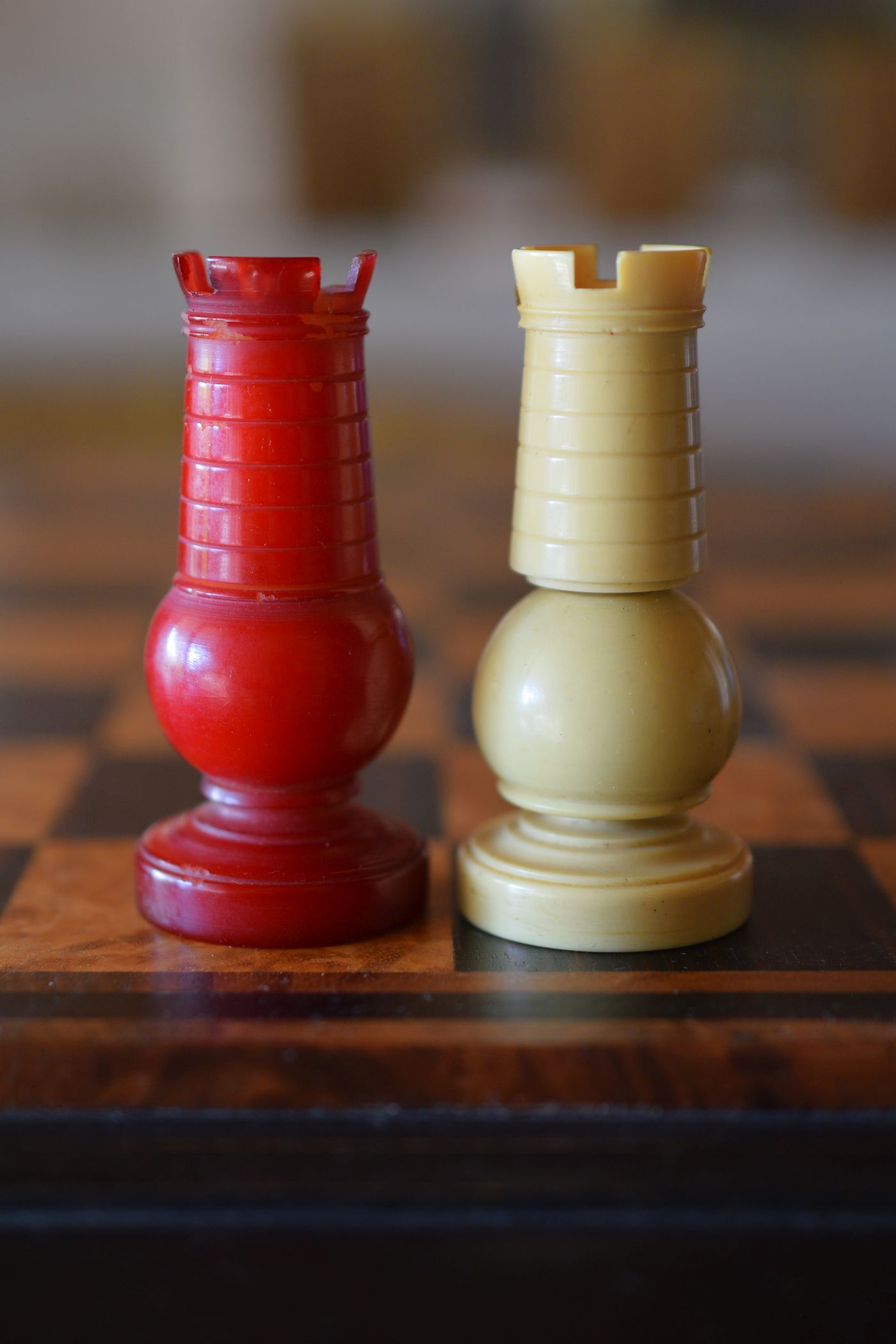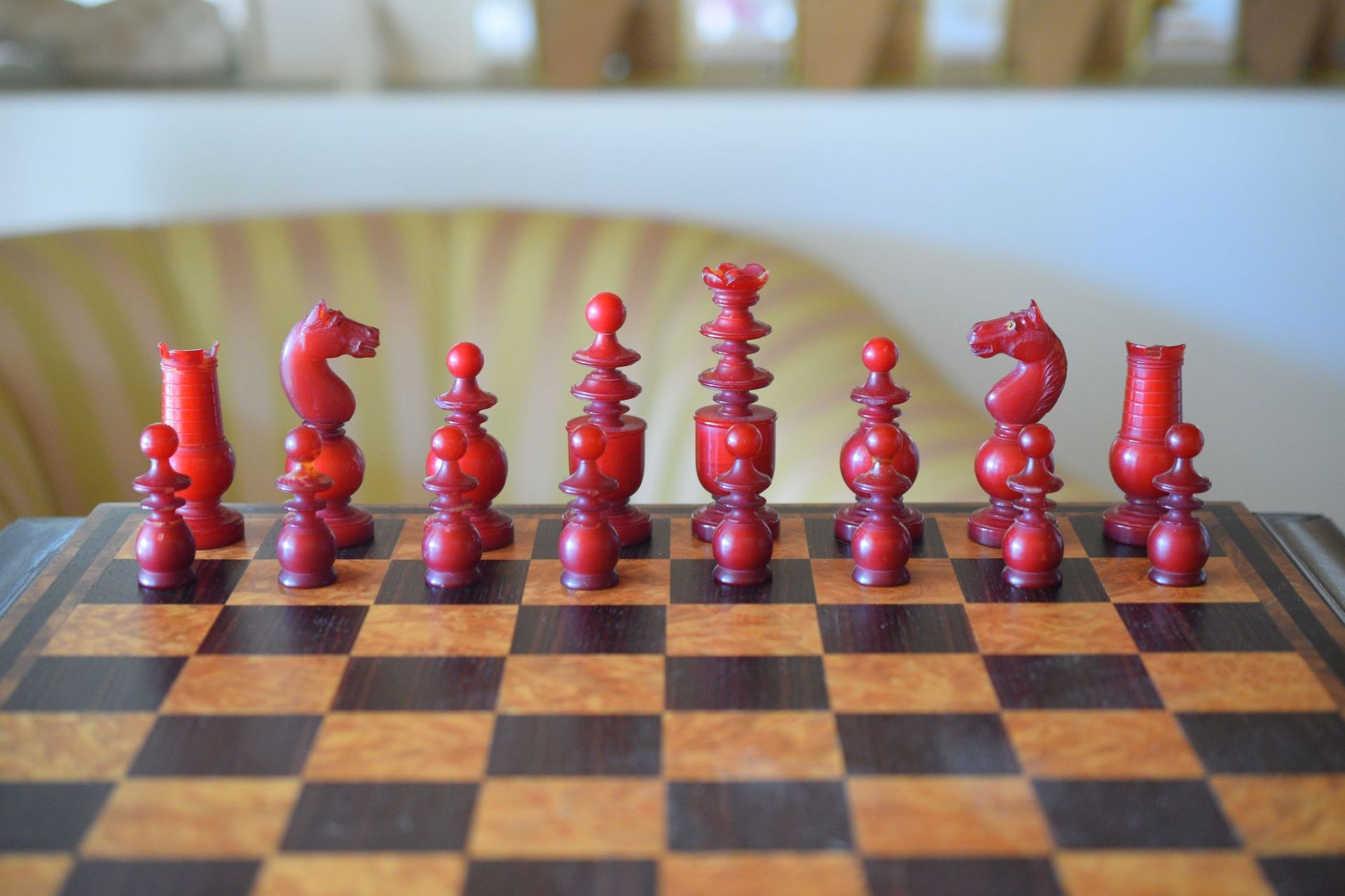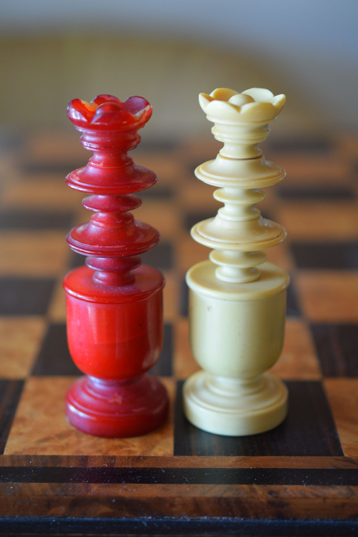A chess set with a king size of 9 cm in the French Régence style made of some type of early plastic, probably catalin or celluloid. One side ivory coloured, the other side in a rich and slightly opaque burgundy red. The pieces are quite large and heavy, which is partly due to the fact that the large pieces are made of several individual sections which are held together by a rather large and heavy metal screw. The knights with glass eyes are particularly beautiful. Unfortunately, there are some damages to the crenellations of three rooks.
