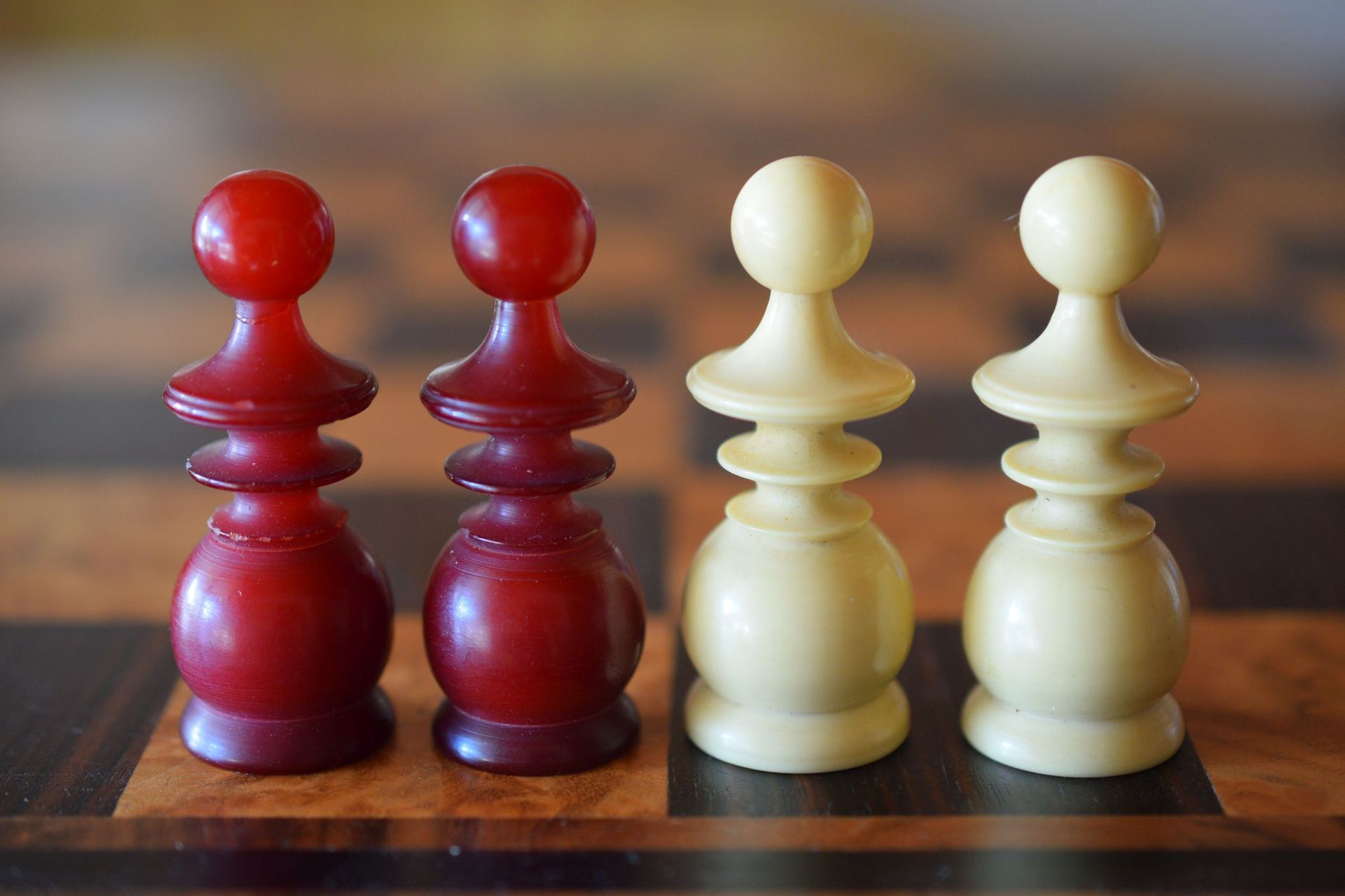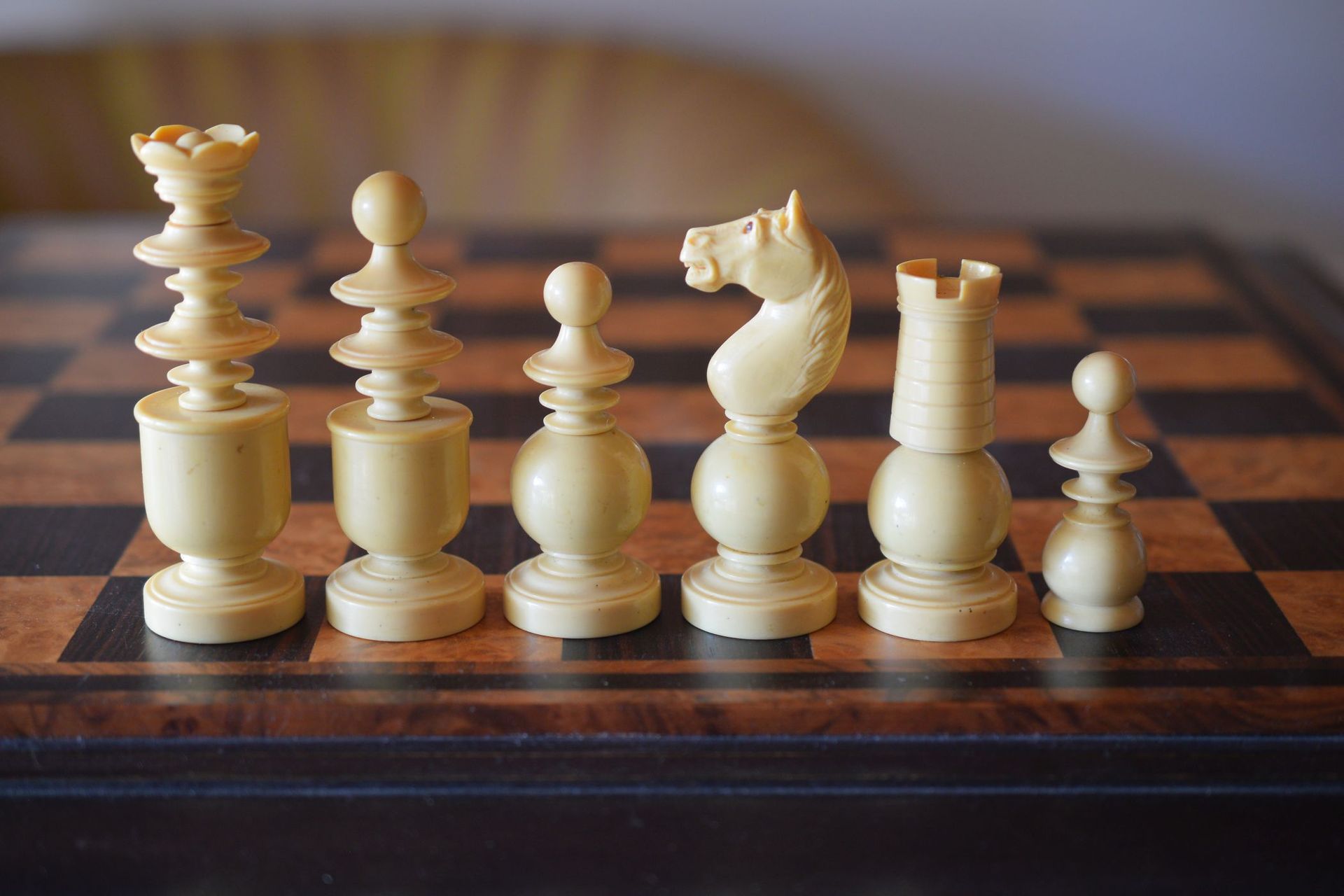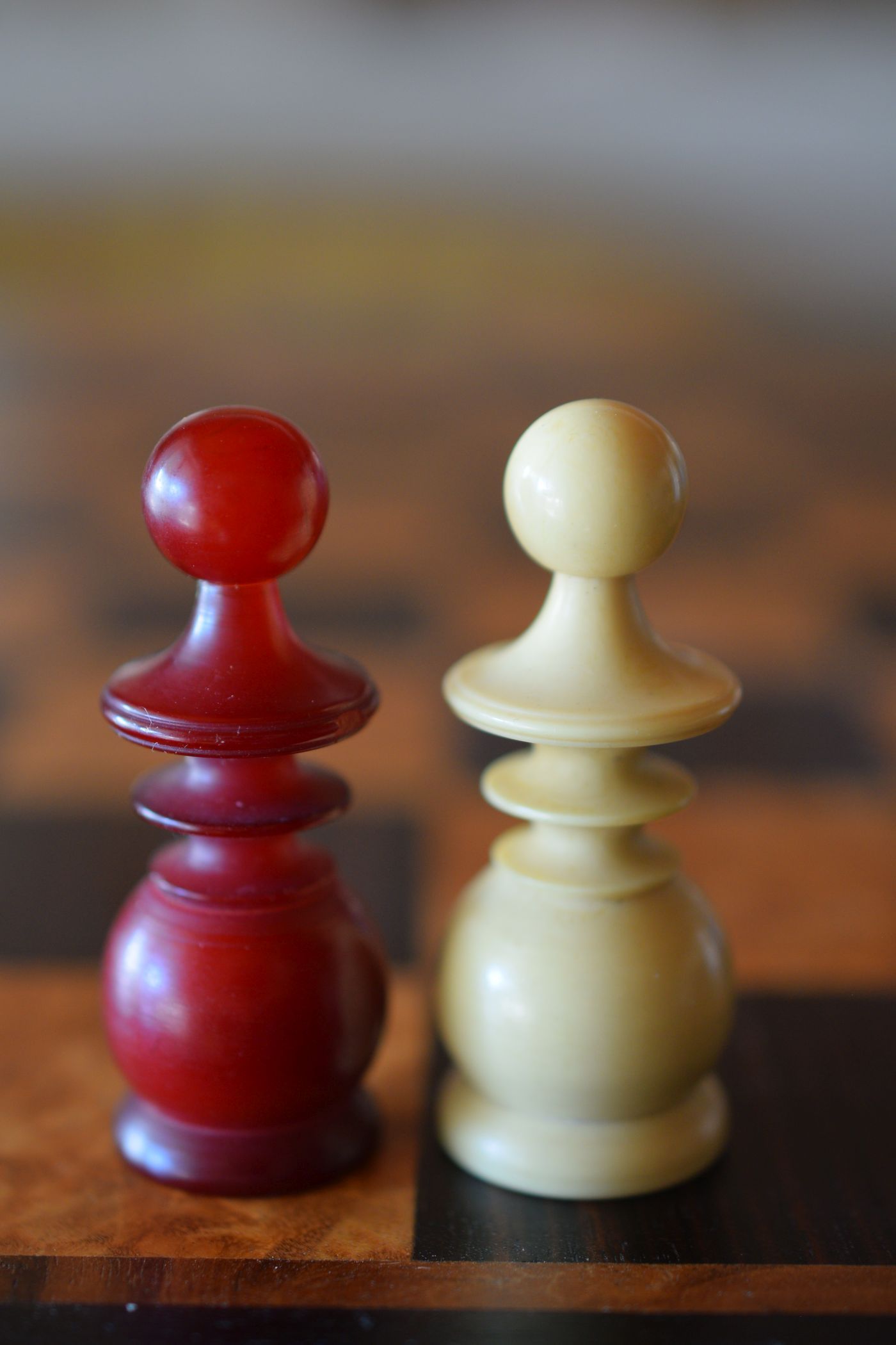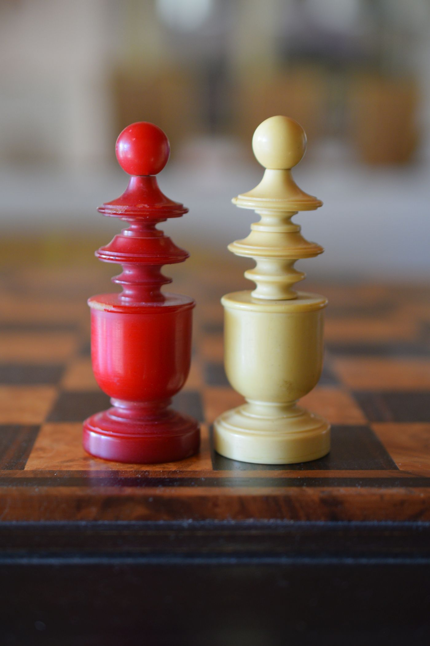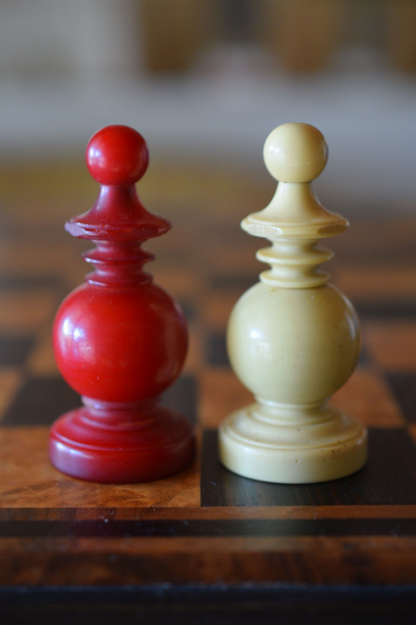 A chess set with a king size of 9 cm in the French Régence style made of some type of early plastic, probably catalin or celluloid. One side ivory coloured, the other side in a rich and slightly opaque burgundy red. The pieces are quite large and heavy, which is partly due to the fact that the large pieces are made of several individual sections which are held together by a rather large and heavy metal screw. The knights with glass eyes are particularly beautiful. Unfortunately, there are some damages to the crenellations of three rooks.