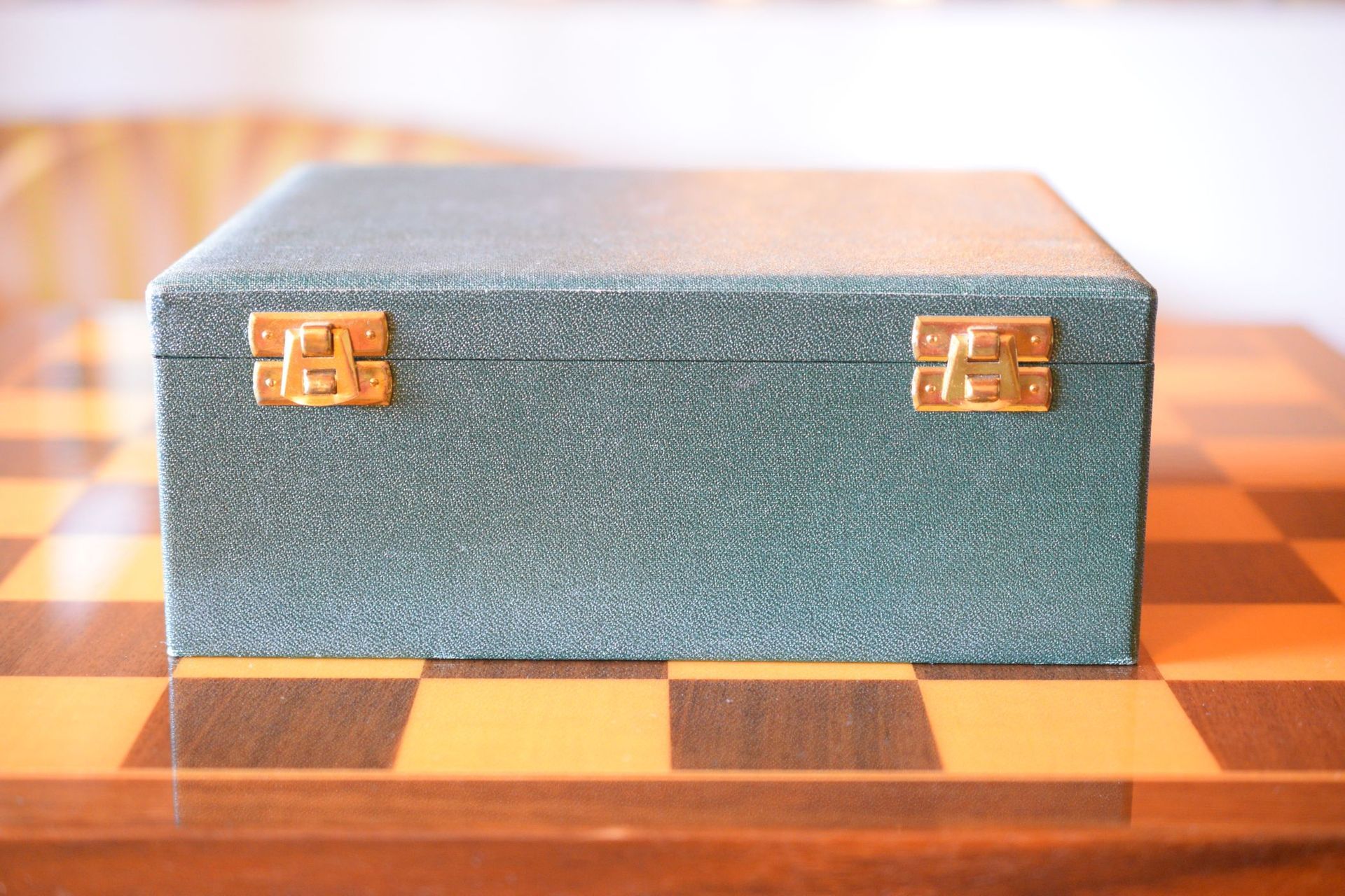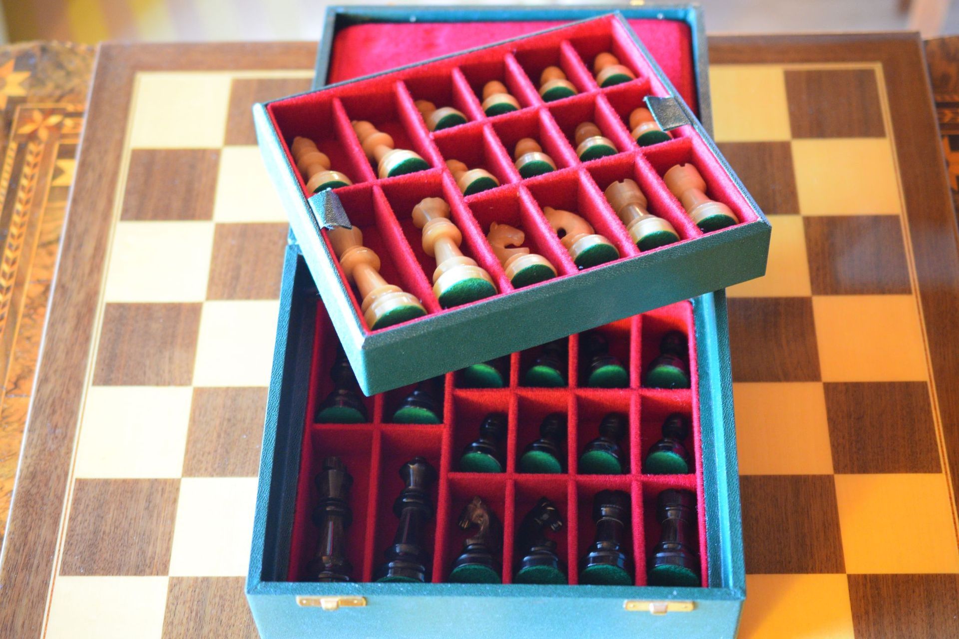 A German chess set in the Staunton pattern made of horn with a king height of 8.5 cm, probably dating to the period of 1960-1980. Chess sets made of buffalo horn were rather popular in Germany in the second half of the 20th century. Many manufacturers and dealers included such sets in their range. Horn sets were generally the luxury variant in the range and fetched significantly higher prices than conventional wooden sets. The manufacturer of the set shown here is not known, but it is an example from the upper price segment. The pieces came in a green leatherette box with two compartmented trays lined with red velvet.
