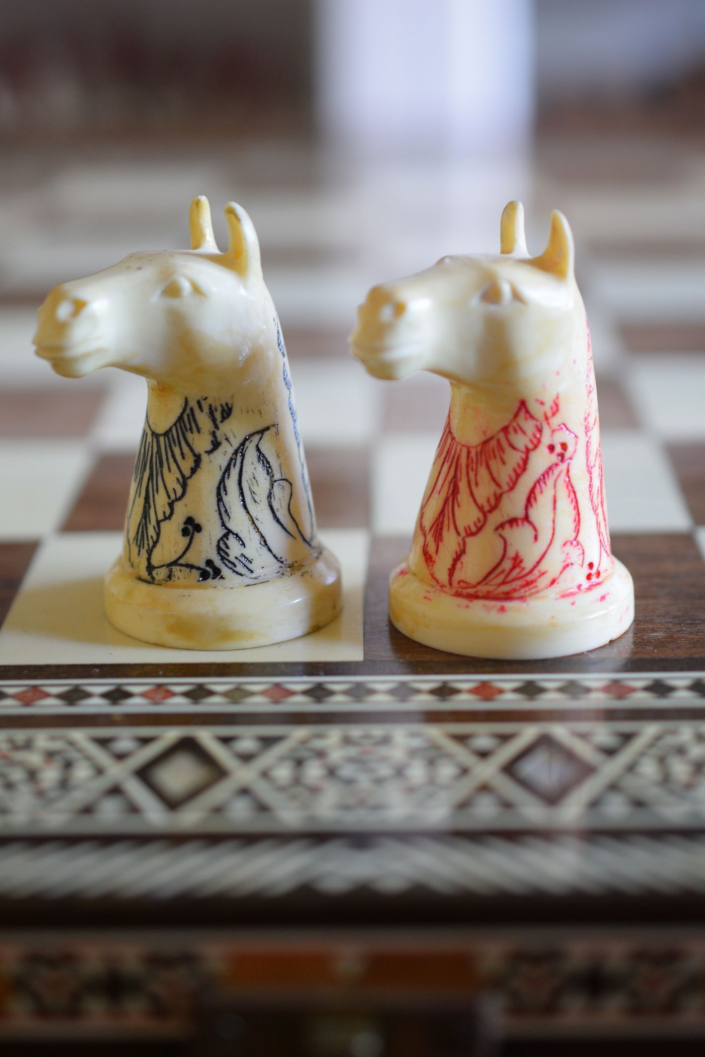 An Indian chess set designed and made by Umesh Kansara from Rajasthan. The pieces are made of camel bone in the style of a Sahib bust set. One side with dark blue decorations, the other with reddish-pink decorations. The king size is 7.3 cm. As common in traditional Indian style sets, the rooks are elephants, the knights are horses and the bishops are camels, the latter in a very unusual design, though. I came by the set by pure chance as Umesh was making some replacement parts for me and offered to include this chess set for a decent price. One could therefore say, I got it "en passant". A very decorative set!