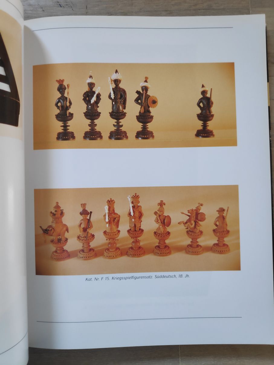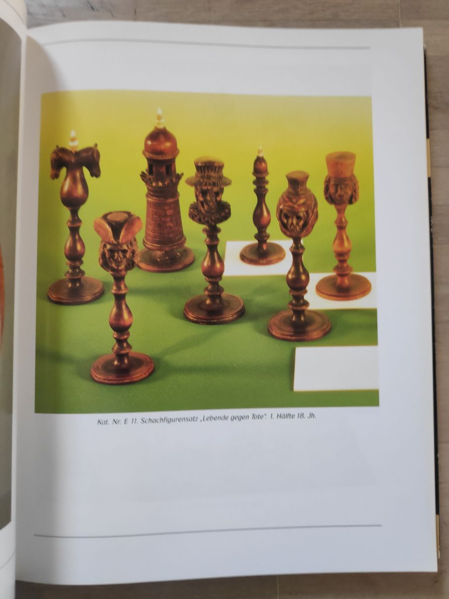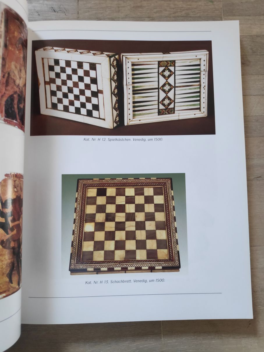 This is a catalogue on an exhibition from 29 July to 25 September 1994 in Museum Schloss Rheydt. The exhibition - as the title indicates - was dedicated to the art and cultural history of board and card games in the 15th to 17th century. While not an exclusive topic, chess is featured in large parts of the publication including a large variety of high quality pictures of antique chess sets and boards.