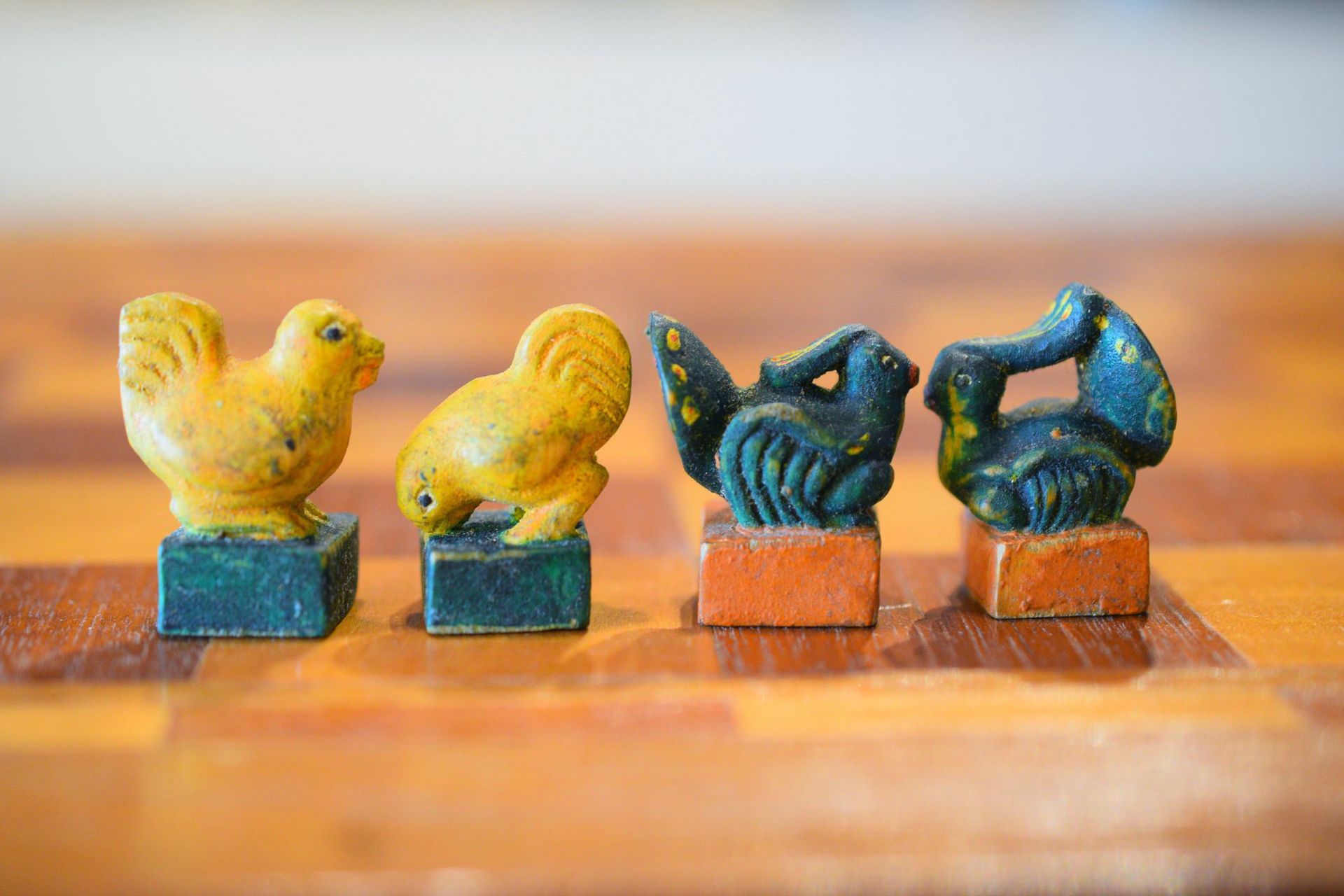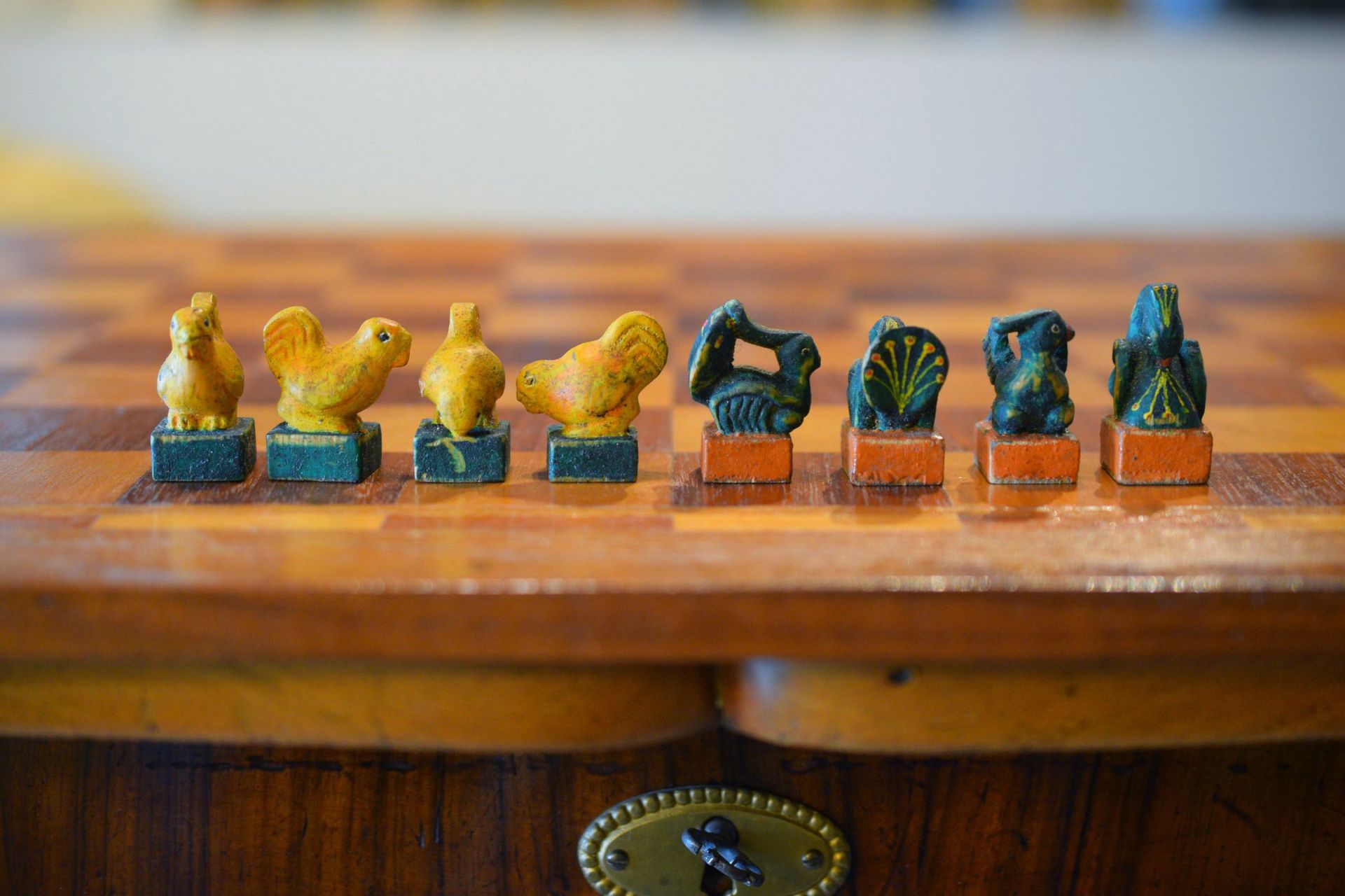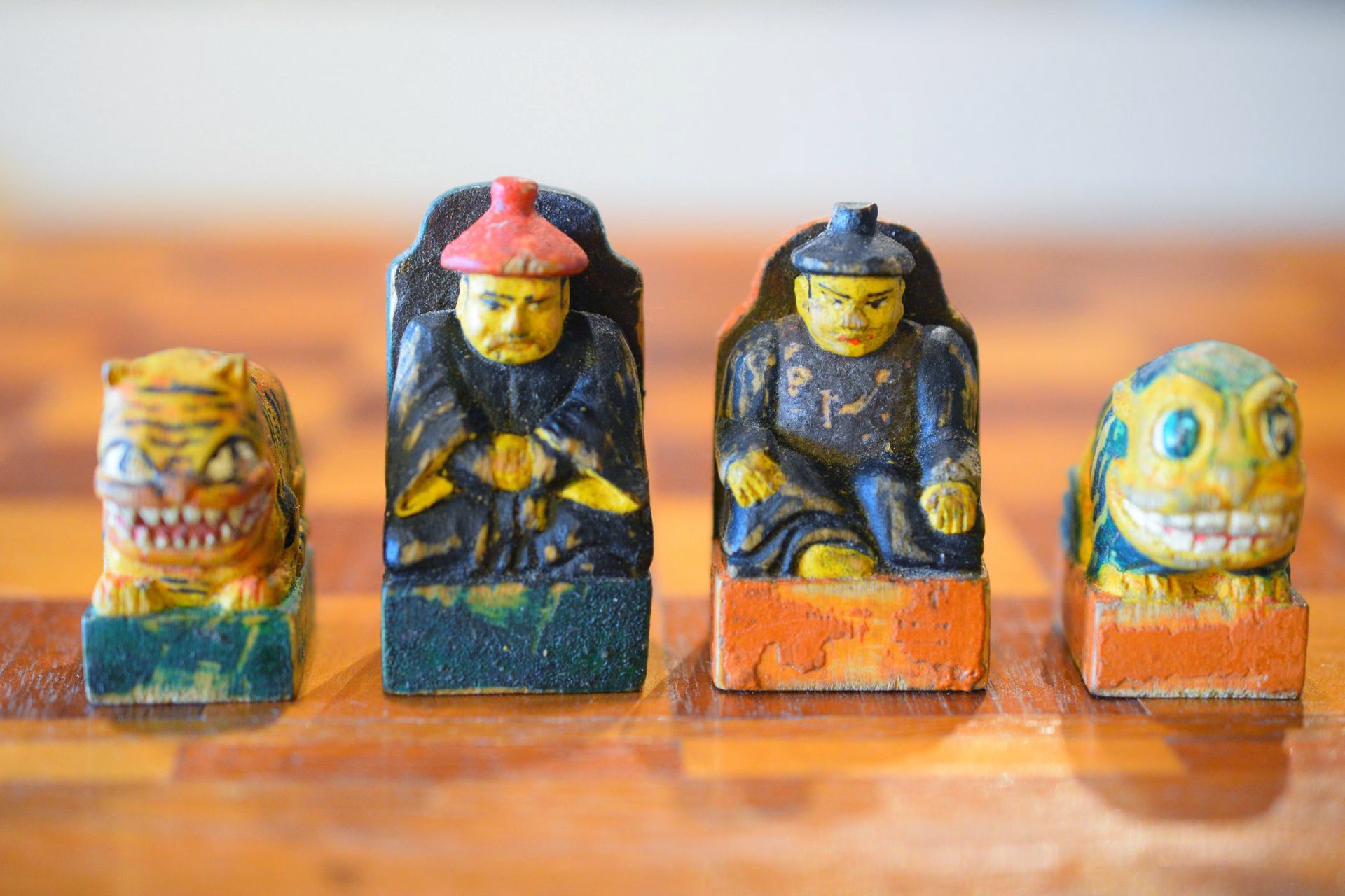 A small figural shatar set, which was made in Mongolia in the early 20th century. These sets are traditionally very small with a king size of just a few centimeters, but are often decorated in lively colours and sought after by collectors due to their rarity. Mongolian shatar sets come in a variety of forms, many of which have been researched and described in more detail by fellow collector Rodolfo Pozzi. With his