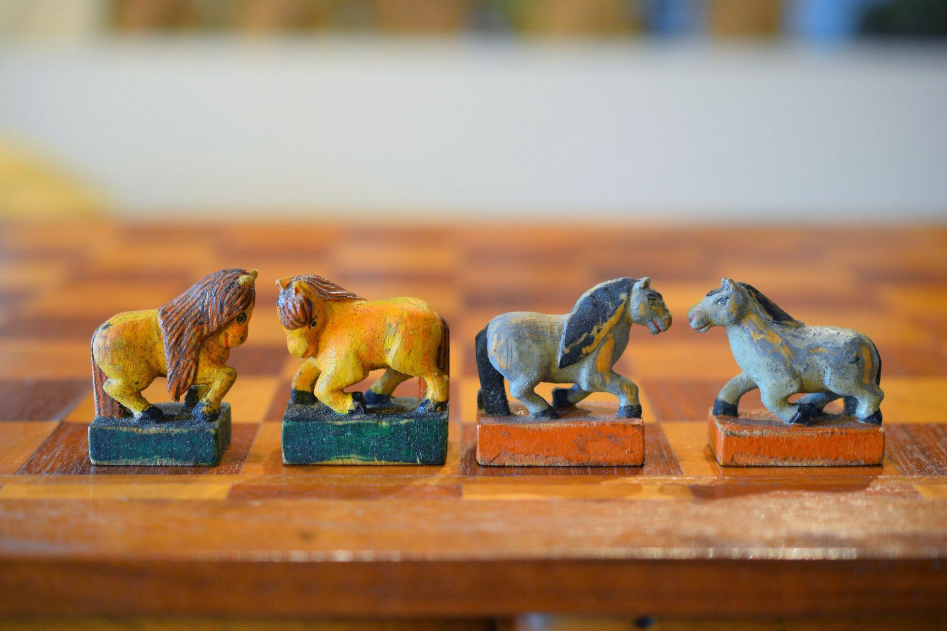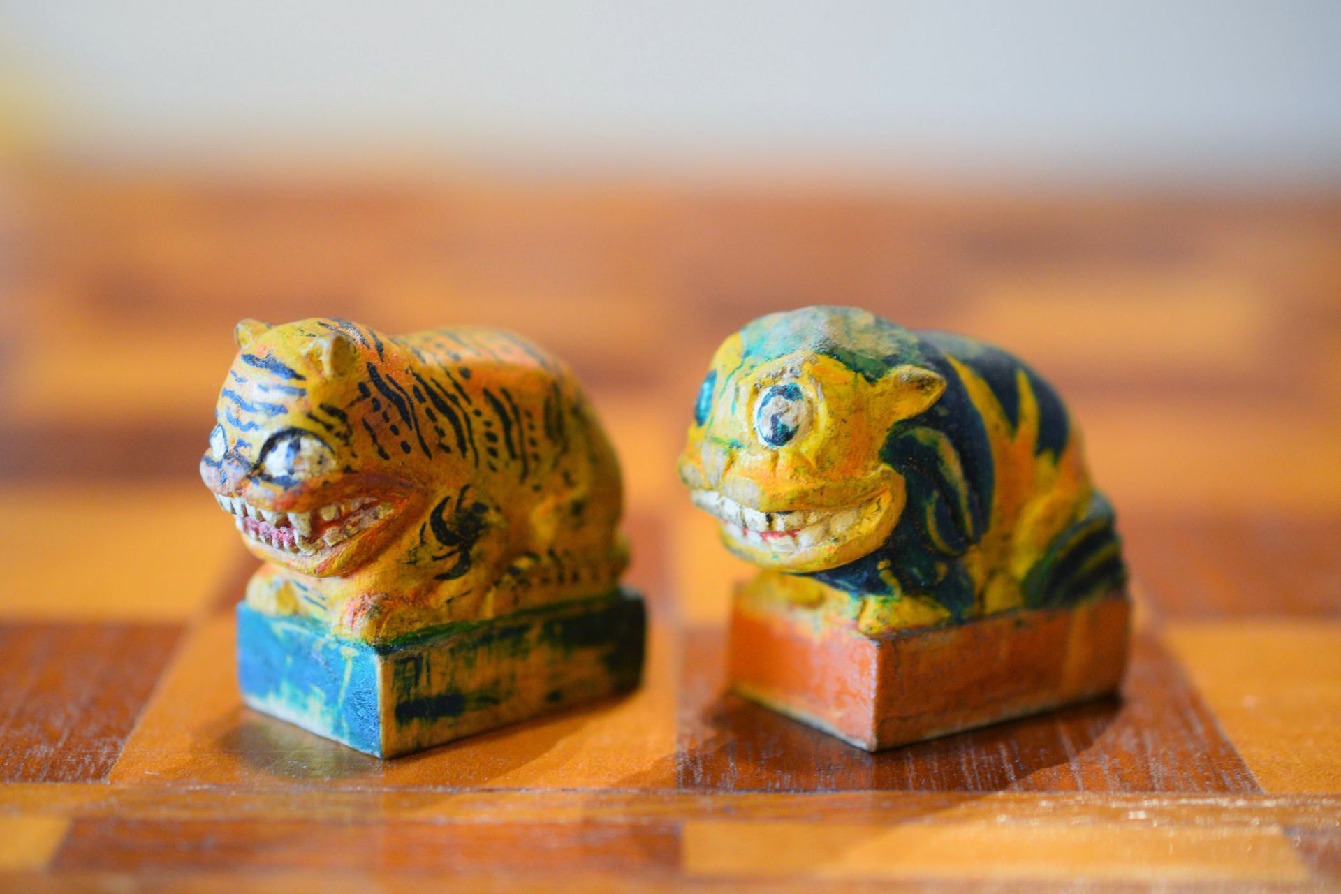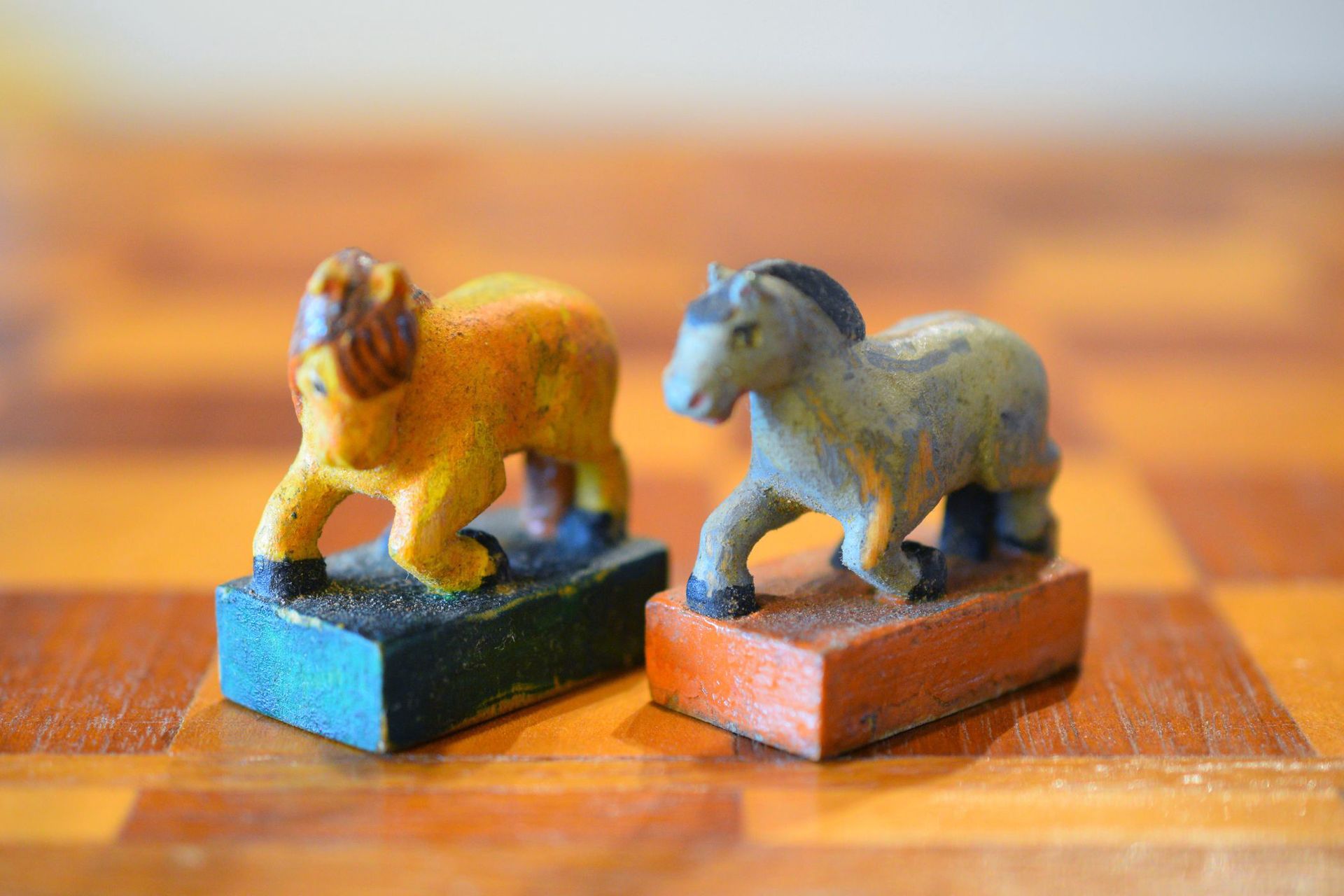 A small figural shatar set, which was made in Mongolia in the early 20th century. These sets are traditionally very small with a king size of just a few centimeters, but are often decorated in lively colours and sought after by collectors due to their rarity. Mongolian shatar sets come in a variety of forms, many of which have been researched and described in more detail by fellow collector Rodolfo Pozzi. With his