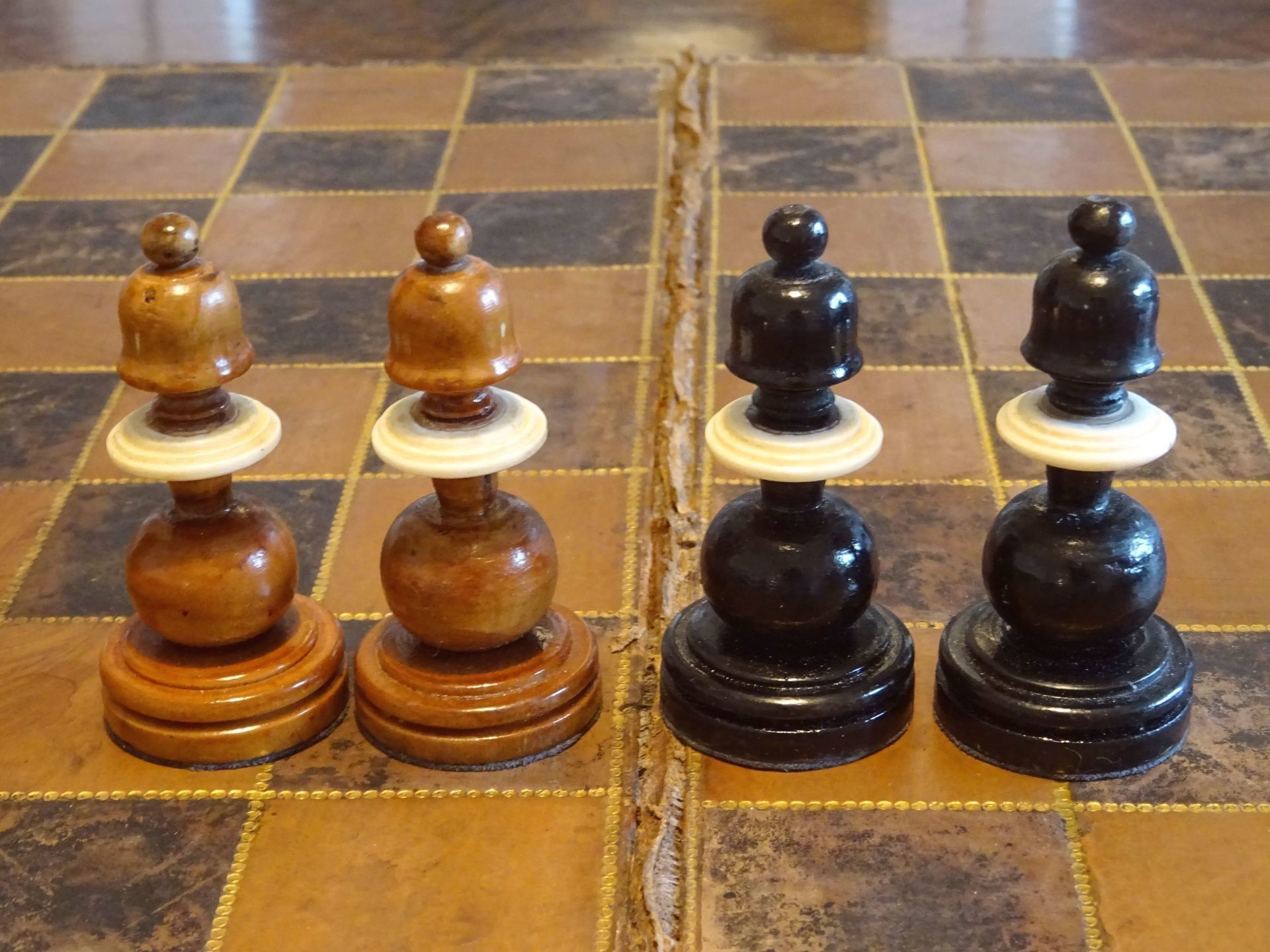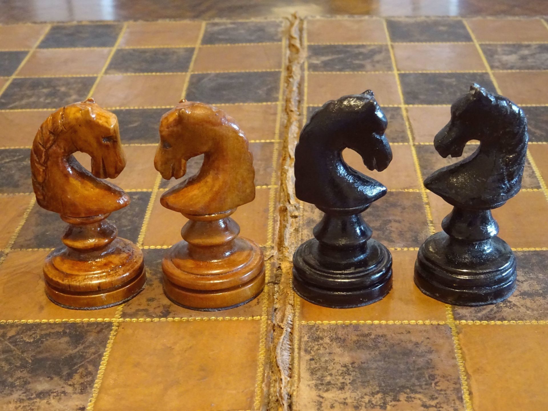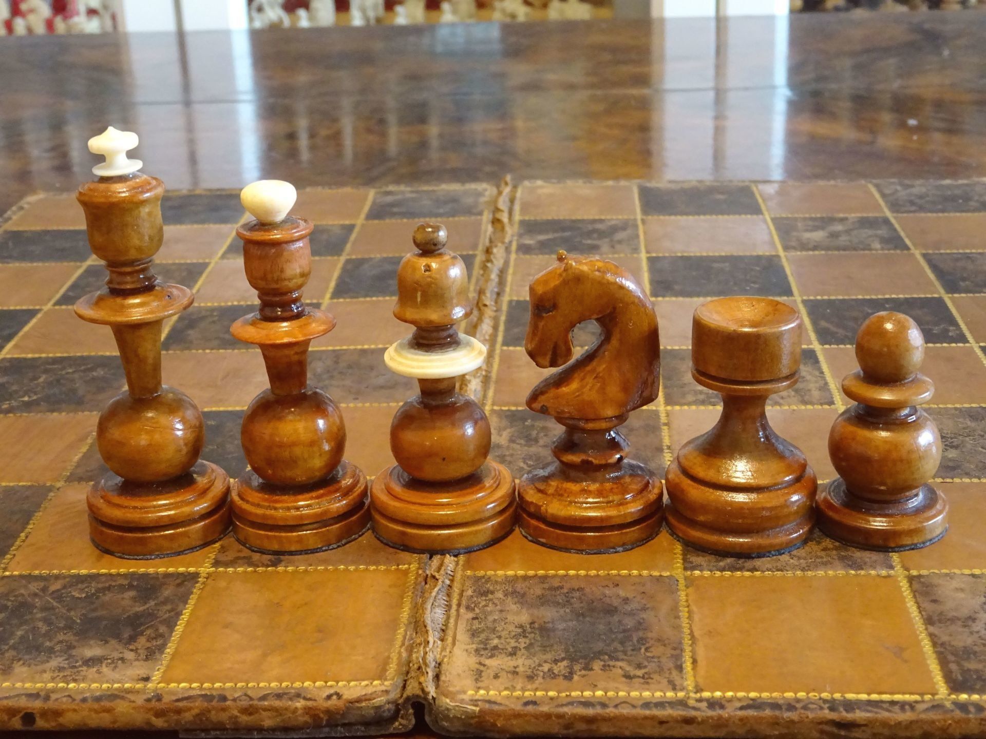 I believe this set to be of Russian origin, probably also Eastern European, and dating back to the early 20th century. In particular the design of the rooks and knights shows similarities with Russian sets. Kings, queens, bishops and pawns with bulbous bodies. The kings do not have cross finials, but come with onion shaped finials, the queens with knob finials, both turned of bovine bone. The bishops with helmet shaped heads with knob finials and collars made of bone. In particular, the combination of wood and bone is a very rare feature unknown to me in later Russian chess sets.