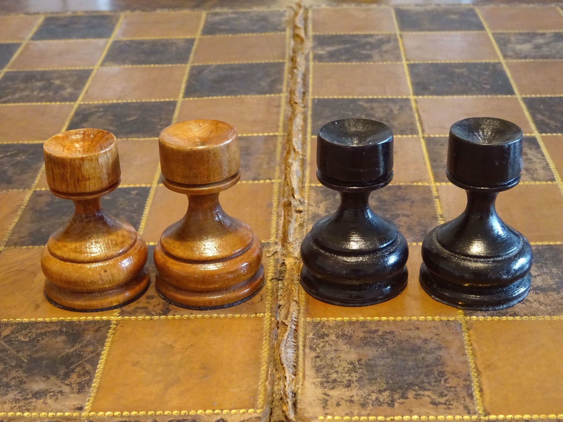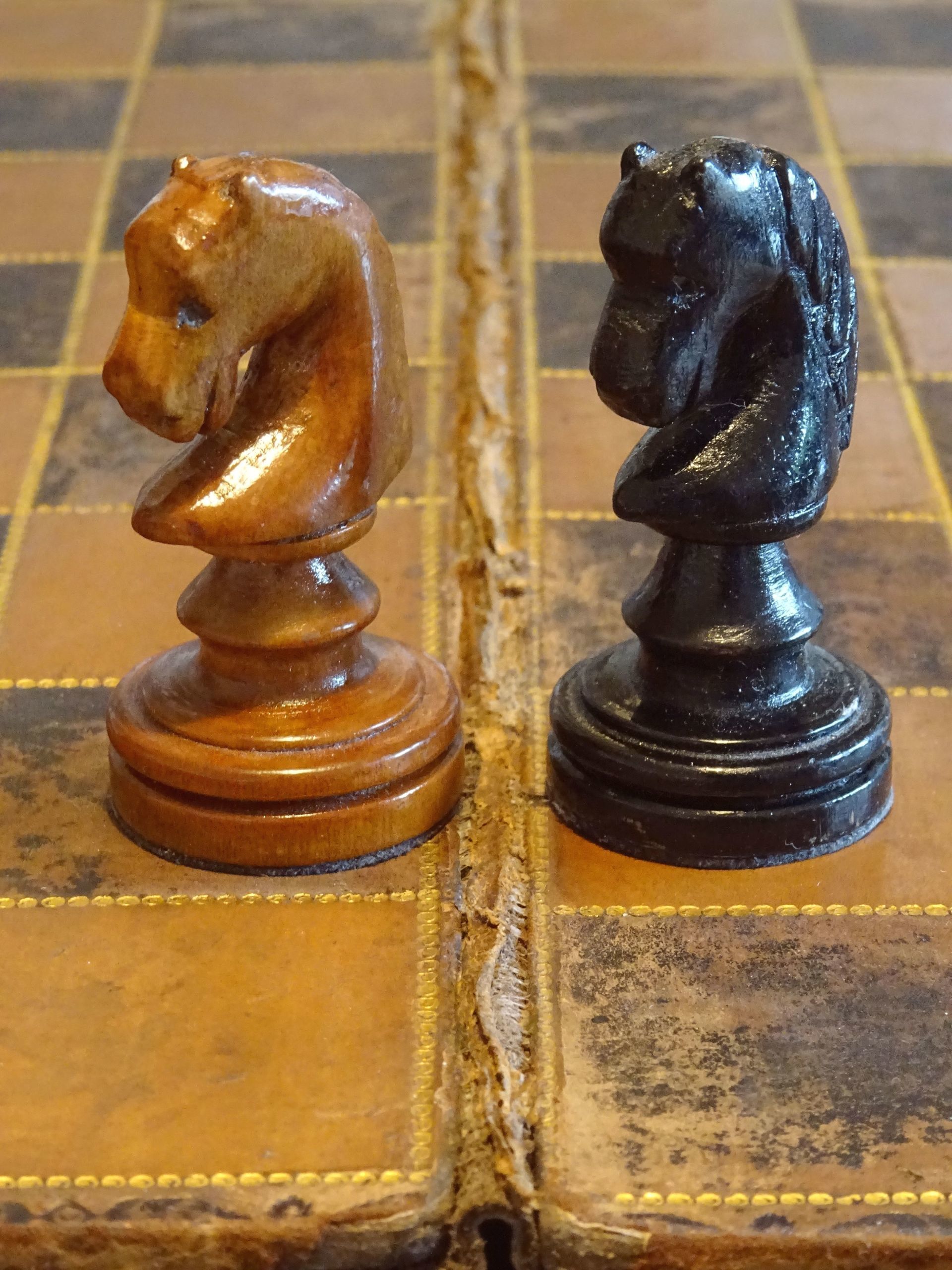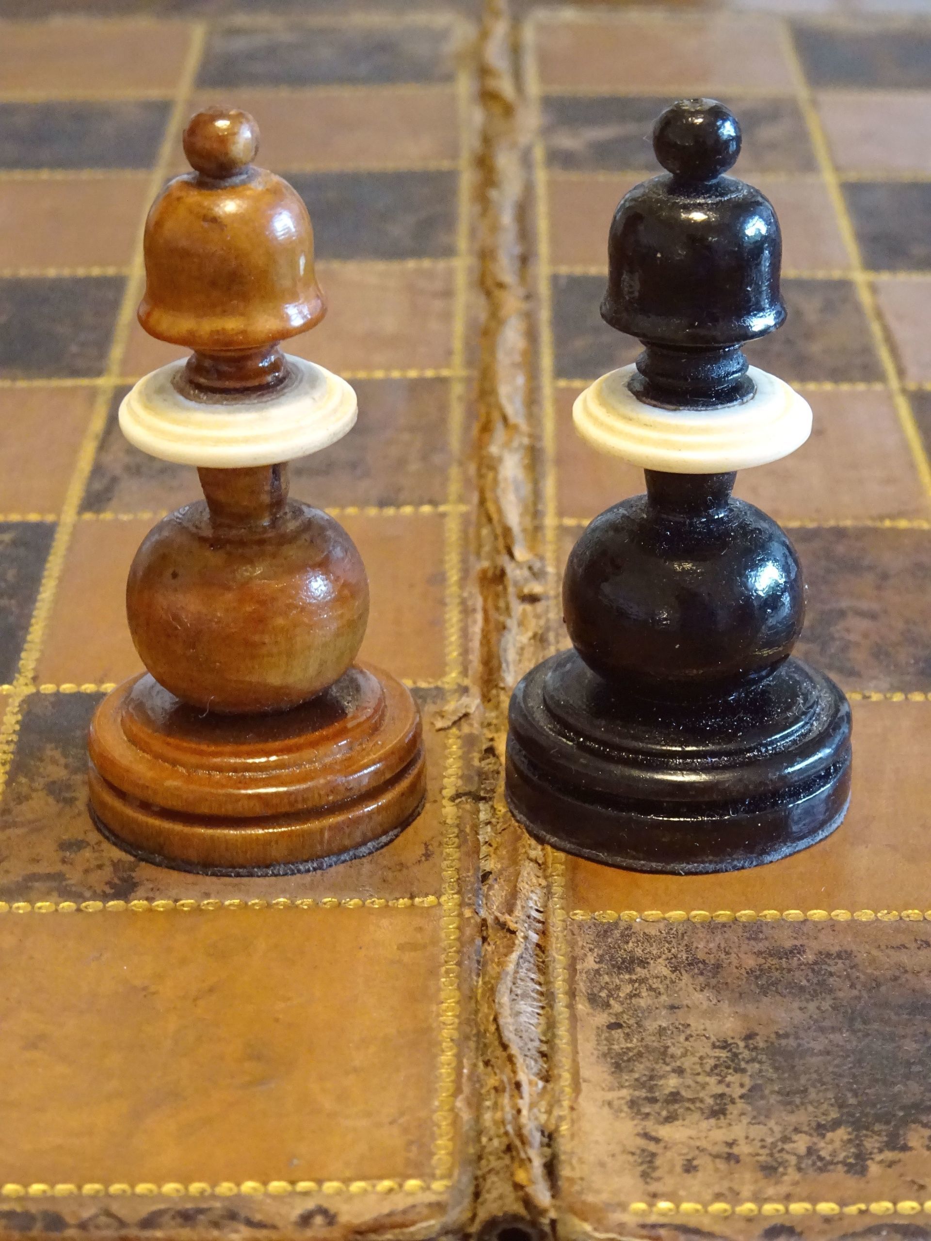 I believe this set to be of Russian origin, probably also Eastern European, and dating back to the early 20th century. In particular the design of the rooks and knights shows similarities with Russian sets. Kings, queens, bishops and pawns with bulbous bodies. The kings do not have cross finials, but come with onion shaped finials, the queens with knob finials, both turned of bovine bone. The bishops with helmet shaped heads with knob finials and collars made of bone. In particular, the combination of wood and bone is a very rare feature unknown to me in later Russian chess sets.