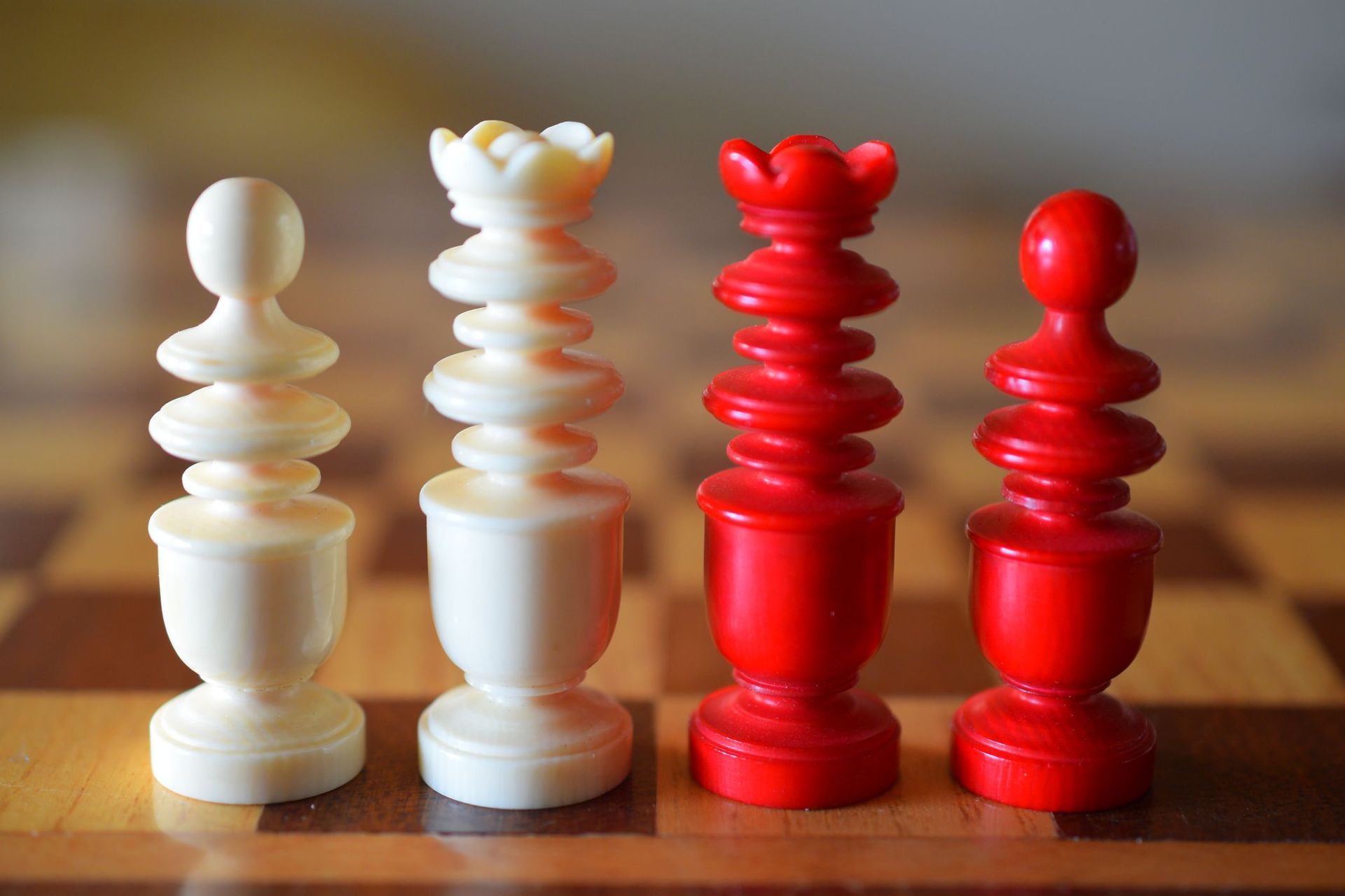 A small chess set with a king size of only 5 cm in the French Régence style made of ivory, one side natural, the other side stained in bright red. The set came in a fitted box laid out with reddish brown satin and was presumably made around 1930. The outside of the lid is imprinted with "Lewis Le Bouvier", which most likely was the name of the original owner. However, so far I could not find out anything about him.