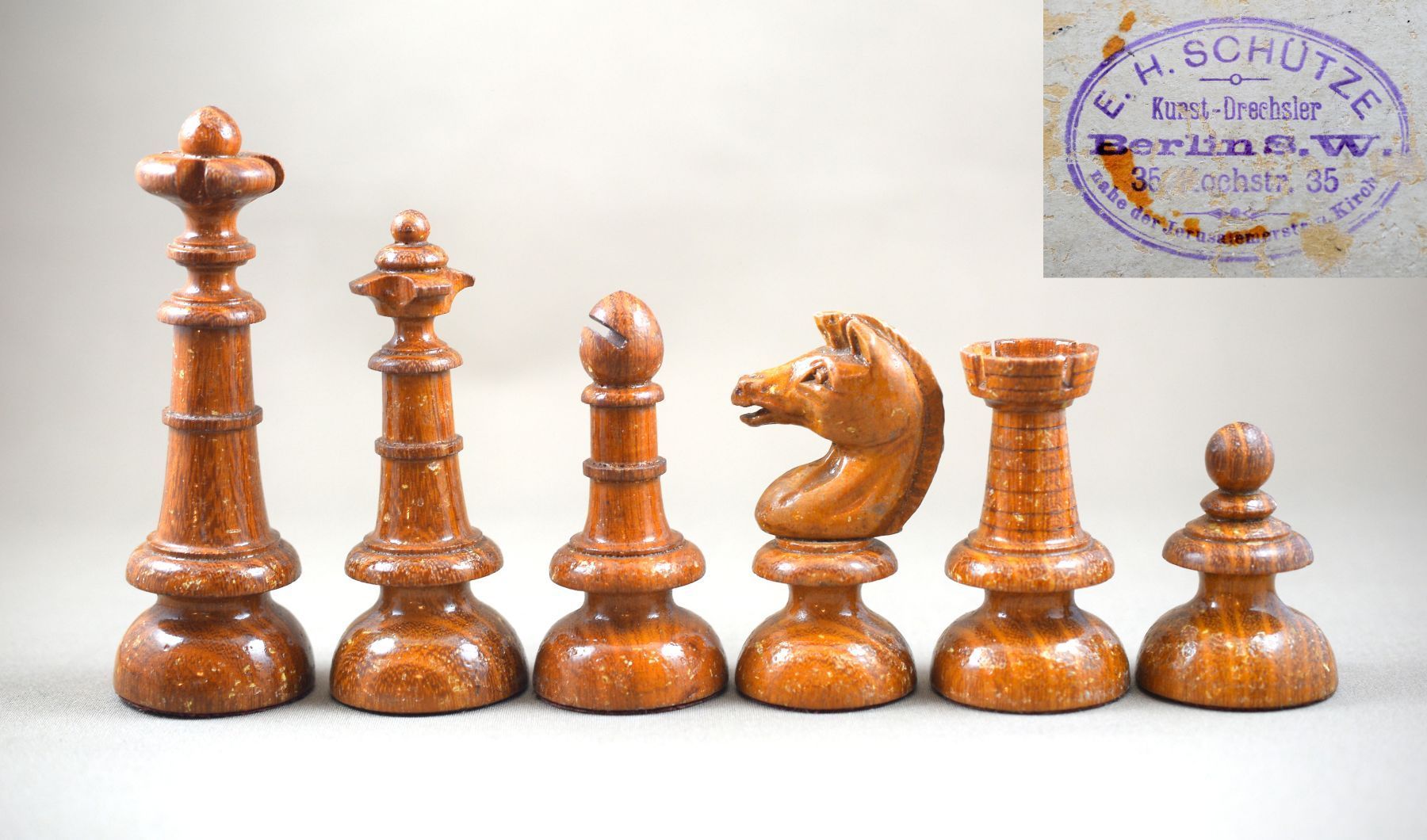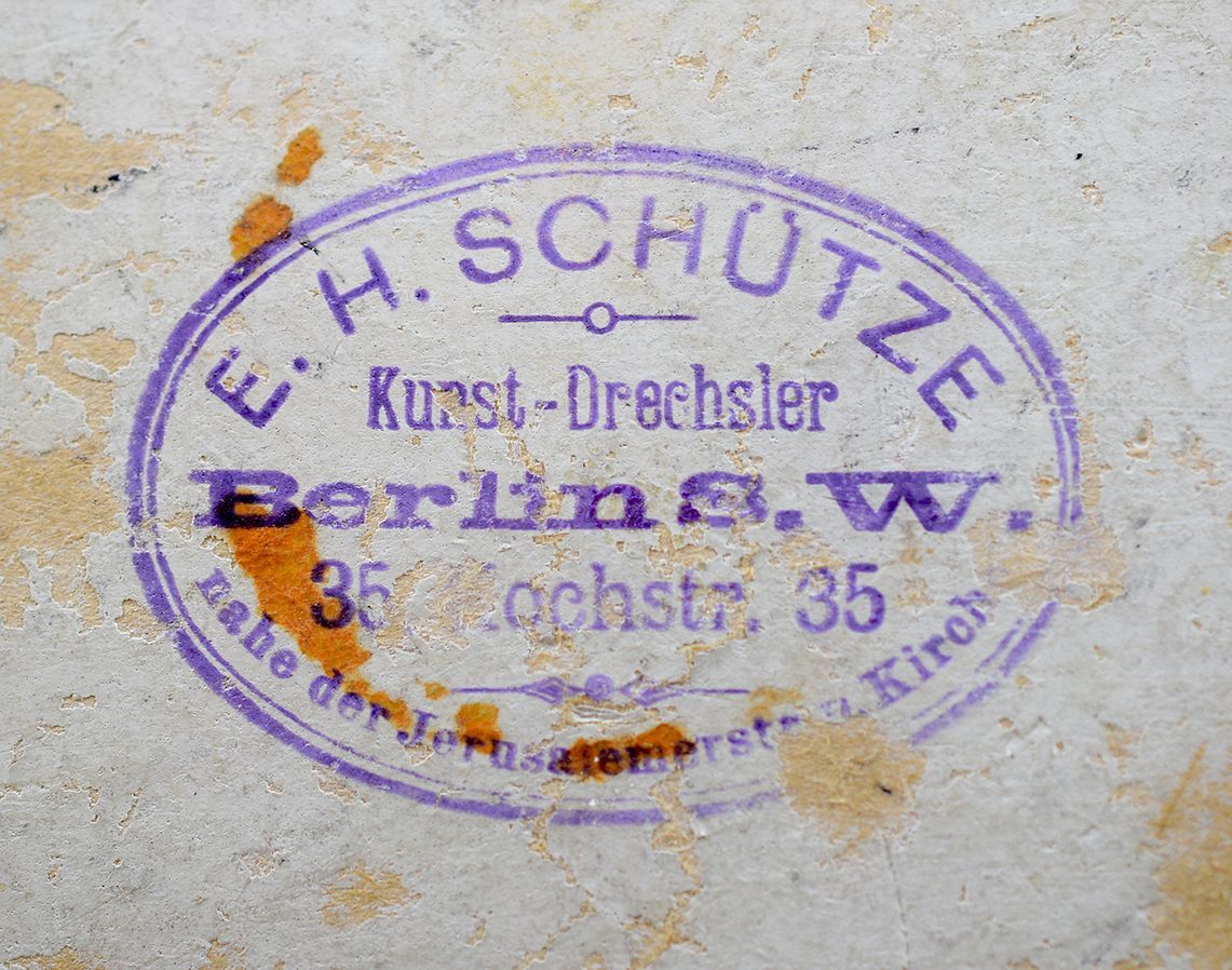 Not much information can be found on Schütze, other than that he was a 19th century turner from Berlin. The stamp reads "E. H. Schütze Kunst-Drechsler, Berlin S.W. Kochstr. 35 nahe der Jerusalemerstr. a. Kirch***", which refers to his profession of art turner (Kunst-Drechsler) as well as to a workshop located at Kochstr. 35 near Jerusalemer Str. by the church. The latter is likely to refer to the Jerusalem Church, which was just a few houses down the street.