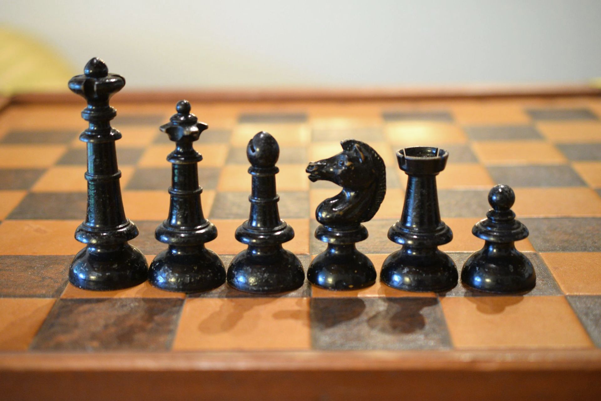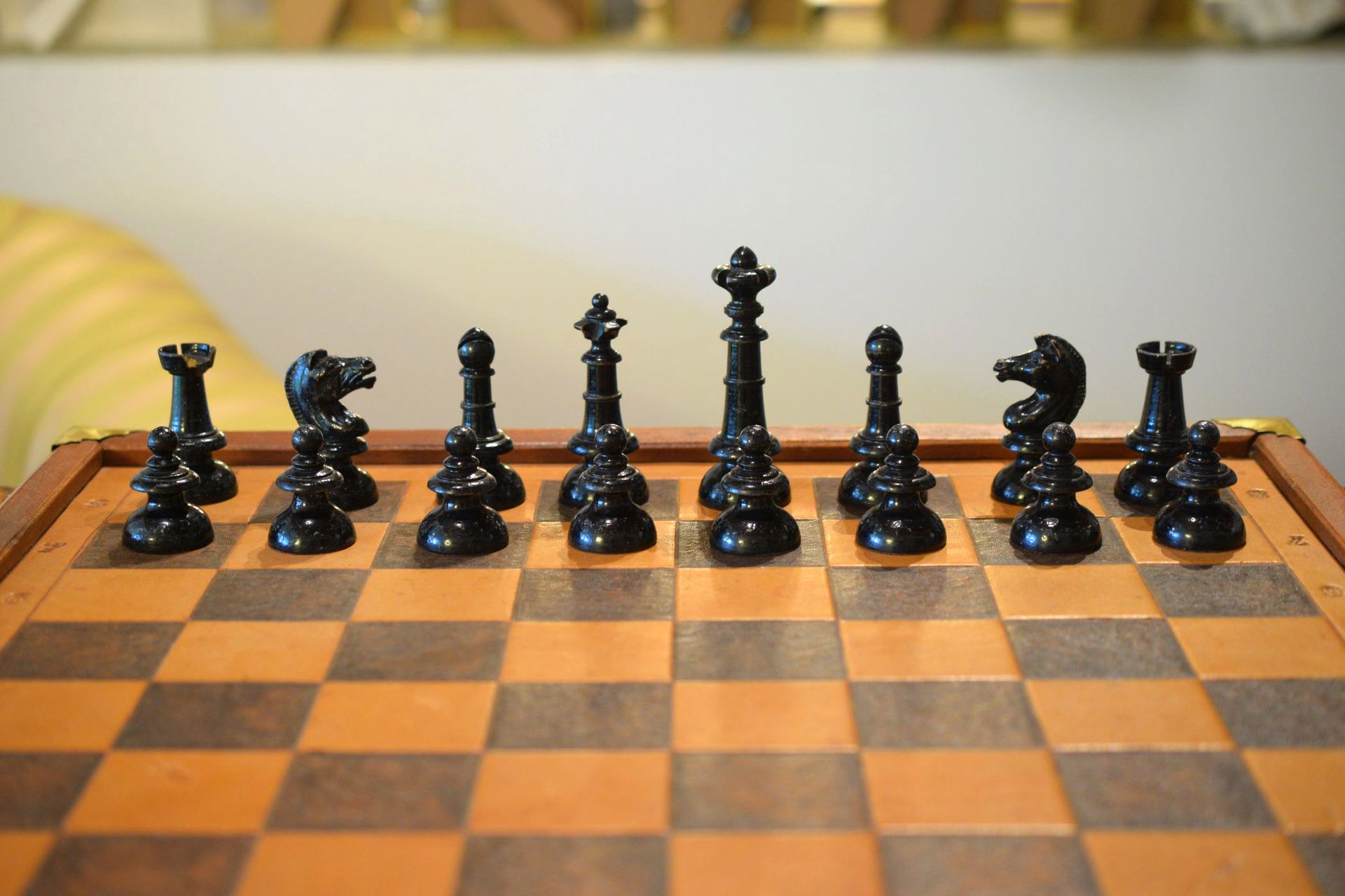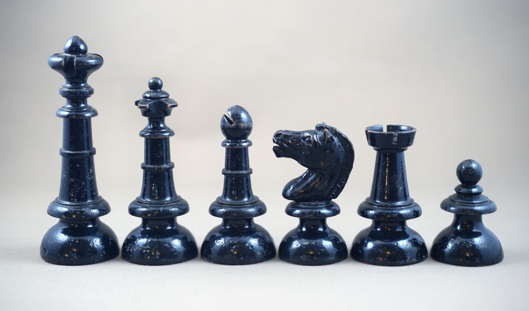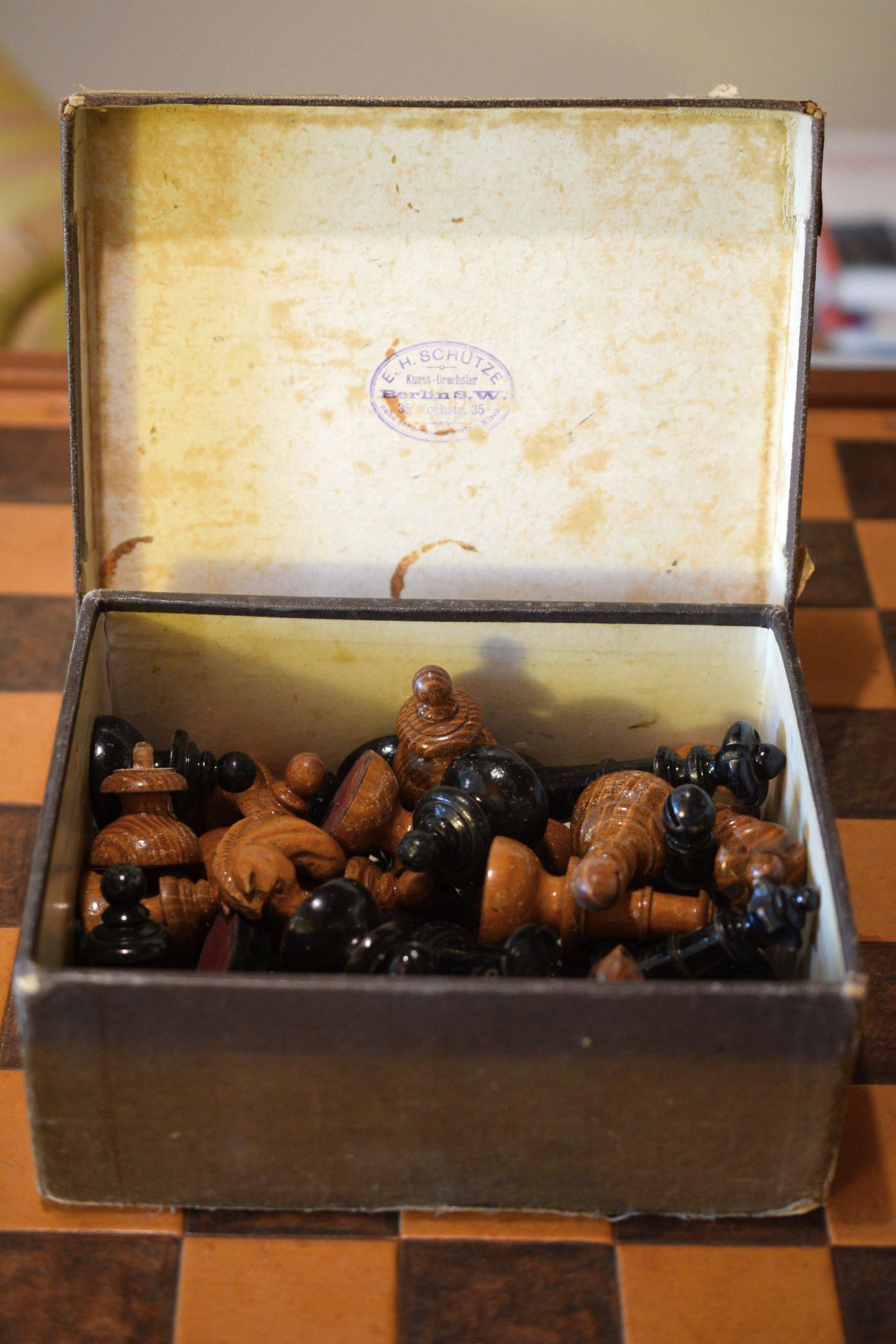 This is a chess set made by E. H. Schütze presumably in the late 19th century. The pieces with a king size of 10.2 cm are made of wood, one side lacquered in brown, the other side in black. The design reminds slightly of the Austrian Coffee House style. The peculiar design of the knights, but also the slender shape of the rooks is noteworthy. The set came in the original carton box with stamps of E. H. Schütze on the inside of the lid and the bottom of the box.