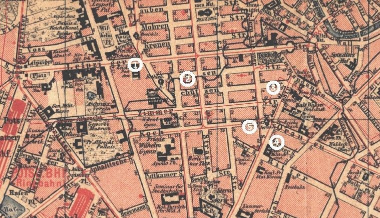 I found a few entries in the Berlin address books. Schütze first appears in the Berlin address books in 1850 with premises at the address Leipziger Str. 16 (indicated on the map shown below with ①), very centrally located on the property on which the “Reichspostamt” (Imperial Post Office) was later built from 1871 to 1874. In the following two decades, he frequently changed address, but always moved within a narrow radius of about 1 km. From 1859 to 1864, he is listed under the address Krausenstr. 9 (indicated on the map with ②). Krausenstrasse runs parallel to Leipziger Strasse, and house number 9 was only about 100 m from his previous address. In 1865, Schützenstr. 31 (indicated on the map with ③) is briefly given as the business address. From 1866 until the end of March 1873, Schütze's woodturning workshop is registered at the address Feilnerstr. 11 (indicated on the map with ④), directly next to the military prison southeast of the Jerusalem Church. In April 1873, he finally moved into premises at Kochstr. 35 (indicated on the map with ⑤), which was directly west of the Jerusalem Church. From then on, these premises were also kept by his successors. Schütze was listed as the owner of the shop until 1889. From 1890 to 1903, his heirs, Robert and Franz Schütze, are listed as proprietors. For a short period from 1904 to 1907, Franz Schütze and Georg Lamerdin are listed as proprietors. From 1908 onwards, Georg Lamerdin was the sole proprietor of the shop. It is not clear how long the business was actively operated. Towards the end of the 1930s, the traces are lost. However, the company name of the founder "E. H. Schütze" was retained throughout the entire period.