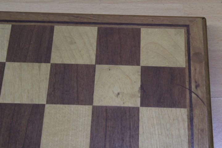 I acquired it from something in between an antiques dealer and a junk shop. The board was full of scratches and stains and all in all rather dull looking. After buying it, I gave it a proper sanding to remove the scratches and stains and the polished it to a high gloss finish with a ruby french polish to bring the colour back to the wood. Some "before" and "after" pictures are shown below, as well as the result of my work.