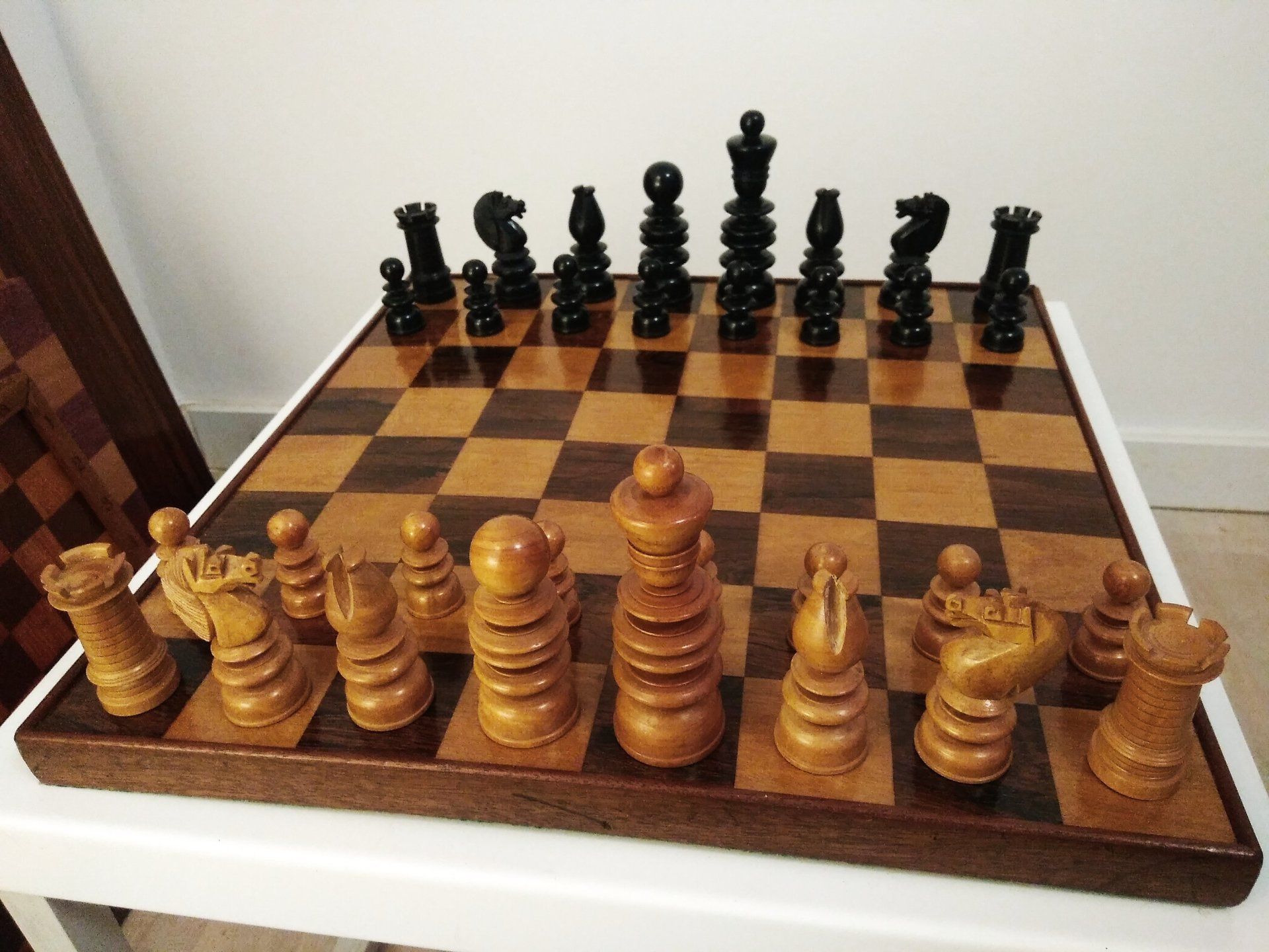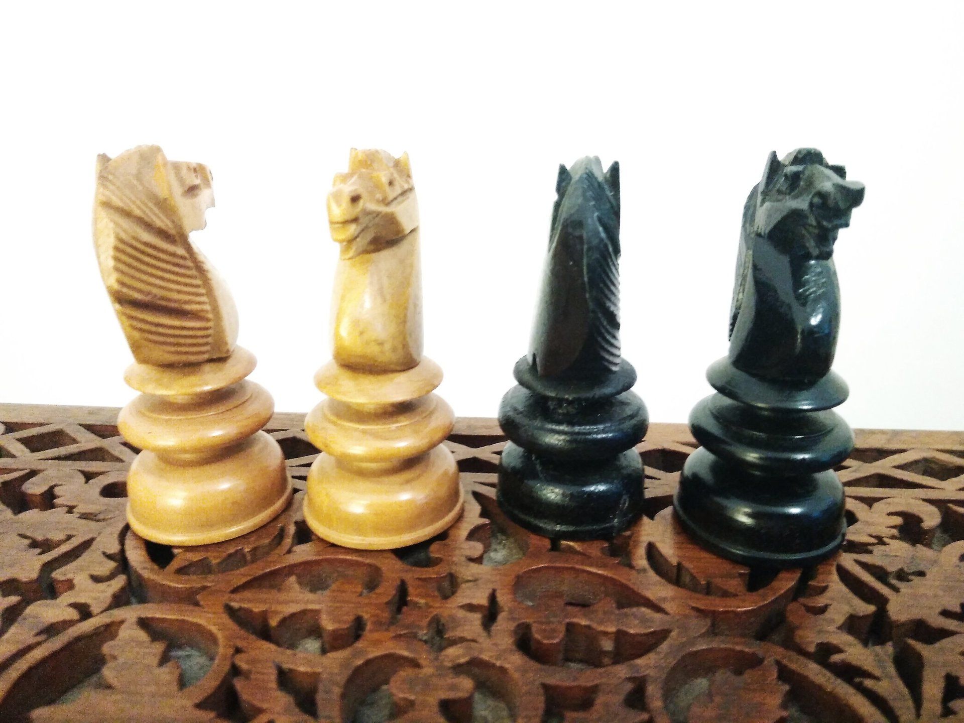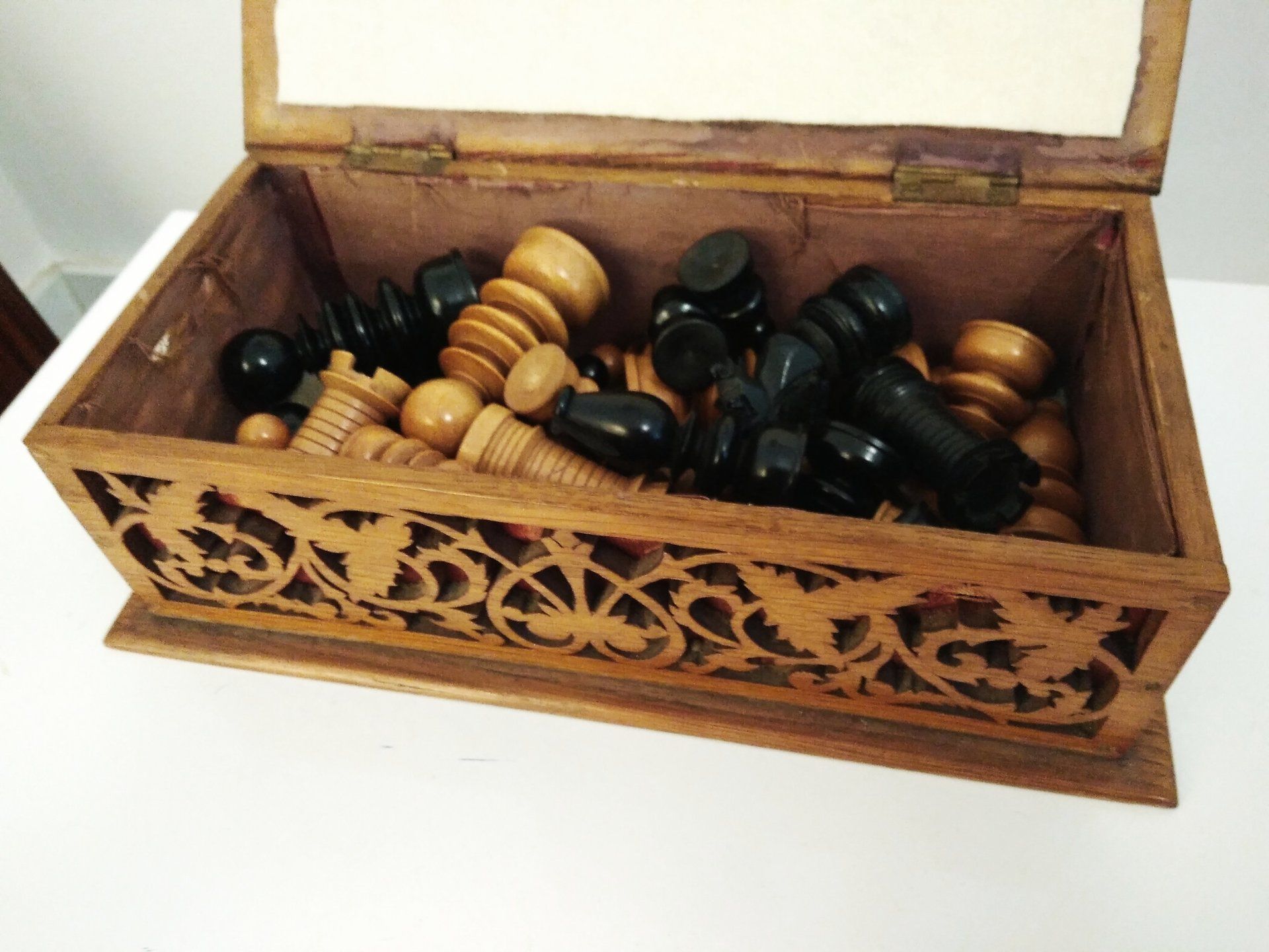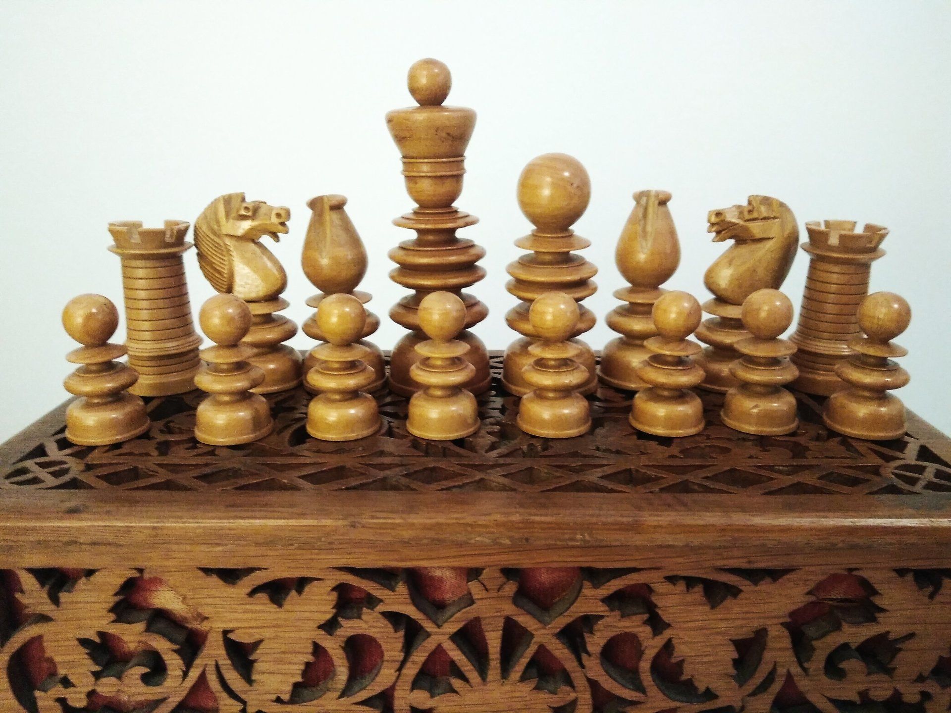 Antique English "St. George" pattern chess set in club size following the design introduced by the St. George Chess Club in London in the late 18th century. King size is 4".