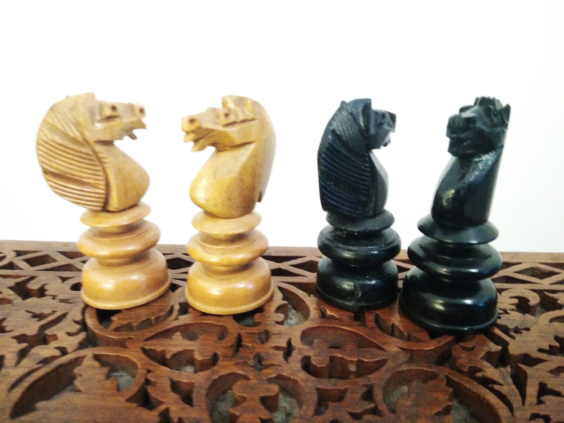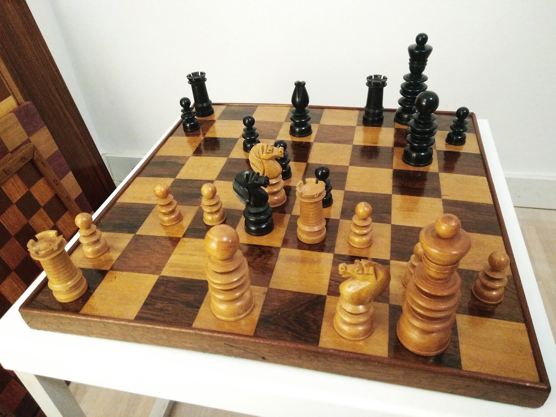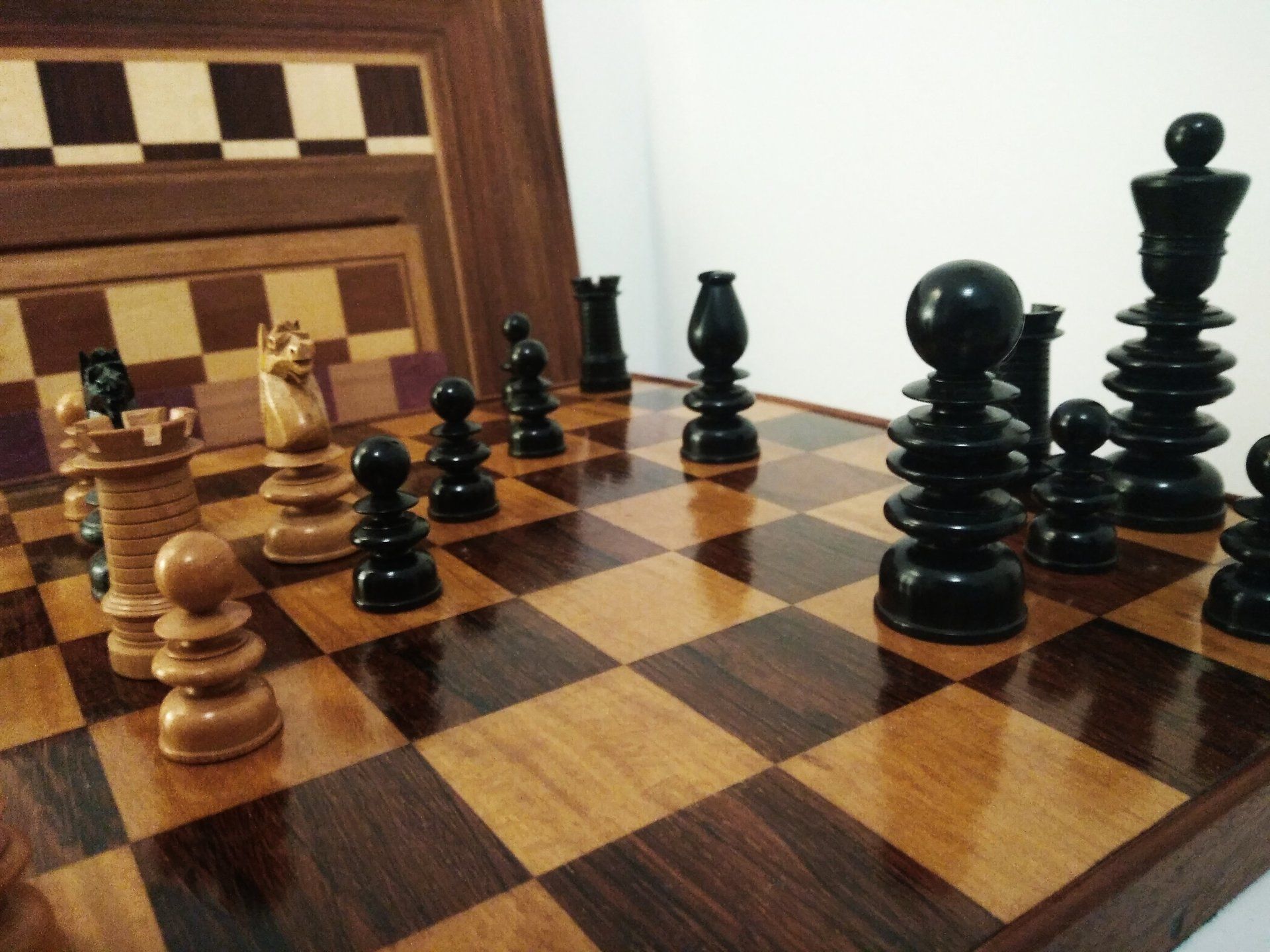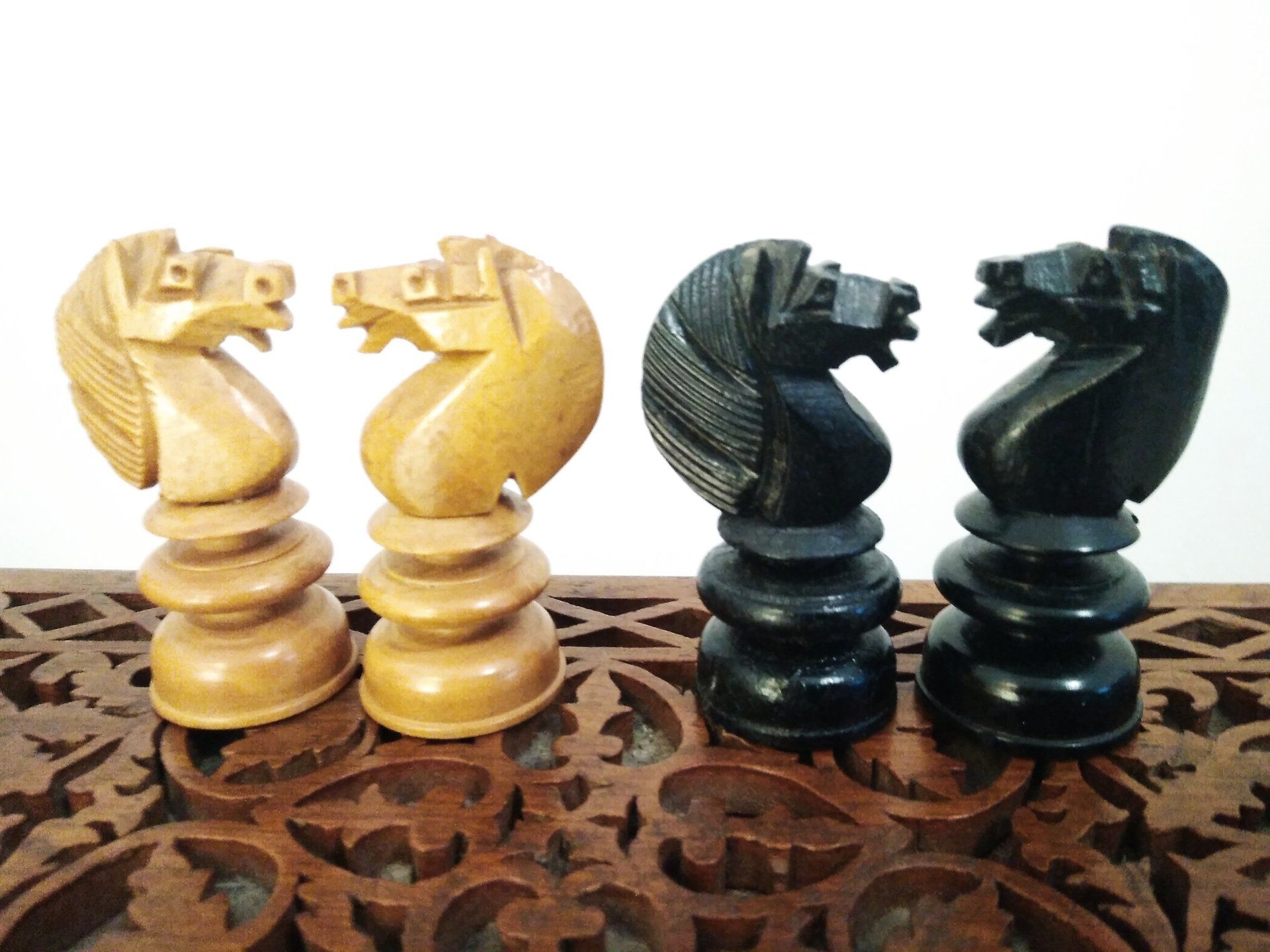 Antique English "St. George" pattern chess set in club size following the design introduced by the St. George Chess Club in London in the late 18th century. King size is 4".
