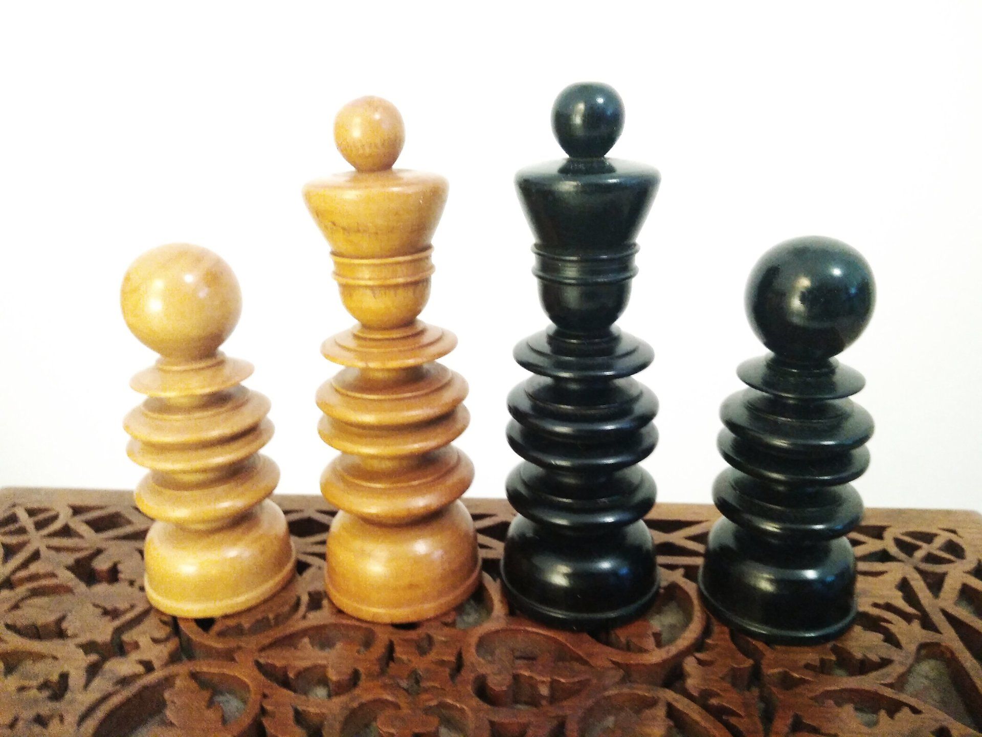 The Kings with double collar and imposing head with a large bulb finial, the Queens with oversize bulb tops, mitred Bishops and the Rooks with six crenellations. Probably made around 1870 - 1880.