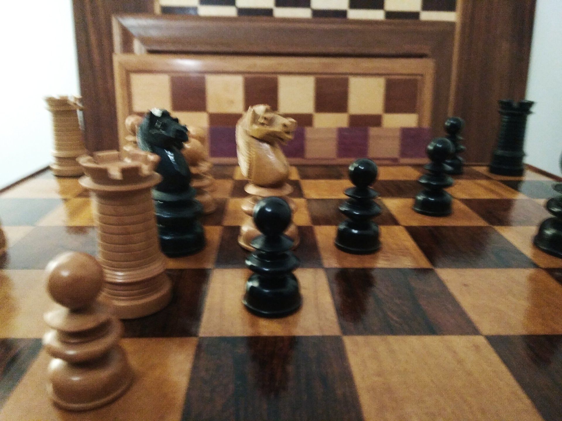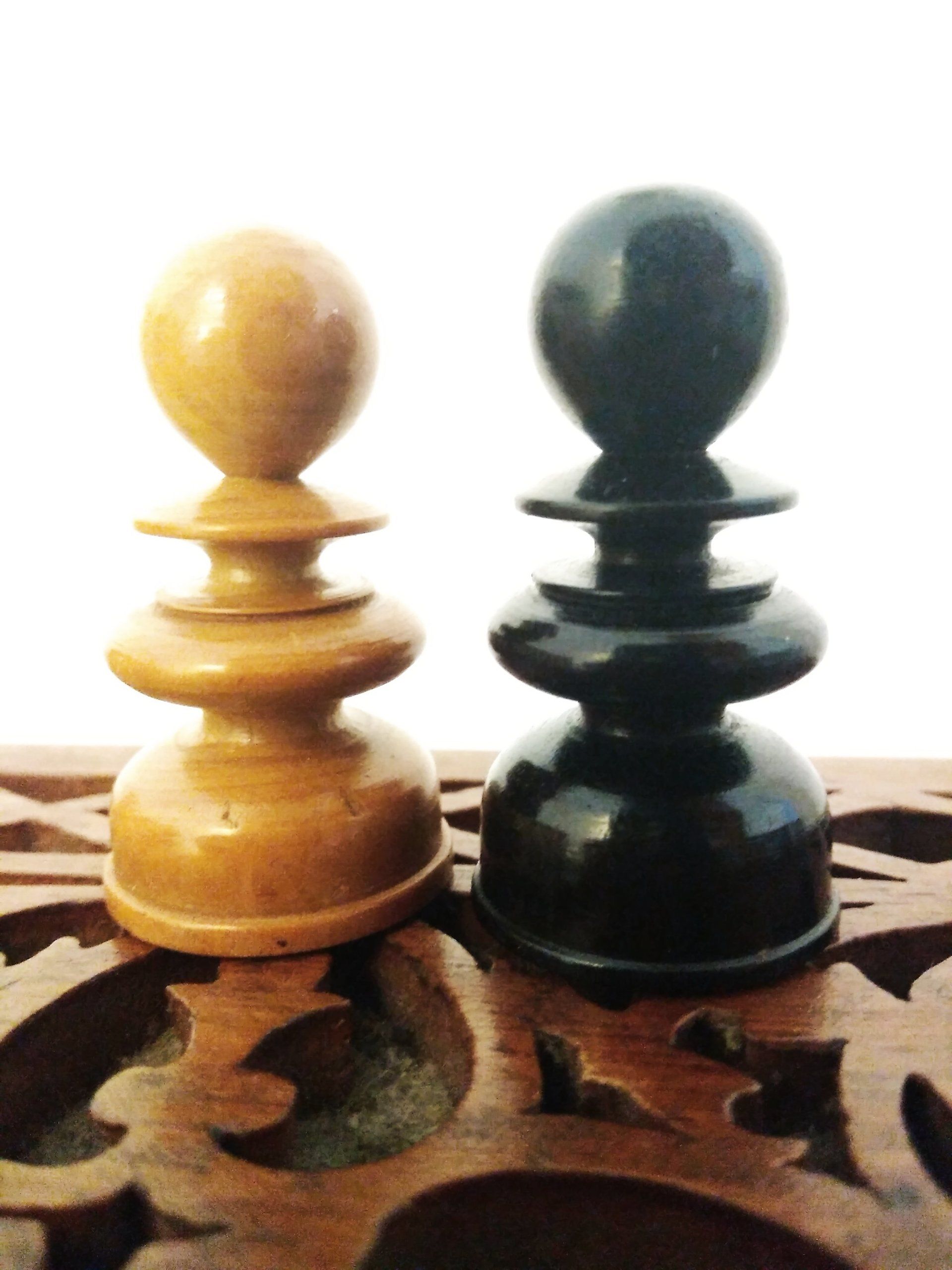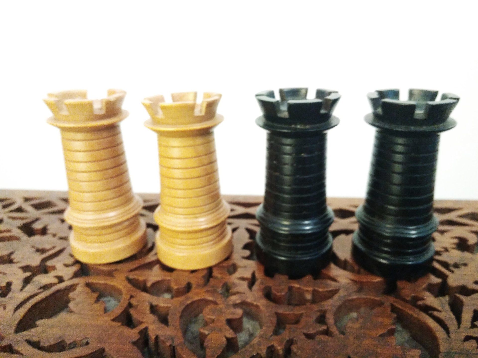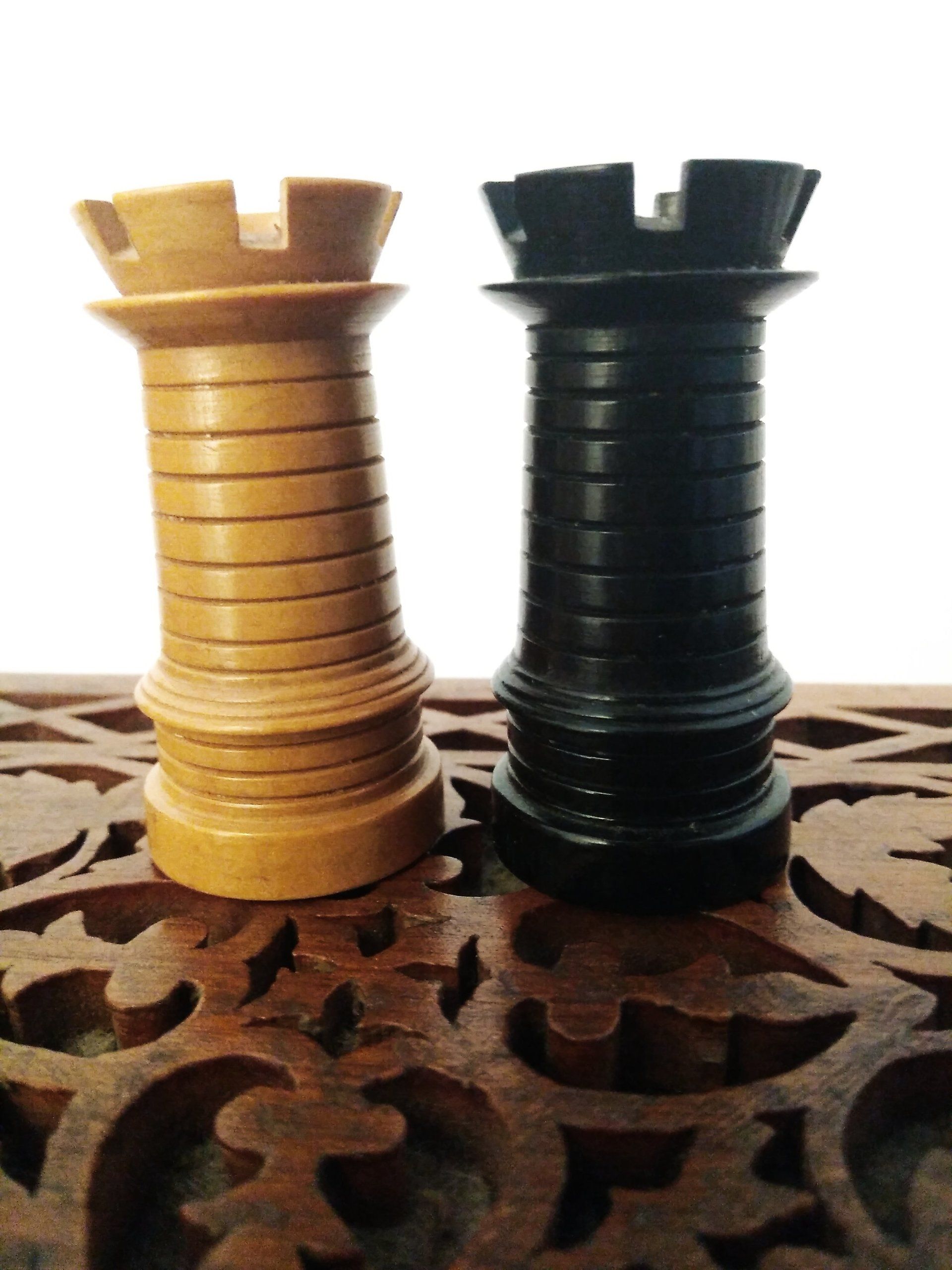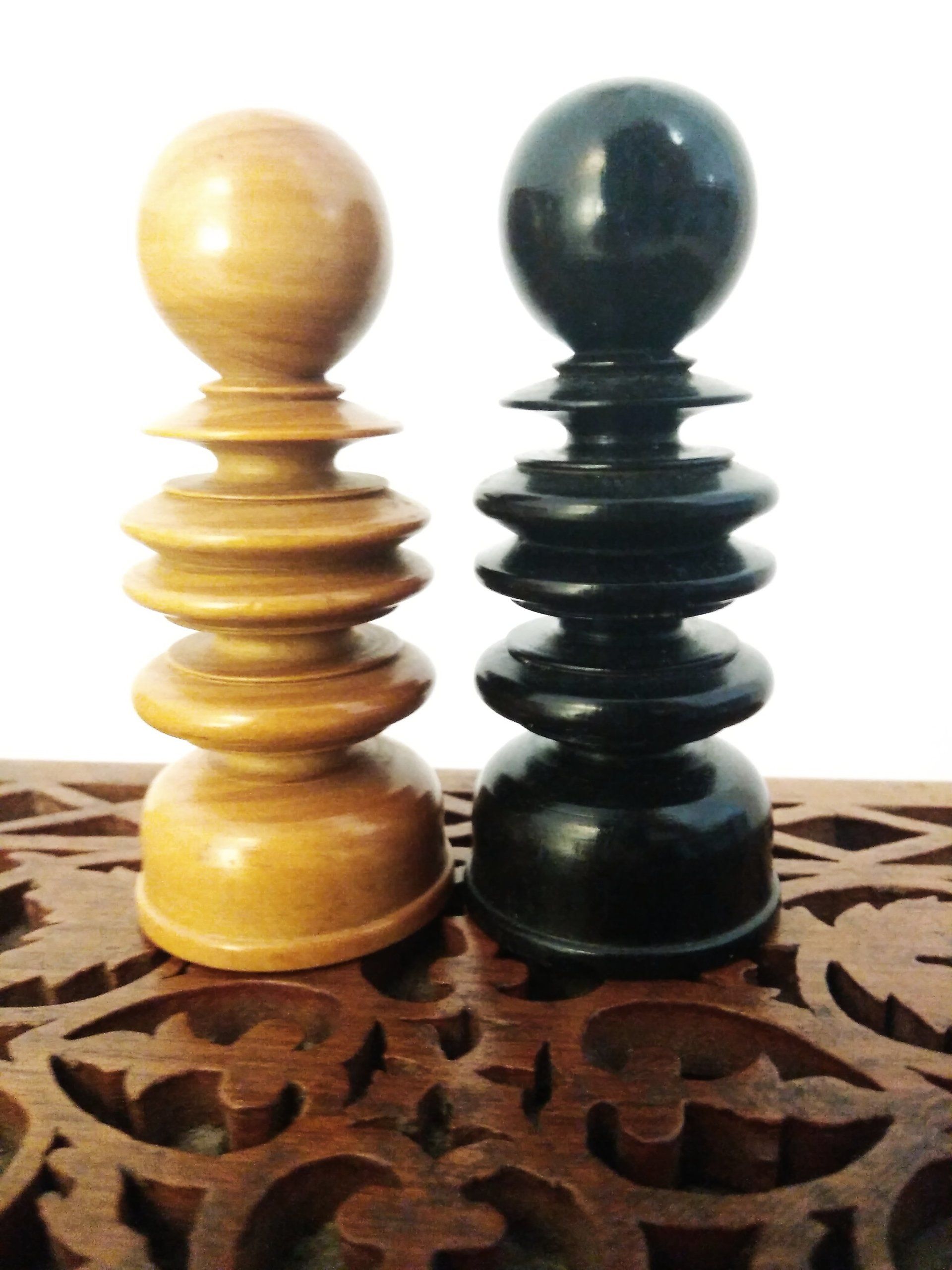 The pieces are made from ebony and boxwood. Elongated hemispherical bases with a thick foot rim, which were probably meant to accomodate lead weight. However, the pieces are not weighted.