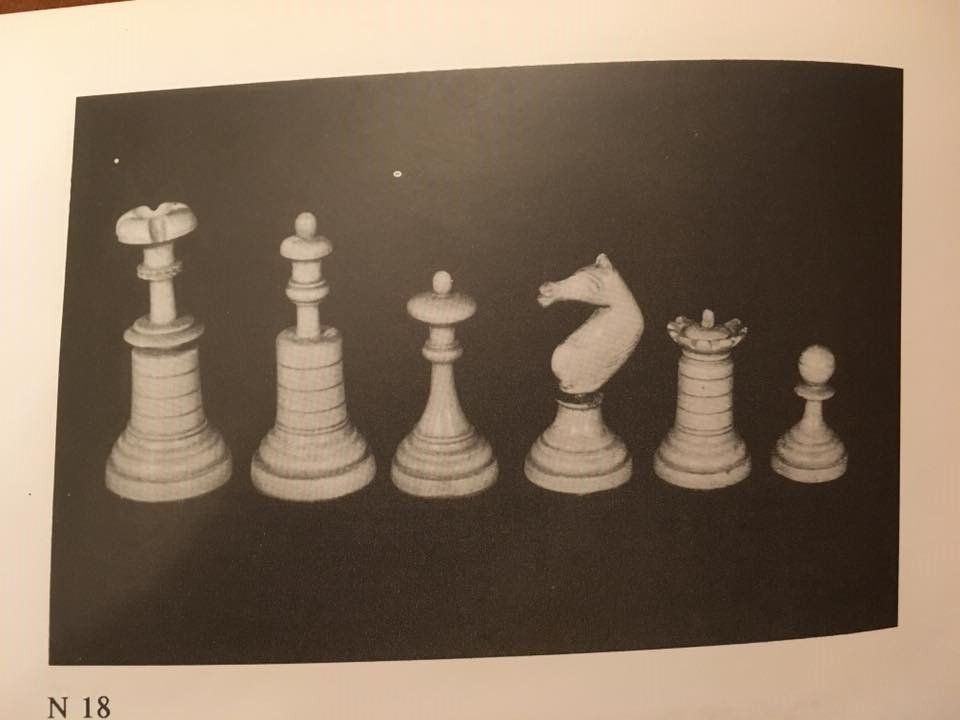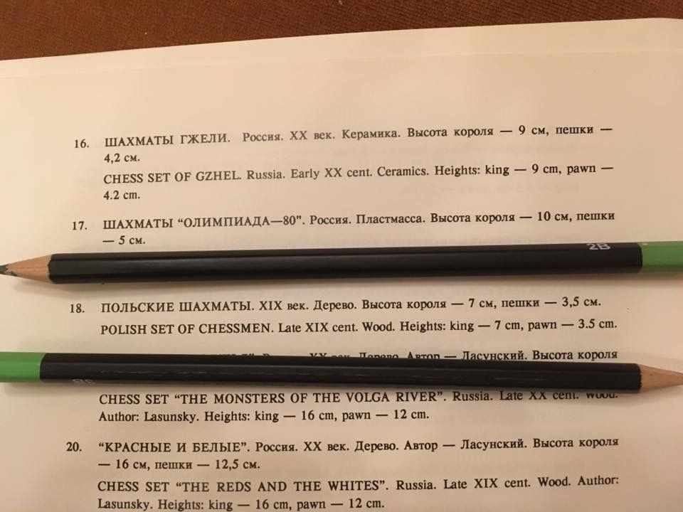 The pieces were sold to me as being of Russian origin. I know of a similar set which was sold to Brazil, also as a Russian set. Further, an almost identical set is on display in the Chess Museum in Moscow, a picture of their website is included. You can see that the set is also in a rather rugged condition. A fellow chess collector recently made me aware of the fact that this set is not Russian, as I was assuming, but that it is a Polish set. He sent me pictures taken from a 1994 exhibition catalogue of the Moscow Chess Museum and was so kind to give me the permission to put them on this website.