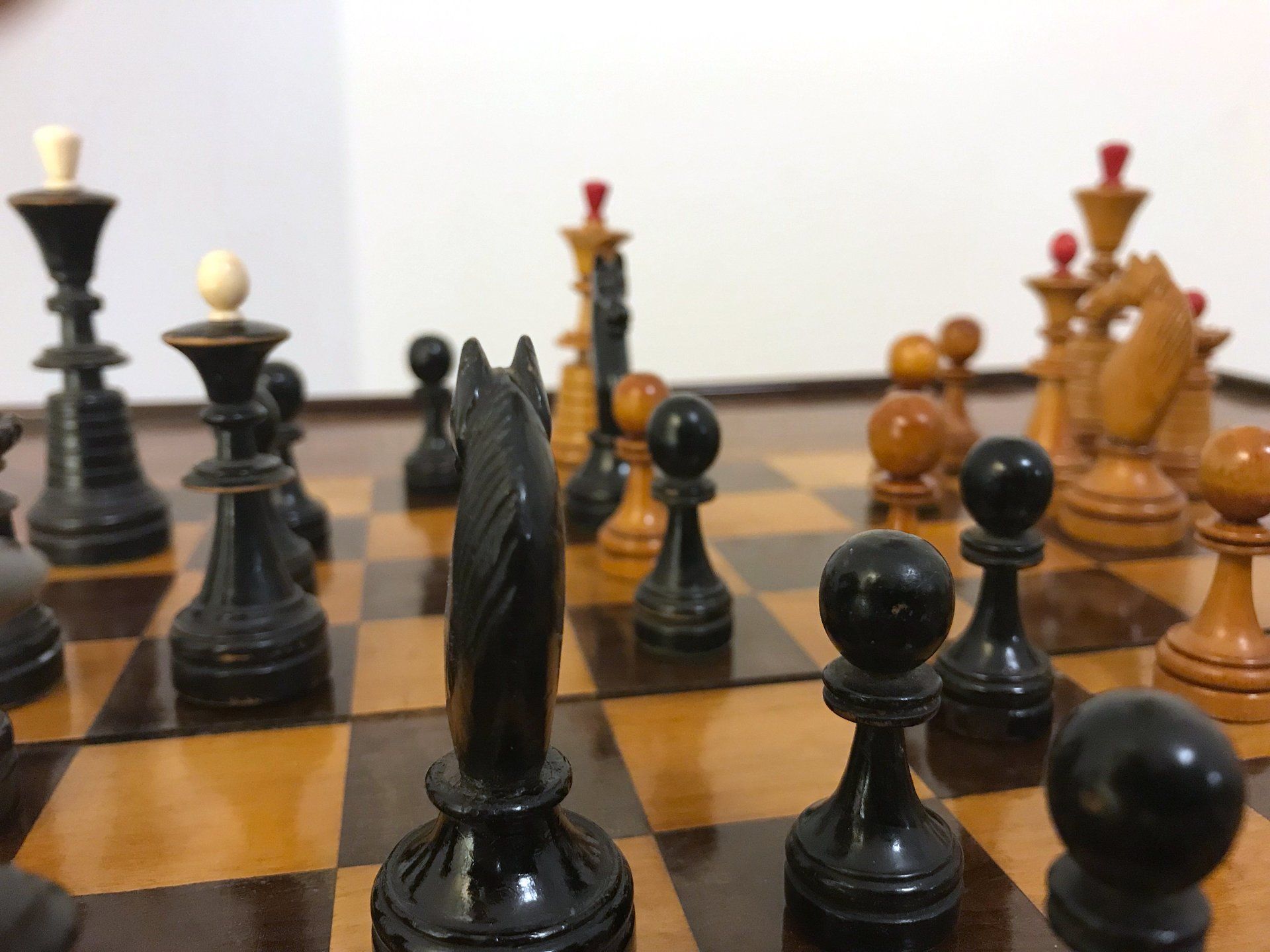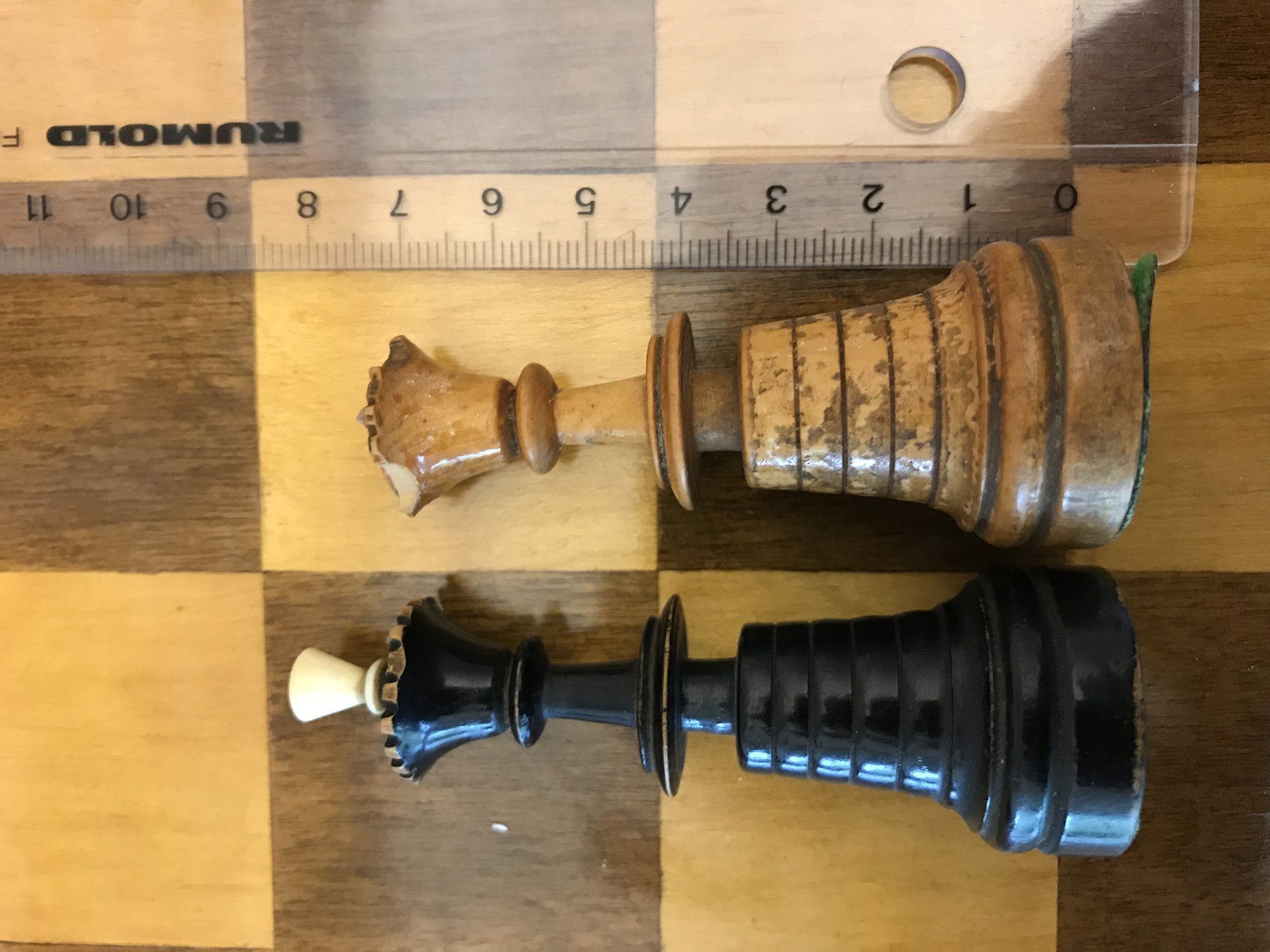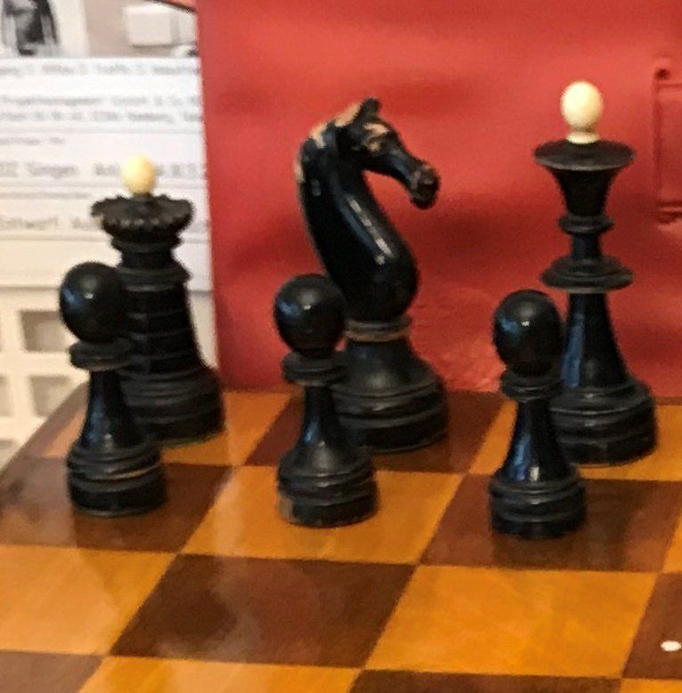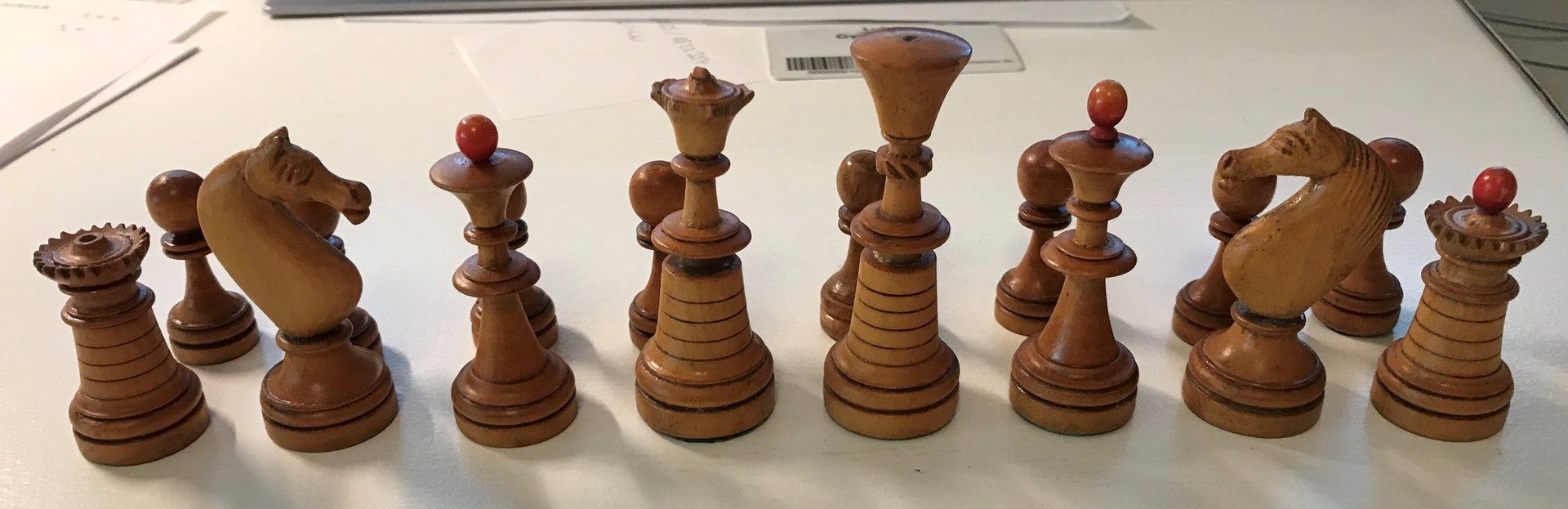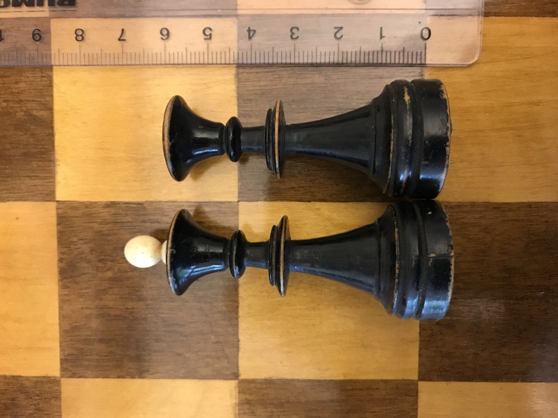 Some time ago, I acquired some nice, but really worn pieces that once formed a glorious Polish late 19th century tournament set in order to restore them. King size is 9 cm. All pieces are weighted. However, many of the pieces had chips, an immense amount of grease and dirt on them and many spots in which the colour was peeling off. Half of the pieces had bone finials, the rest of the finials was missing. The finials of the black pieces were of natural colour that had in some places turned to a dirty grey. The finials on the white side were stained in red, but were rather faded. Further, one of the Rook finials had been misplaced on a Bishop. One pawn is a replacement.