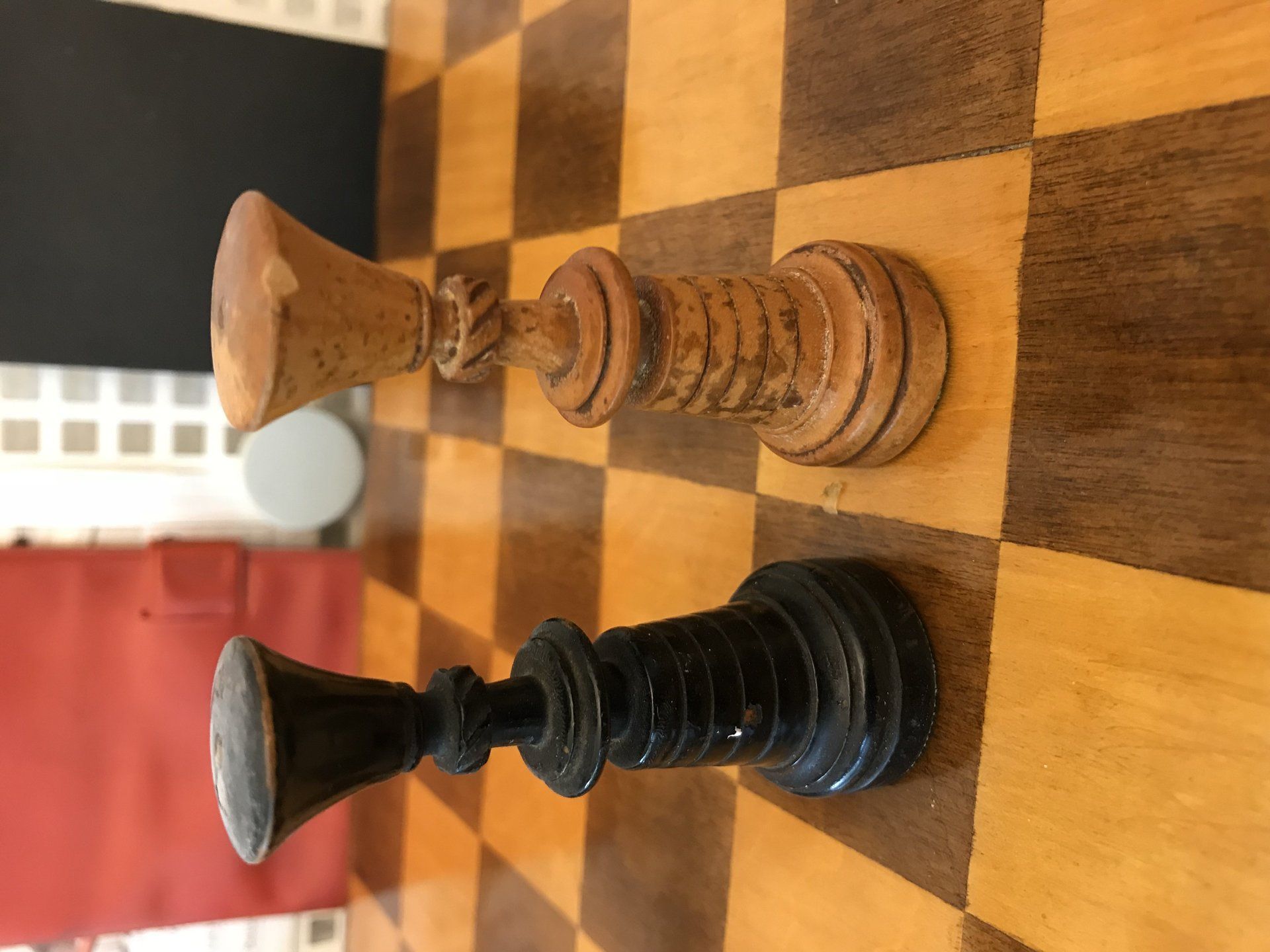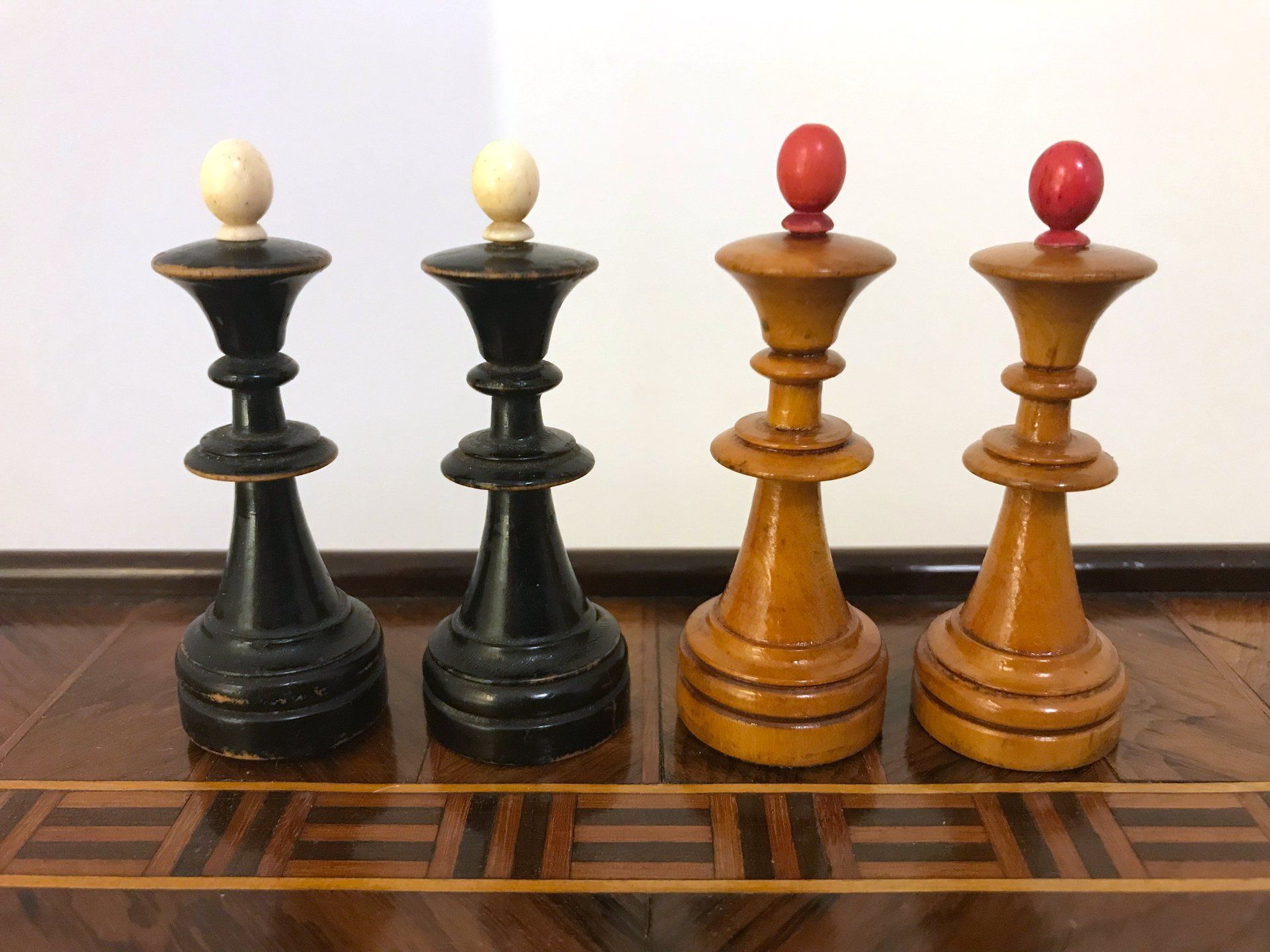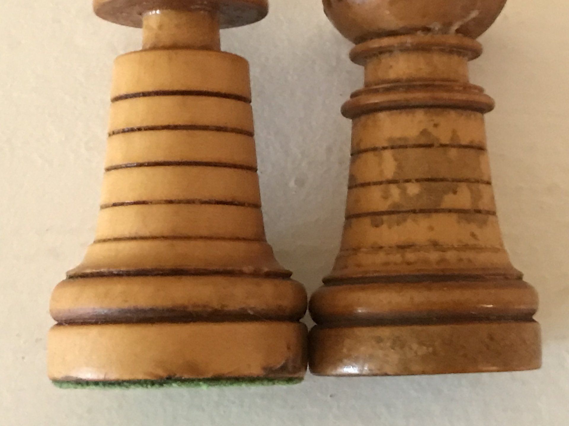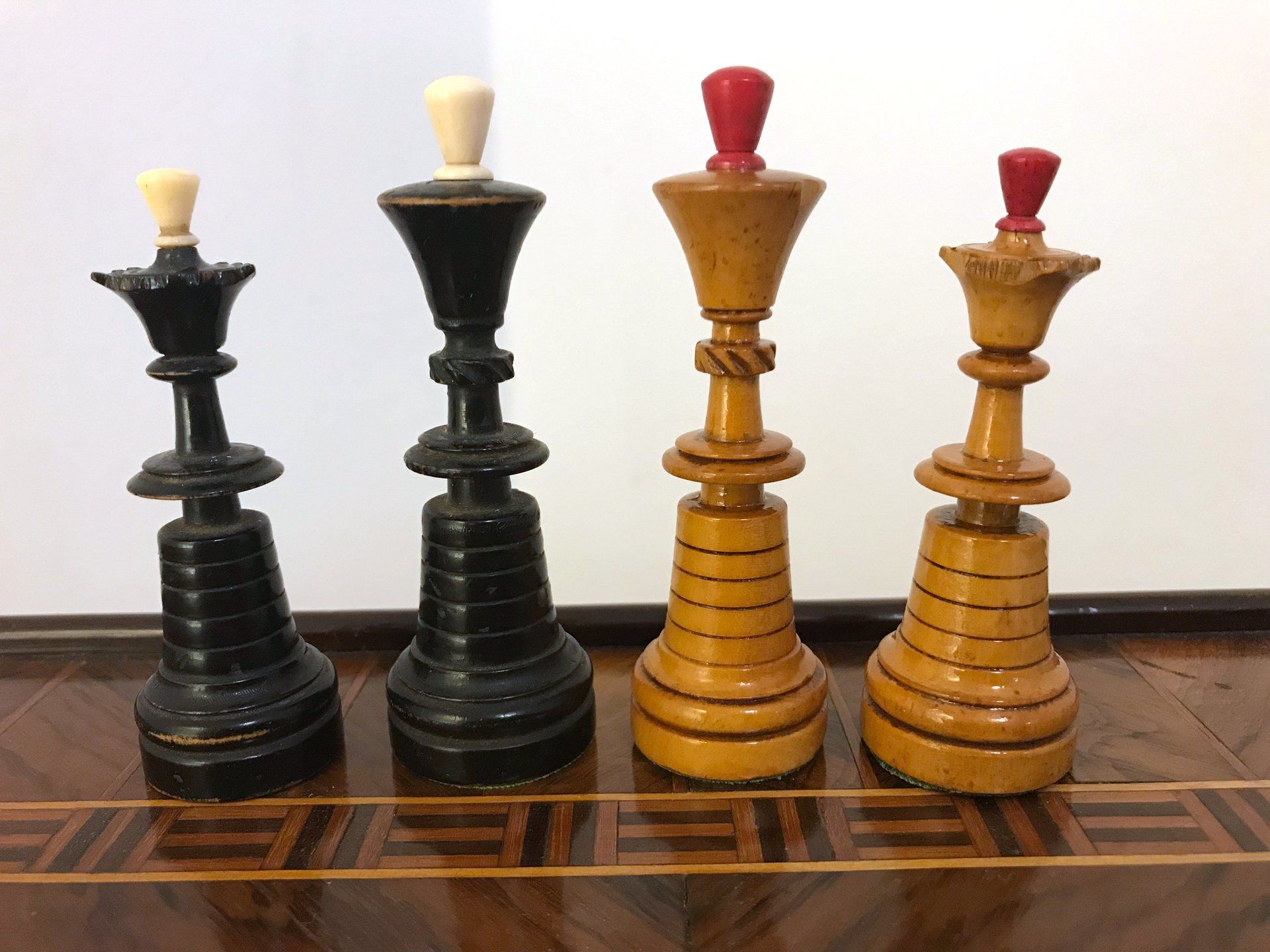 Some time ago, I acquired some nice, but really worn pieces that once formed a glorious Polish late 19th century tournament set in order to restore them. King size is 9 cm. All pieces are weighted. However, many of the pieces had chips, an immense amount of grease and dirt on them and many spots in which the colour was peeling off. Half of the pieces had bone finials, the rest of the finials was missing. The finials of the black pieces were of natural colour that had in some places turned to a dirty grey. The finials on the white side were stained in red, but were rather faded. Further, one of the Rook finials had been misplaced on a Bishop. One pawn is a replacement.