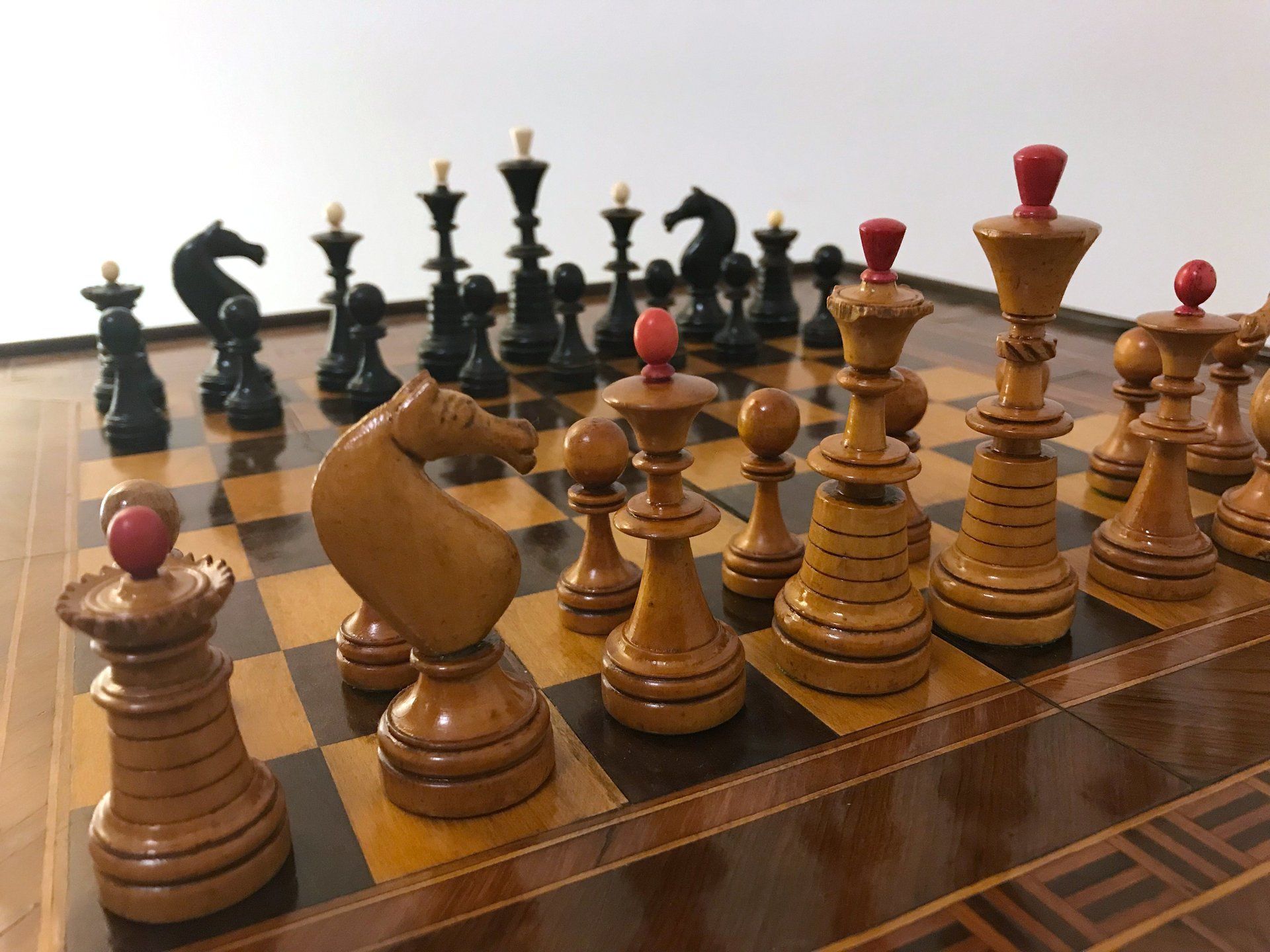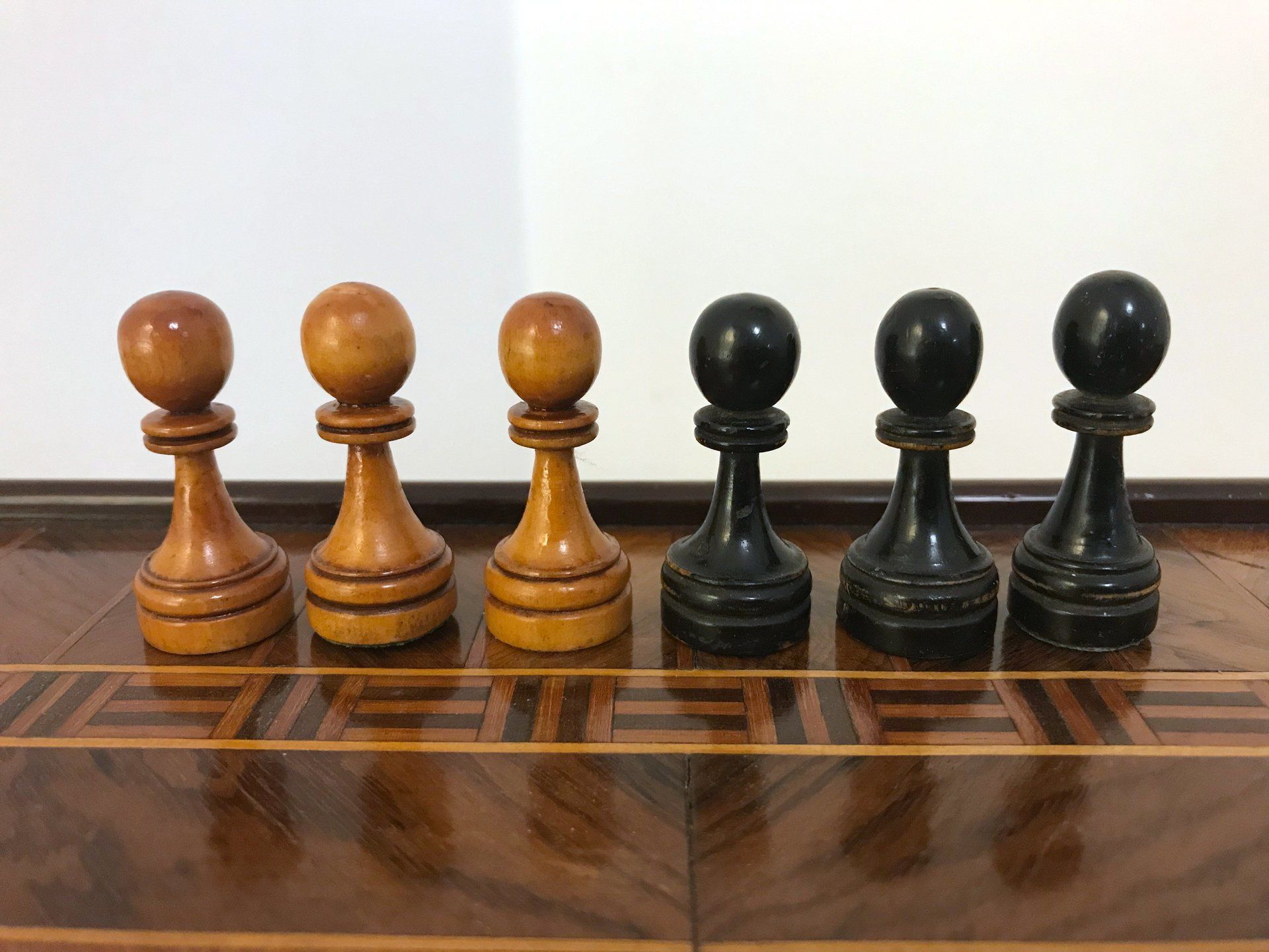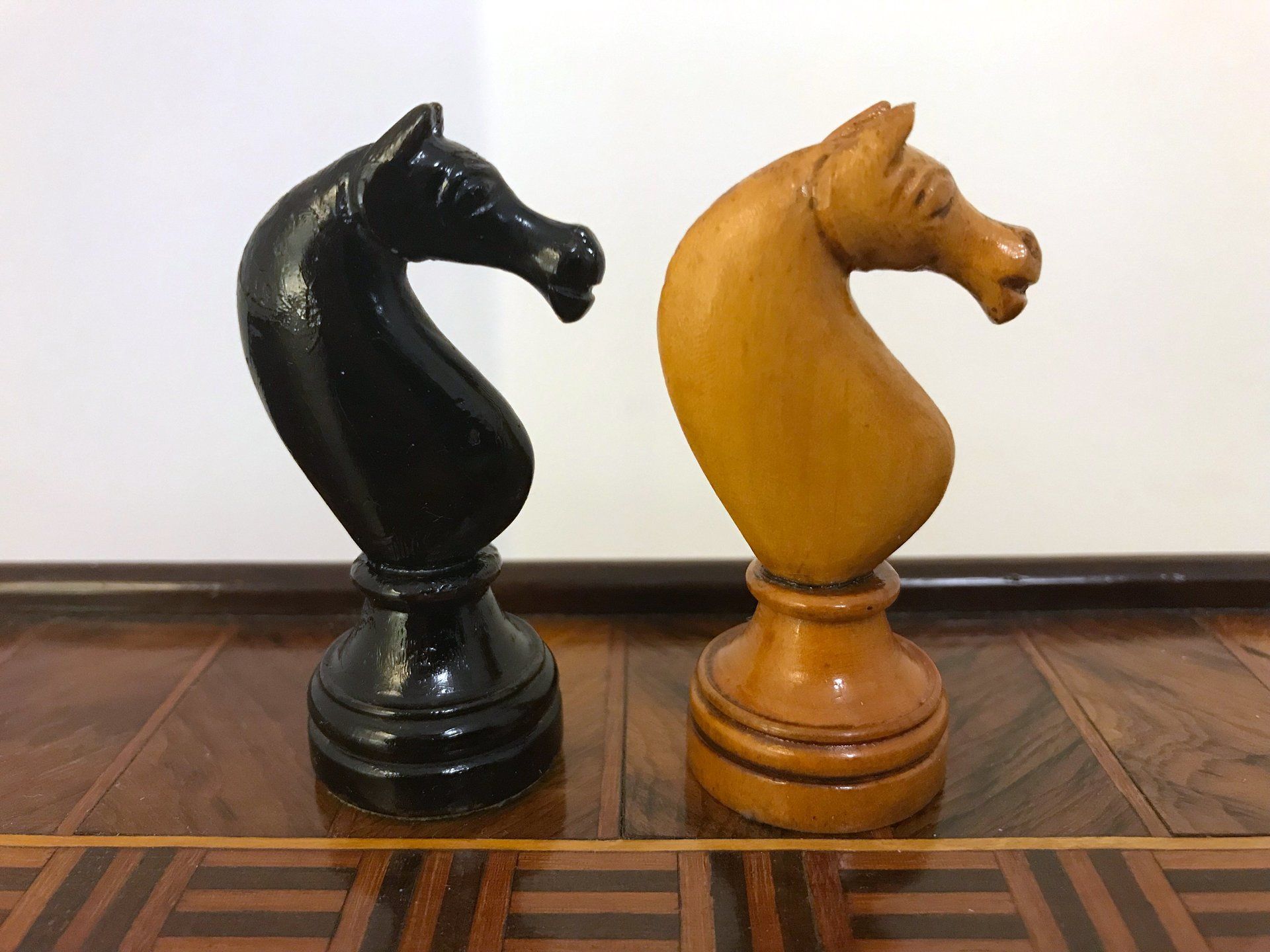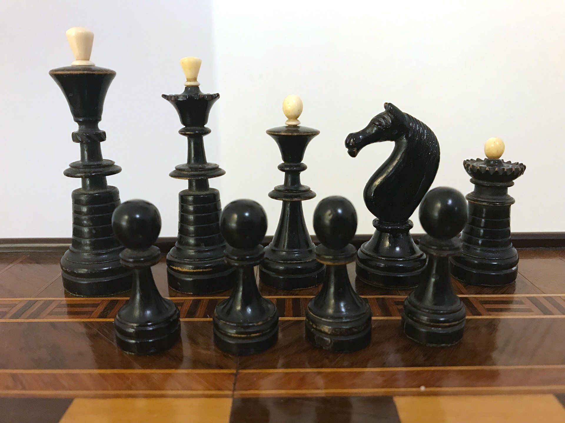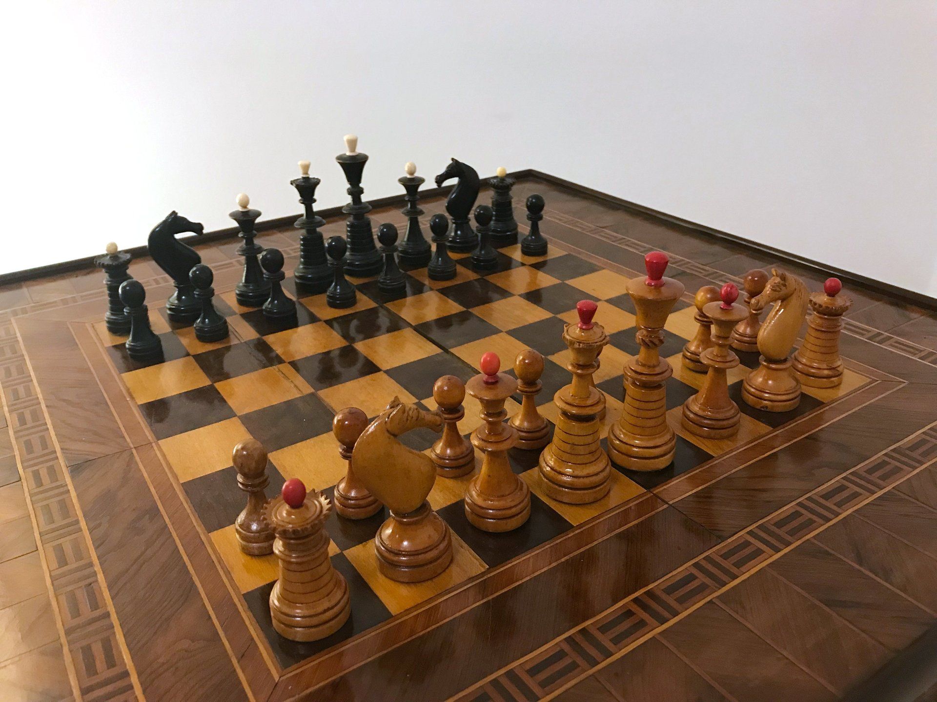 Some time ago, I acquired some nice, but really worn pieces that once formed a glorious Polish late 19th century tournament set in order to restore them. King size is 9 cm. All pieces are weighted. However, many of the pieces had chips, an immense amount of grease and dirt on them and many spots in which the colour was peeling off. Half of the pieces had bone finials, the rest of the finials was missing. The finials of the black pieces were of natural colour that had in some places turned to a dirty grey. The finials on the white side were stained in red, but were rather faded. Further, one of the Rook finials had been misplaced on a Bishop. One pawn is a replacement.