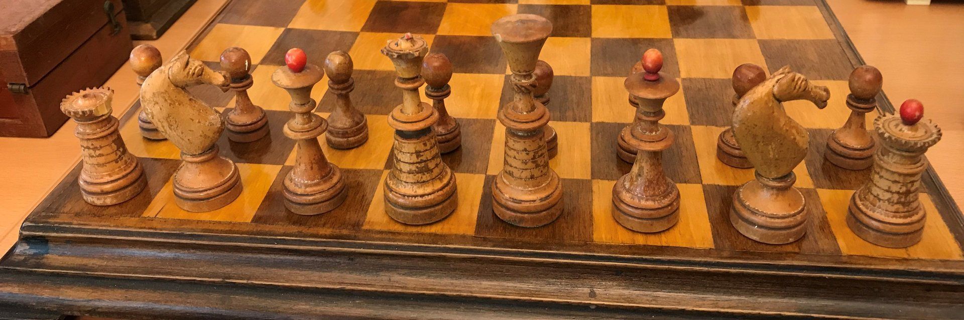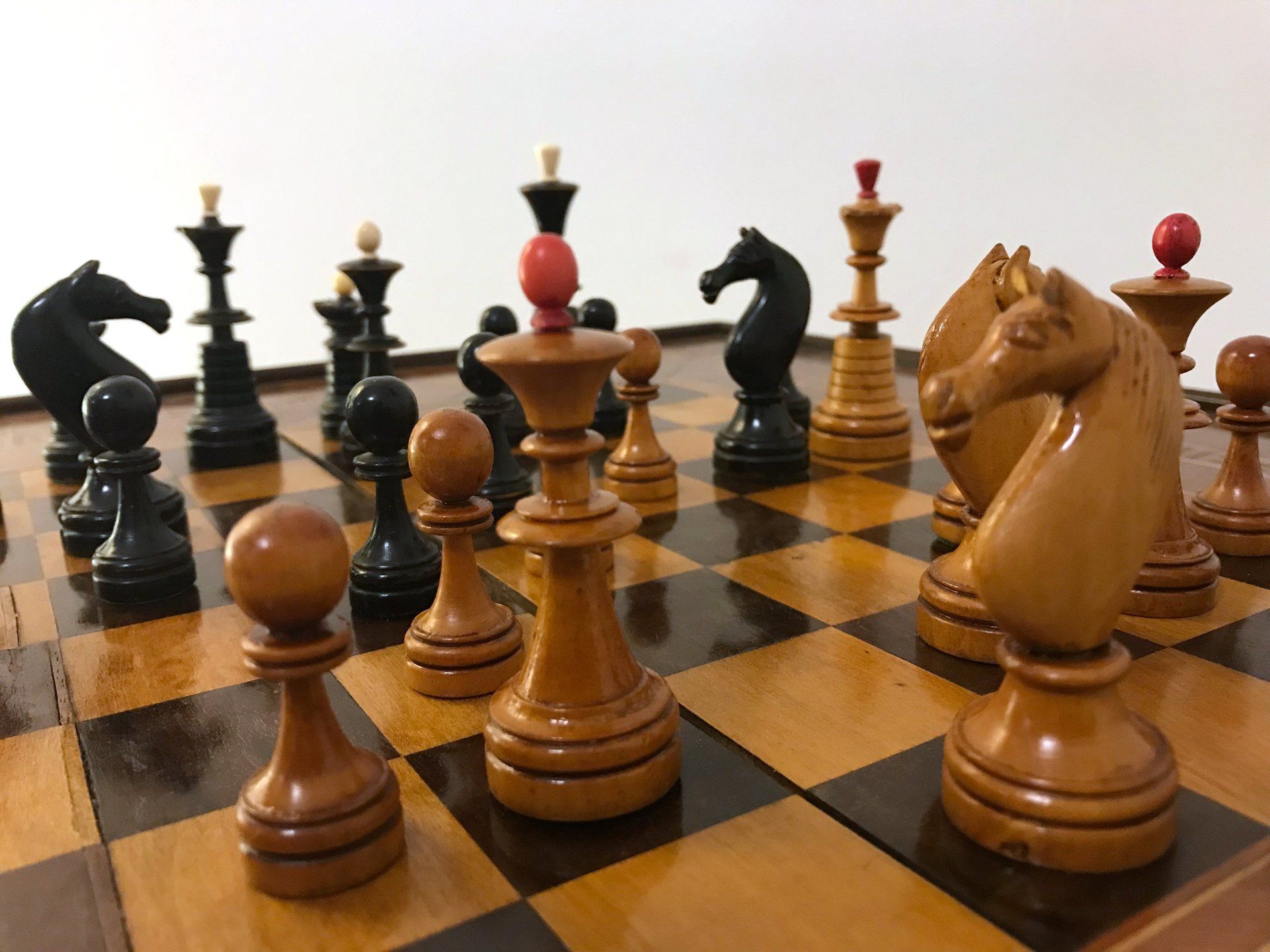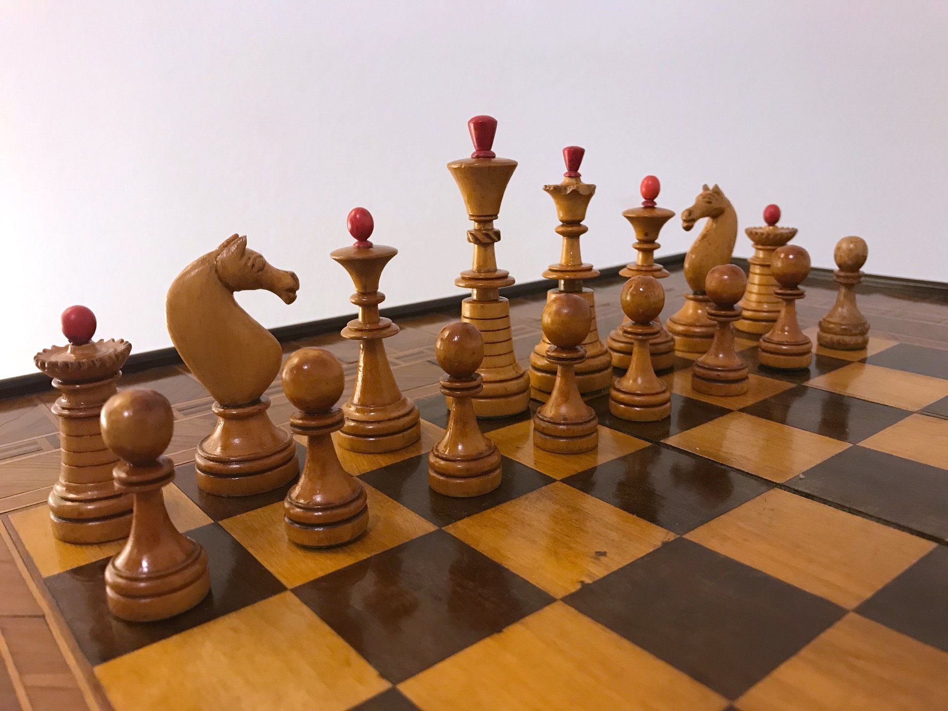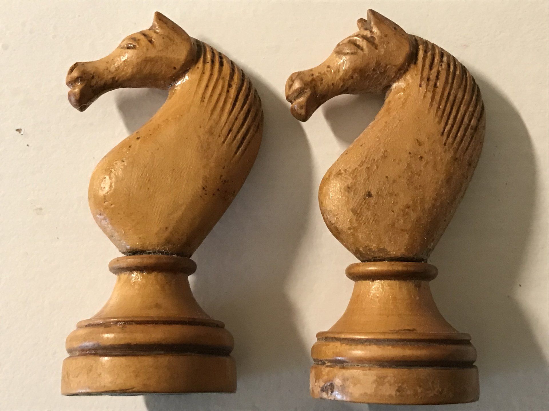 Some time ago, I acquired some nice, but really worn pieces that once formed a glorious Polish late 19th century tournament set in order to restore them. King size is 9 cm. All pieces are weighted. However, many of the pieces had chips, an immense amount of grease and dirt on them and many spots in which the colour was peeling off. Half of the pieces had bone finials, the rest of the finials was missing. The finials of the black pieces were of natural colour that had in some places turned to a dirty grey. The finials on the white side were stained in red, but were rather faded. Further, one of the Rook finials had been misplaced on a Bishop. One pawn is a replacement.
