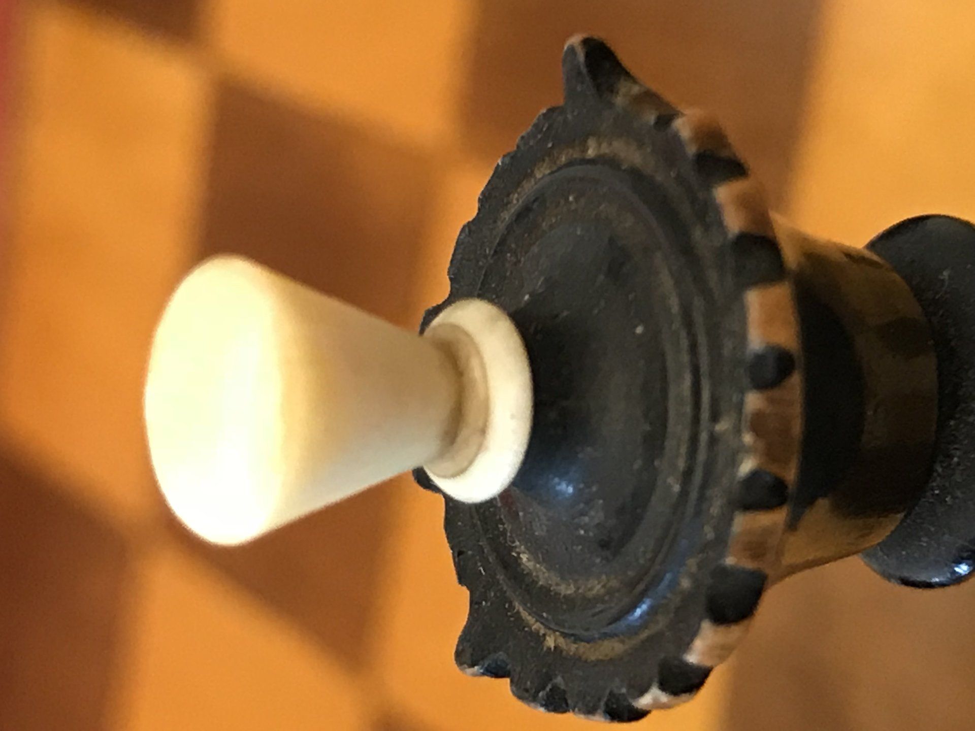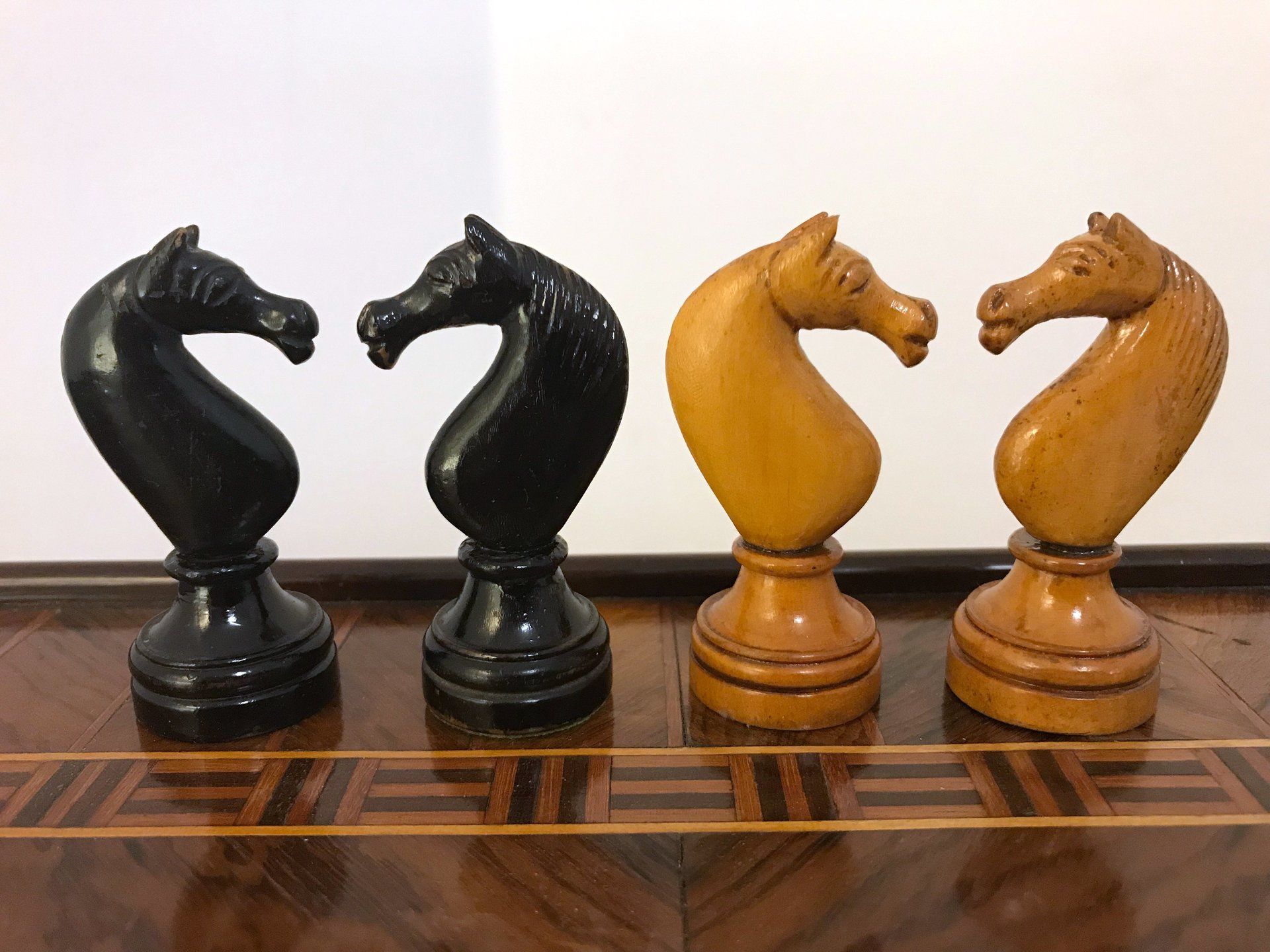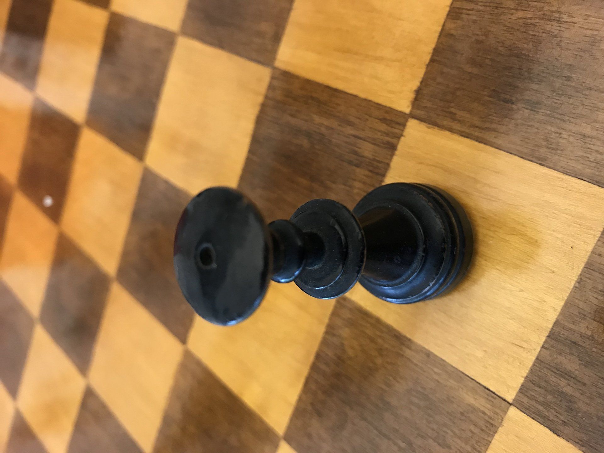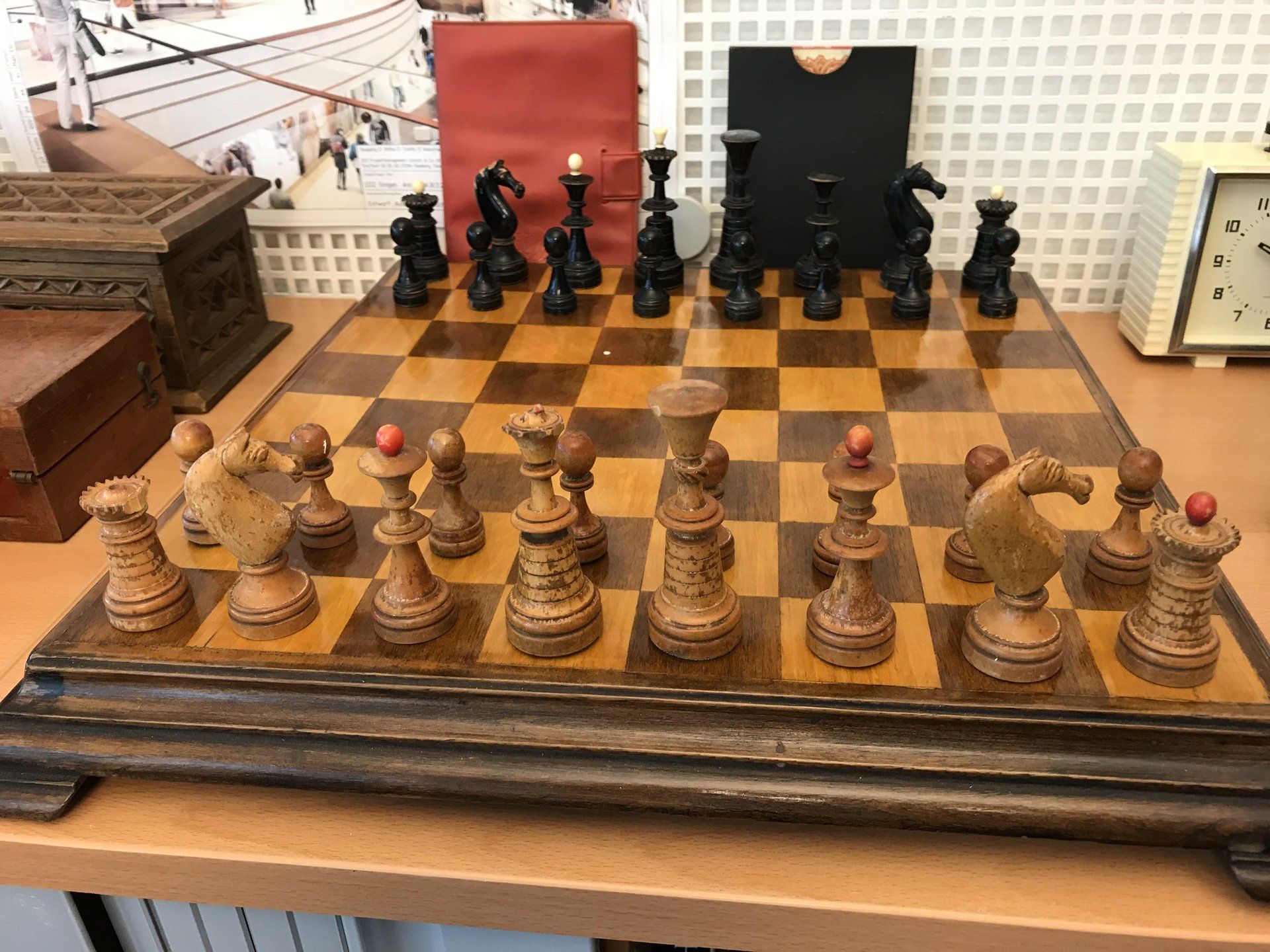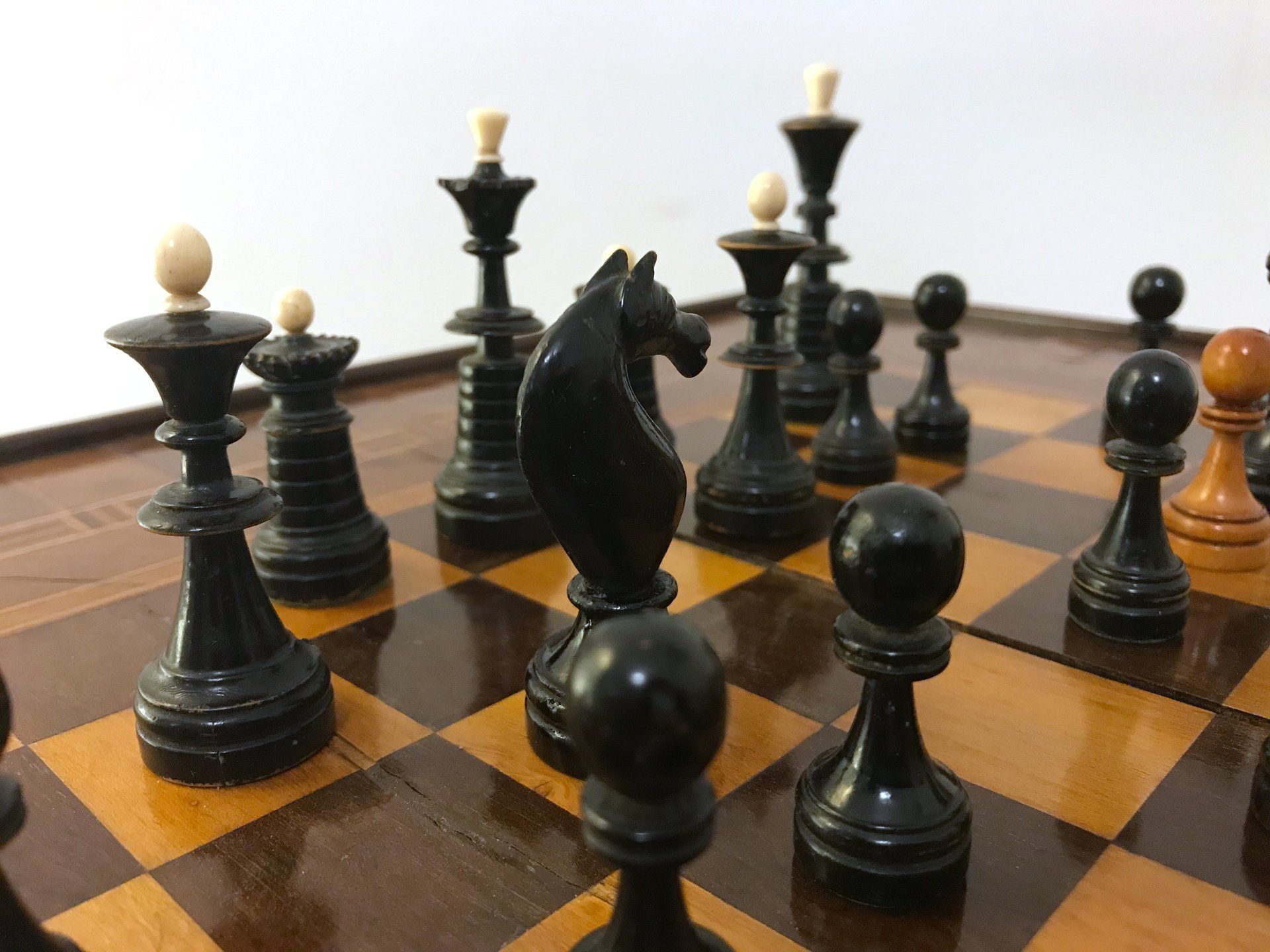 Some time ago, I acquired some nice, but really worn pieces that once formed a glorious Polish late 19th century tournament set in order to restore them. King size is 9 cm. All pieces are weighted. However, many of the pieces had chips, an immense amount of grease and dirt on them and many spots in which the colour was peeling off. Half of the pieces had bone finials, the rest of the finials was missing. The finials of the black pieces were of natural colour that had in some places turned to a dirty grey. The finials on the white side were stained in red, but were rather faded. Further, one of the Rook finials had been misplaced on a Bishop. One pawn is a replacement.