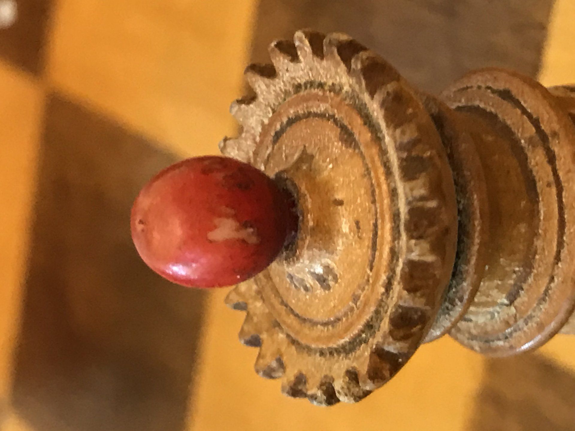 I started the restoration by cleaning the wooden parts from the dirt and stains, while keeping the patina. Obviously I could not do the restoration of the missing bone finials myself, so I sent the pieces to Jürgen Schott, who is one of the famous Odenwald ivory carvers. I sincerely recommend him for any works you require in bone, ivory or the like - he truly is a great craftsman and artist! He made replacements for the missing bone finials, cleaned the natural bone parts and re-coloured the stained red ones. I finished the entire restoration with the renewal of the finish on the wooden parts. The result can be seen in the pictures below.