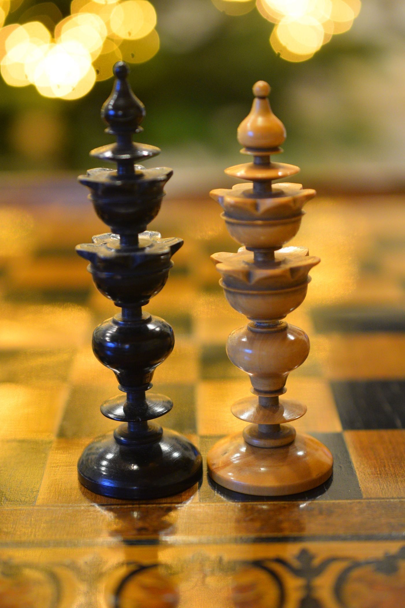 Chessmen like these, made in the Biedermeier period (ca. 1815-1848), were the standard playing sets in Austrian coffeehouses for at least half a century, before the more robust "Old Vienna" style came into fashion.