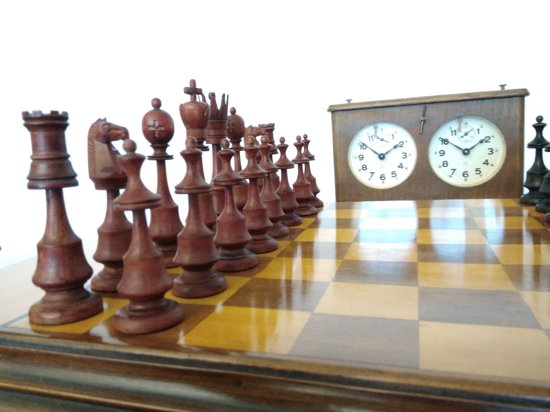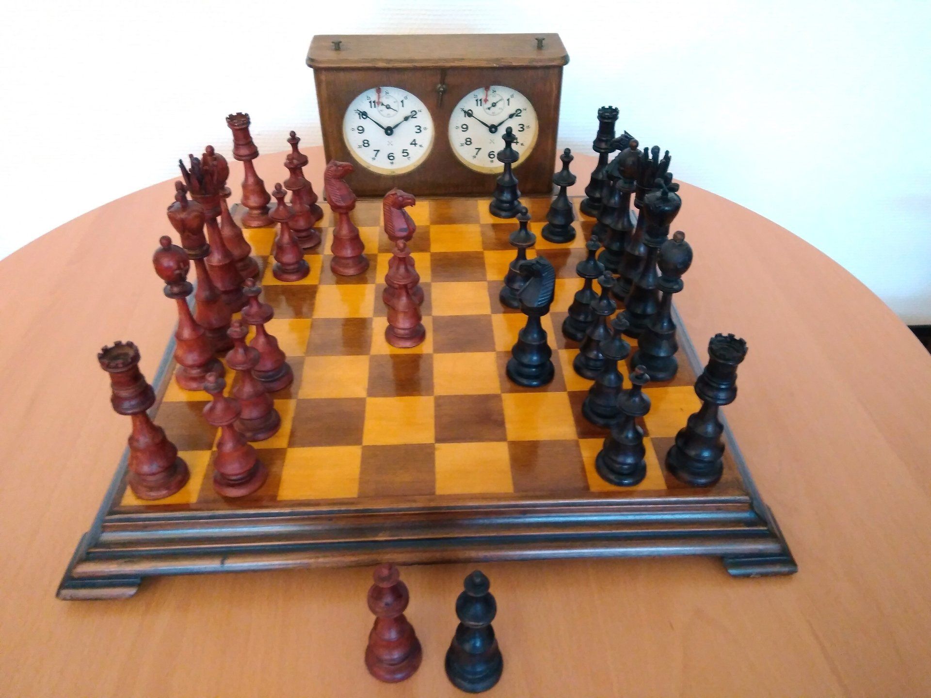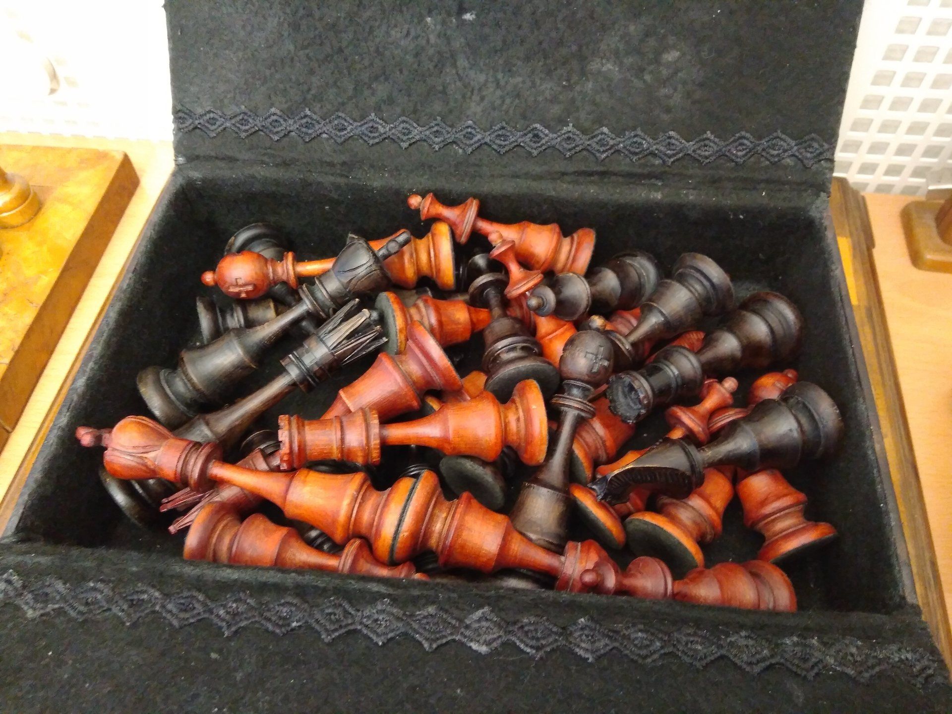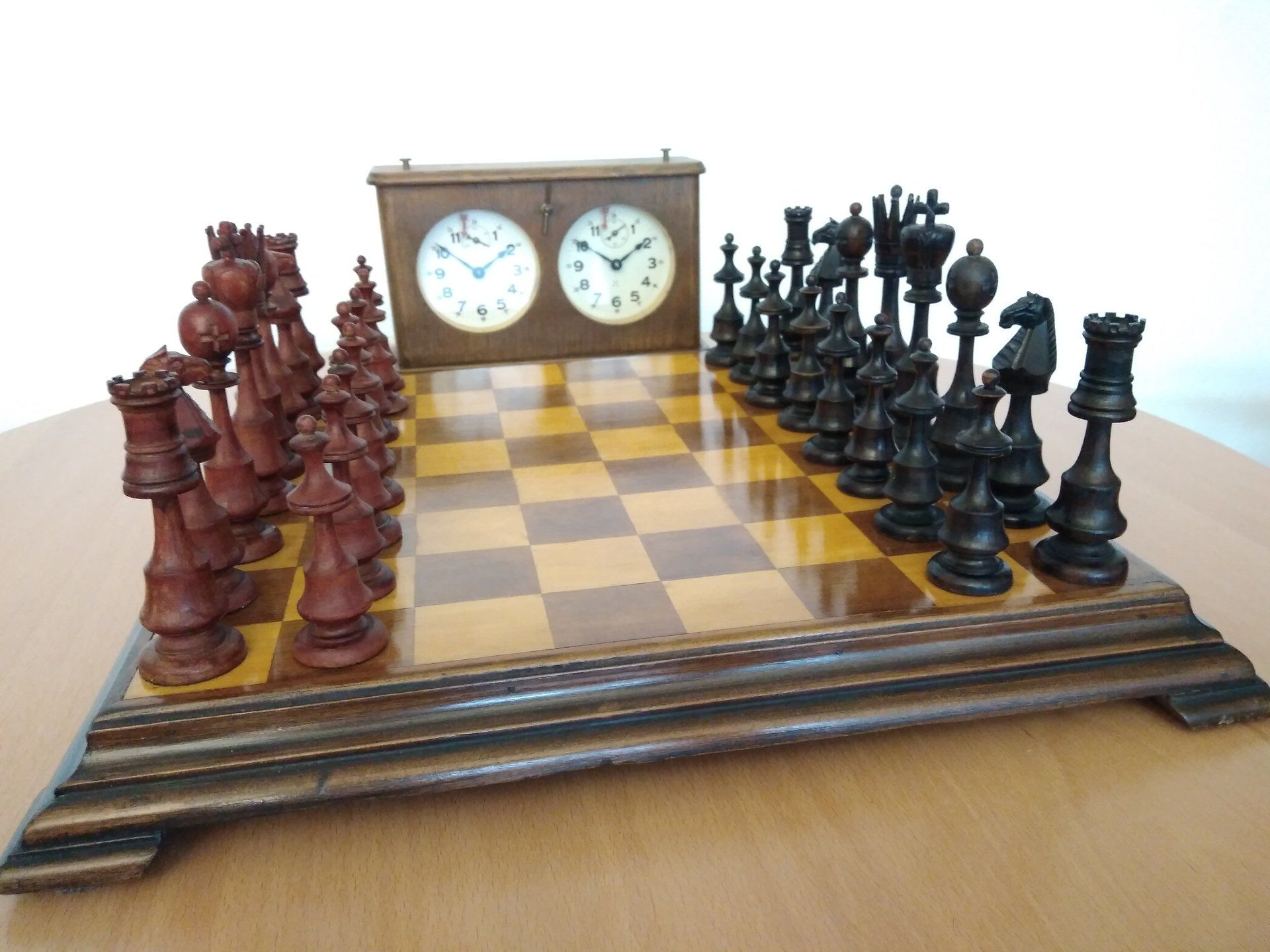 I bought the set some time ago and according to the seller it is a German chess set from the Art Déco period between 1900 - 1930. It came with a storage box of approximately this age. The pieces are lightly weighted, but a bit too tall for serious play.