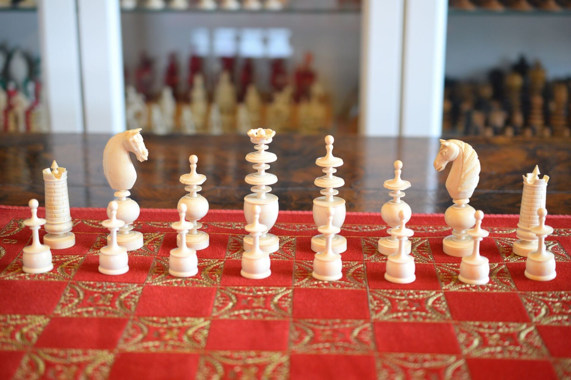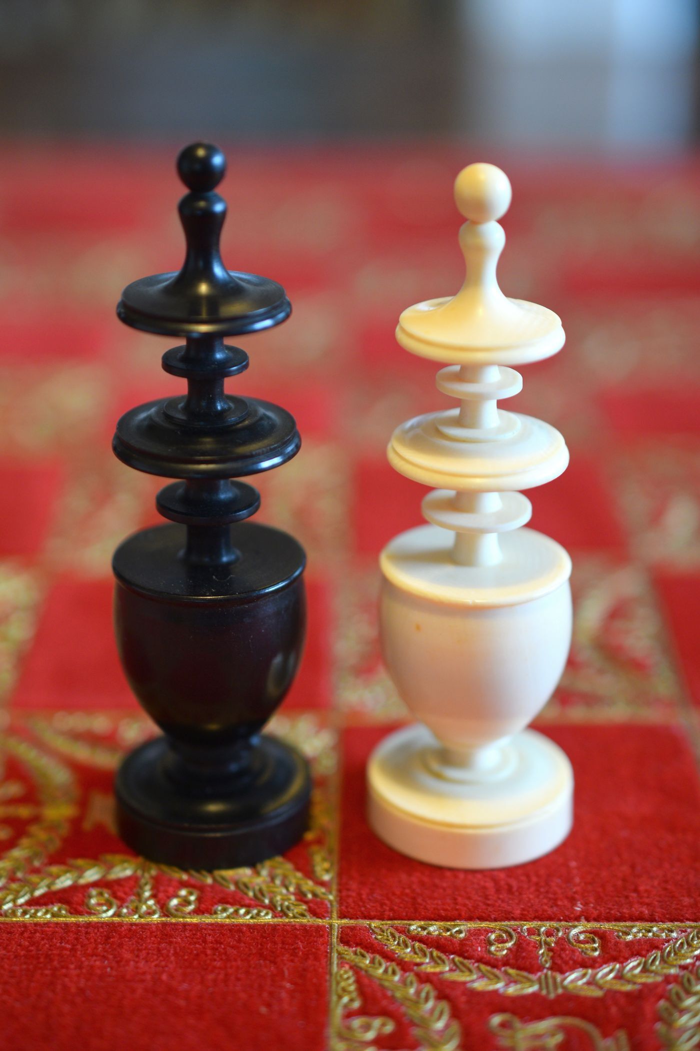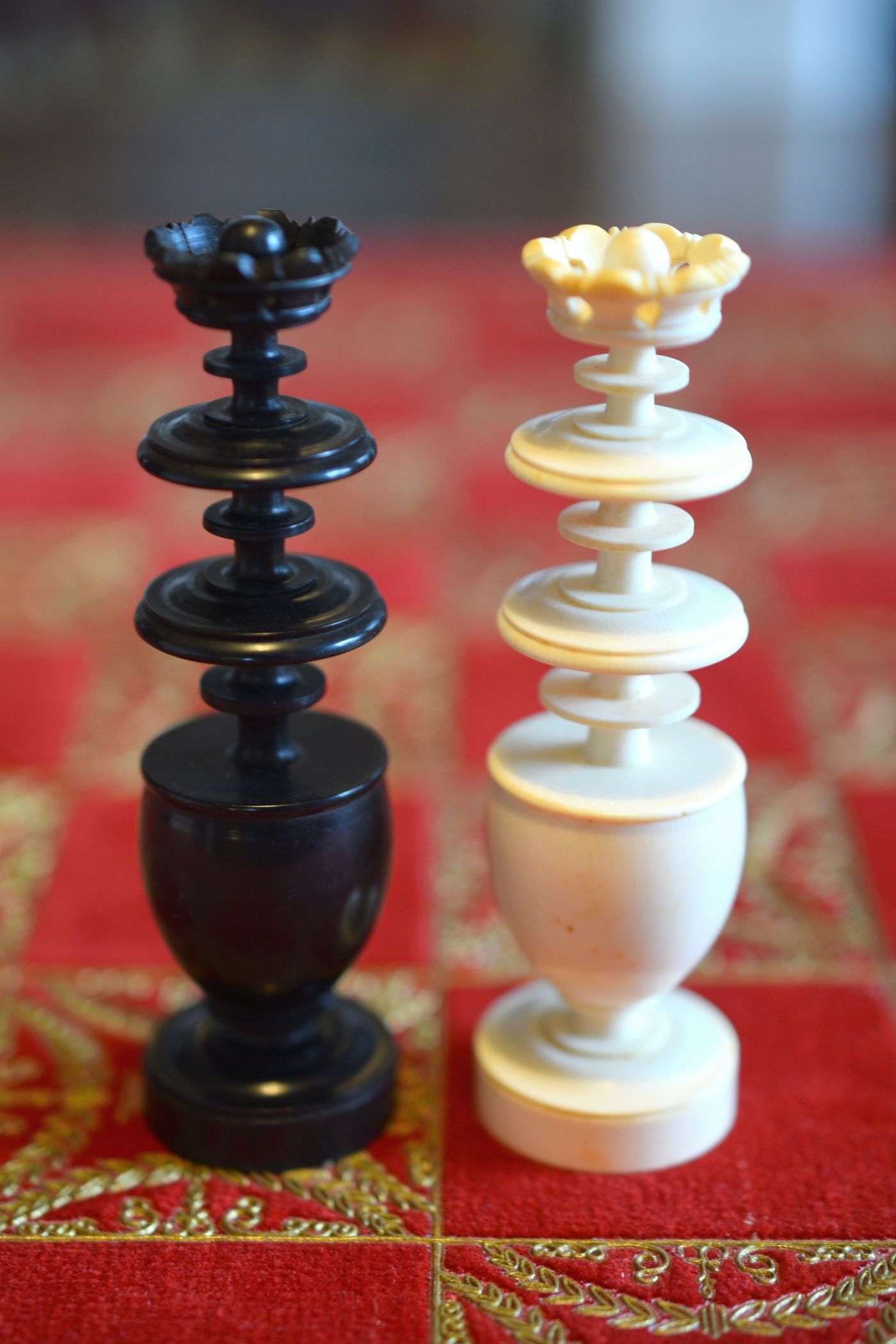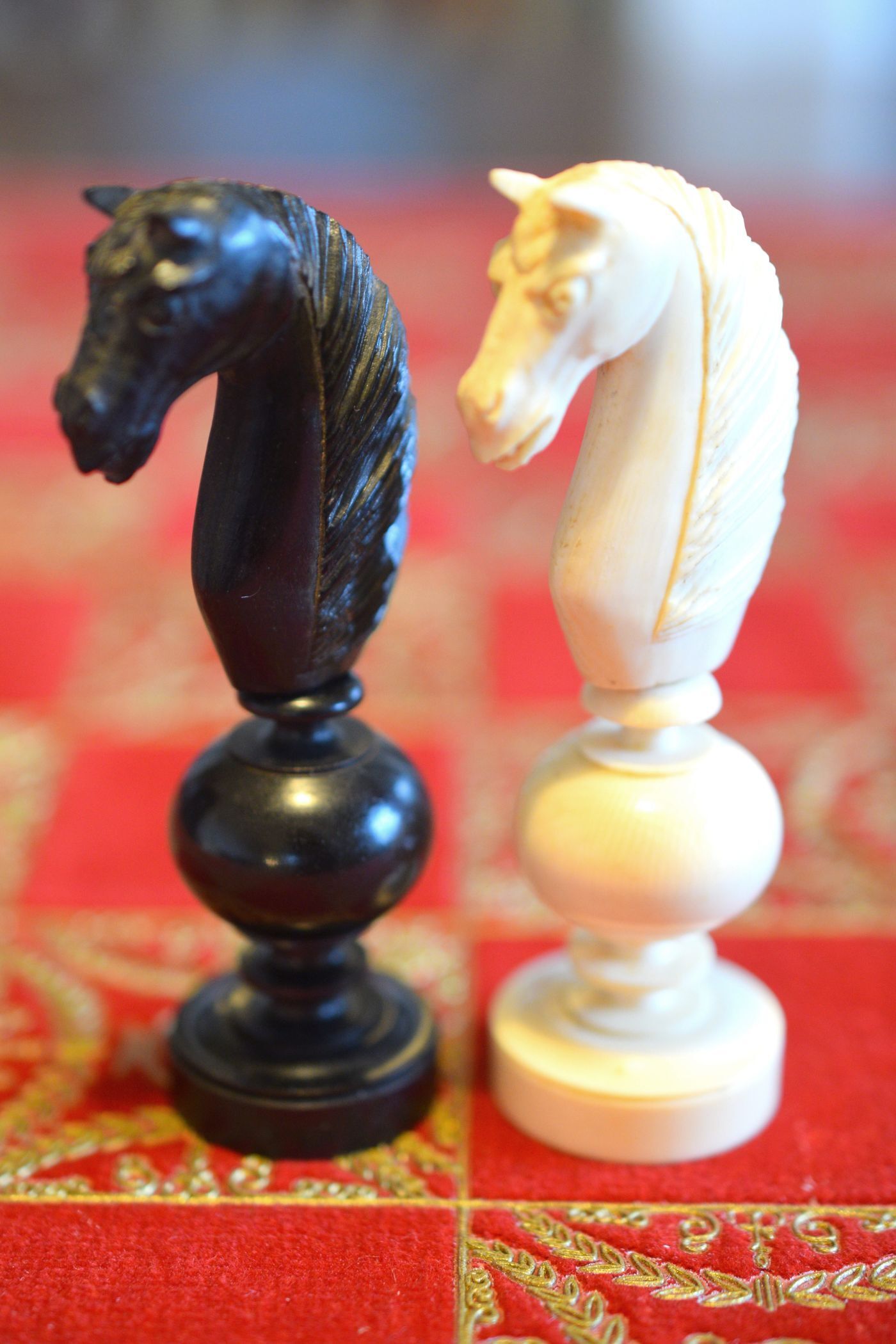 A chess set in the Régence style with a king size of 8.9 cm. The white pieces are turned from ivory, the black pieces from ebony. Judging by the exquisite carving style, the set was probably made in Dieppe, France. While Régence sets were made in France as early as the 18th century, their style evolved over time. The style of the rooks with a spindle finial on top as well as the very detailed carving of the knights' heads are typical for later sets, which makes me believe that this set dates to mid-19th century.