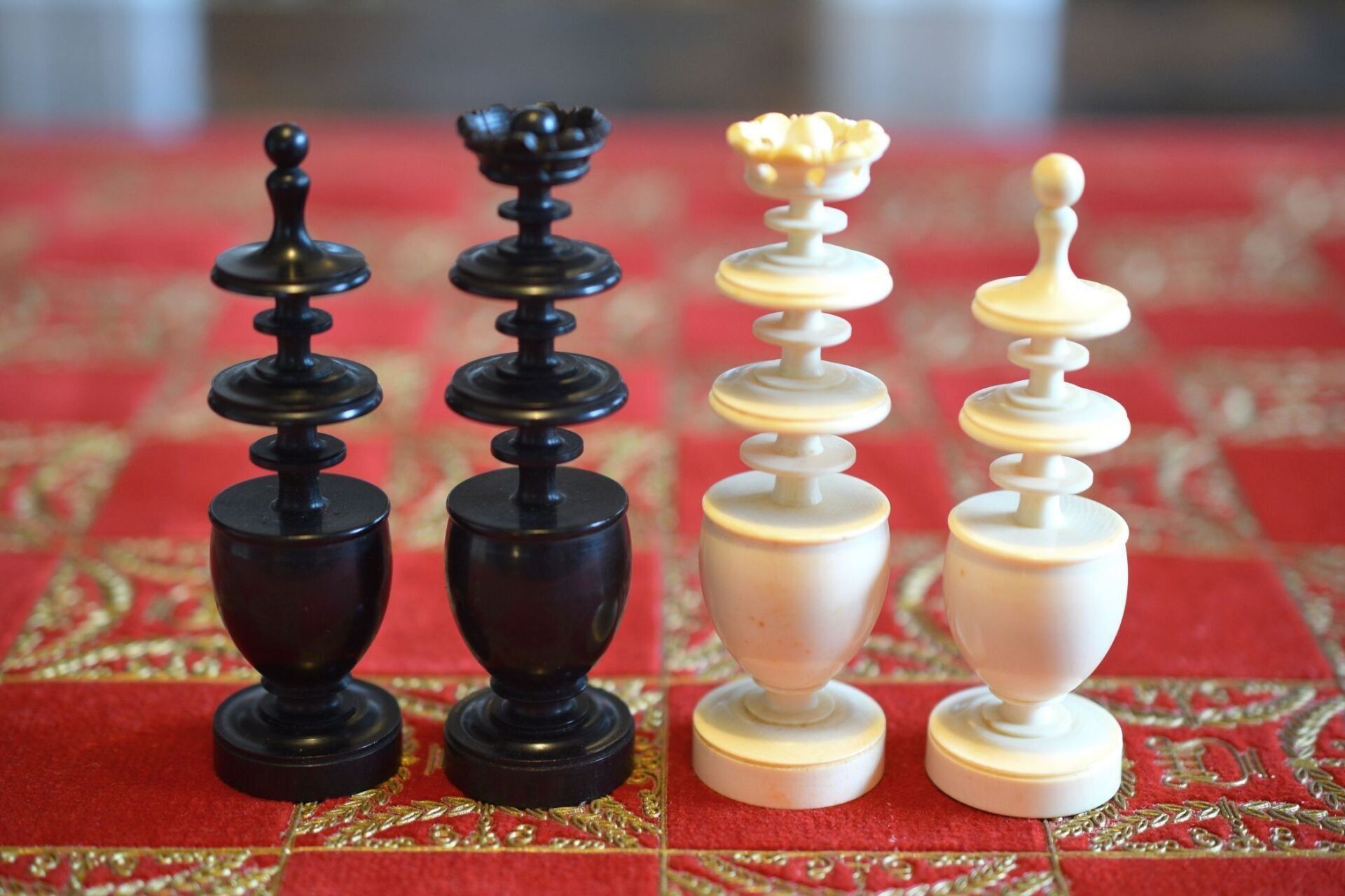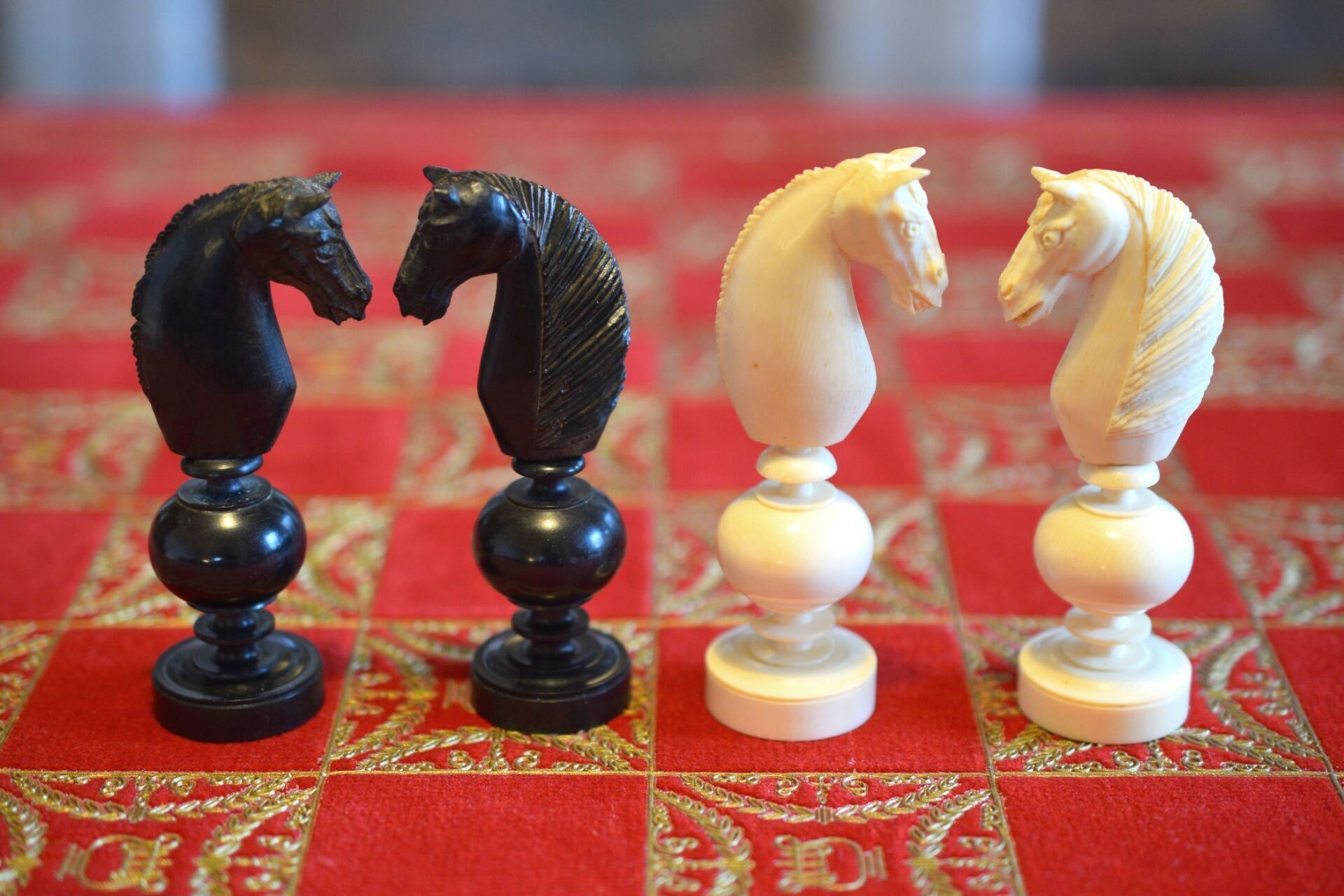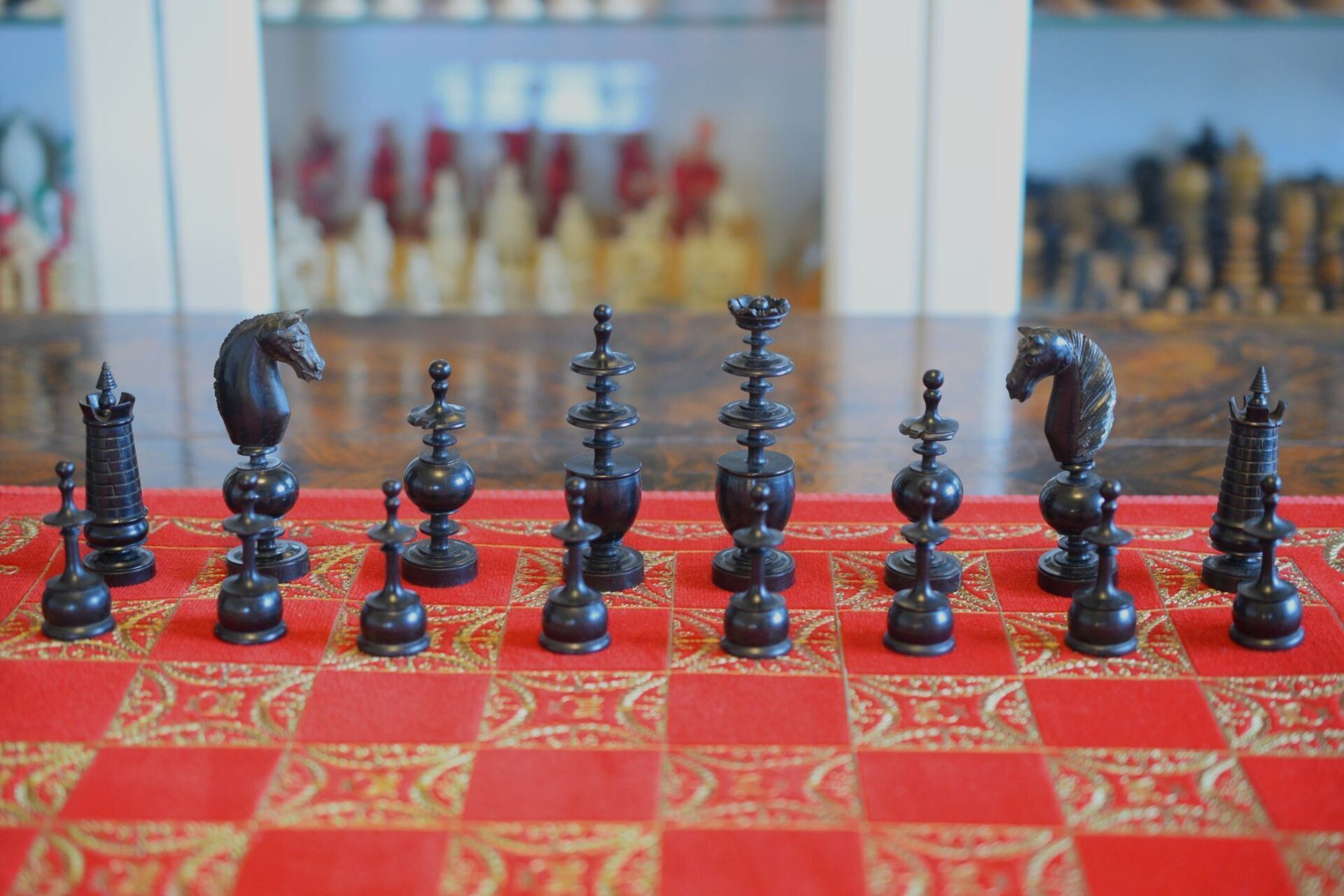 A chess set in the Régence style with a king size of 8.9 cm. The white pieces are turned from ivory, the black pieces from ebony. Judging by the exquisite carving style, the set was probably made in Dieppe, France. While Régence sets were made in France as early as the 18th century, their style evolved over time. The style of the rooks with a spindle finial on top as well as the very detailed carving of the knights' heads are typical for later sets, which makes me believe that this set dates to mid-19th century.